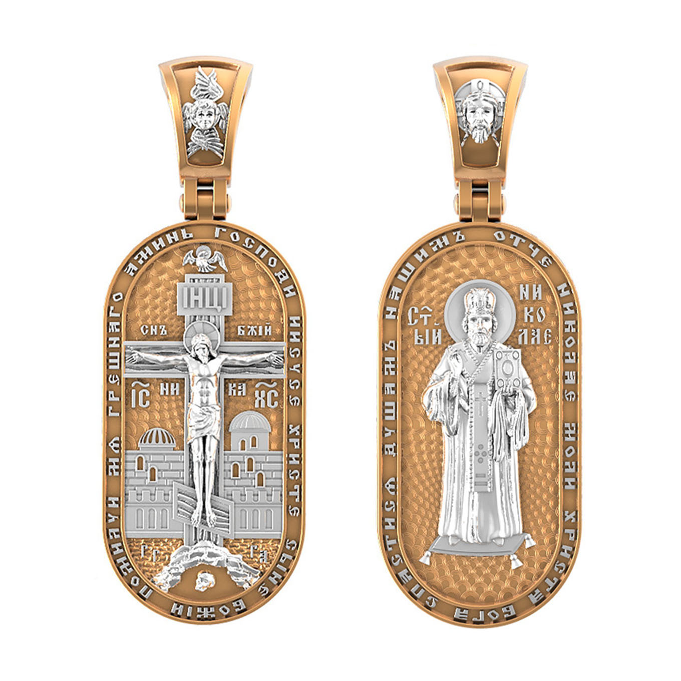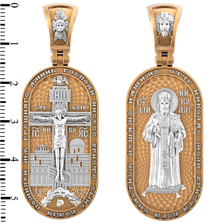 Центральную часть лицевой стороны занимает Распятие Христа — образ жертвы, принесенной Господом за грехи людей. Именно ко Христу, сошедшему на землю ради нашего спасения, возносятся все молитвы. Рядом с Его образом помещены слова — «НИКА» (греч. — Победитель) и «СЫН БОЖИЙ». Эти слова характеризуют Господа как Великого Архиерея, победителя смерти. Также Распятие сопровождается надписями, олицетворяющими Христа — это святое имя Христа «IC» (Иисус) «ХС» (Христос). Верхняя перекладина символизирует собой табличку с надписью «IHЦI» — Иисус Назарянин Царь Иудейский. Возвышение, на котором стоит Крест, символизирует гору Голгофу, на которой произошло Распятие. У подножия Креста изображают прах Адама, обозначенный черепом. На кулонном кольце изображен шестикрылый Серафим — самый приближенный к Господу Ангел. По контуру образка написана молитва: «Господи Иисусе Христе, Сыне Божий, помилуй мя грешного. Аминь»
