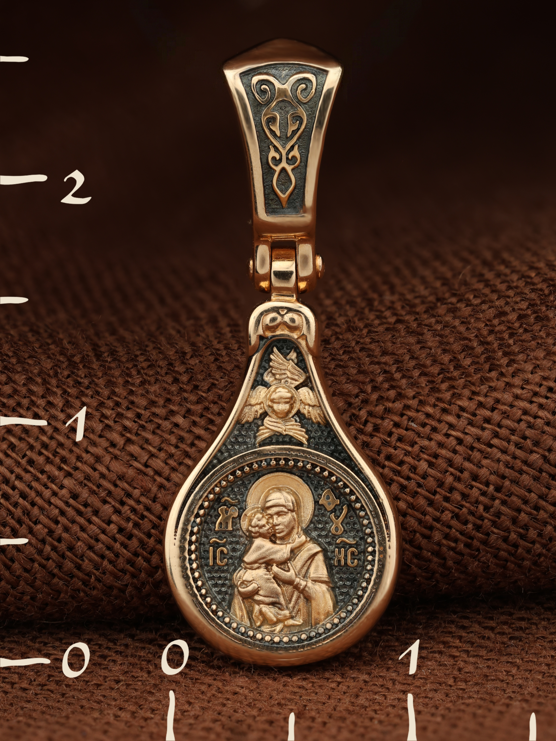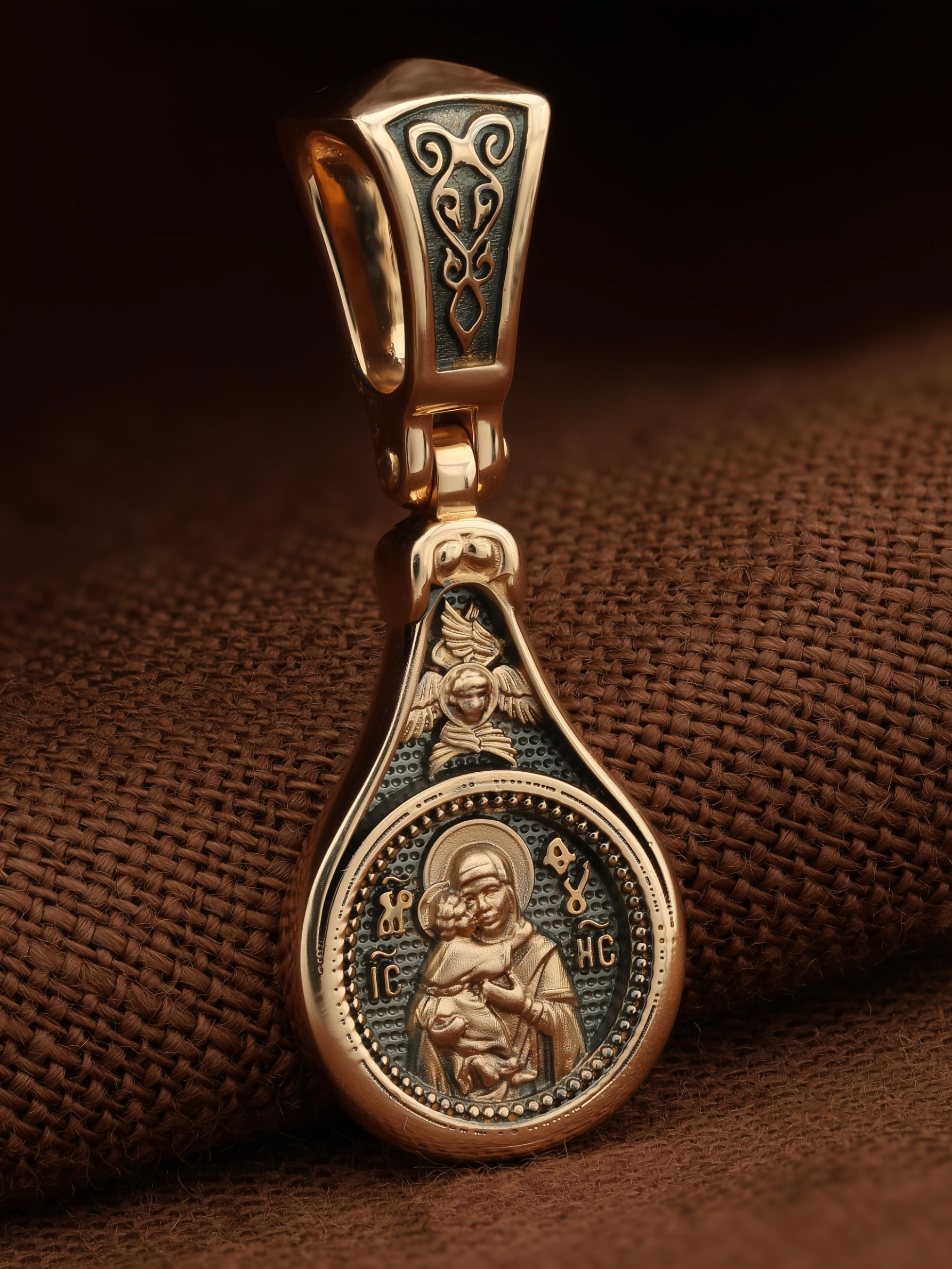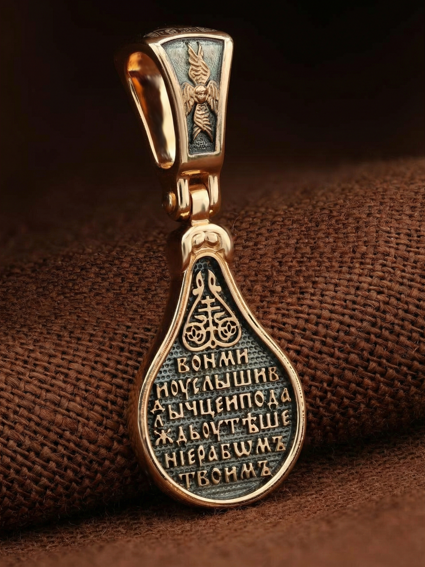 Лицевую сторону образка и кулонное кольцо украшает шестикрылый Серафим — самый приближенный к Господу Ангел.