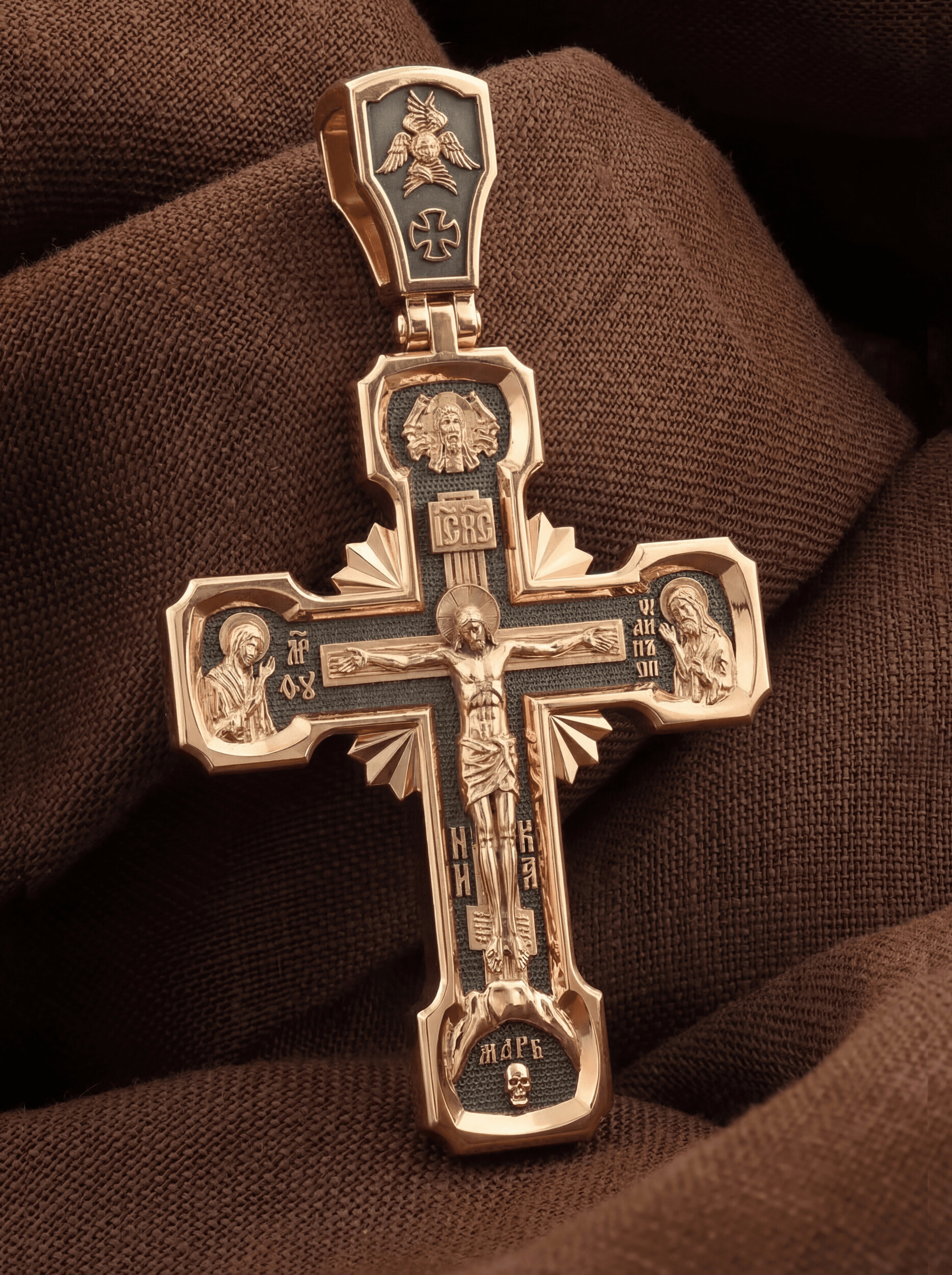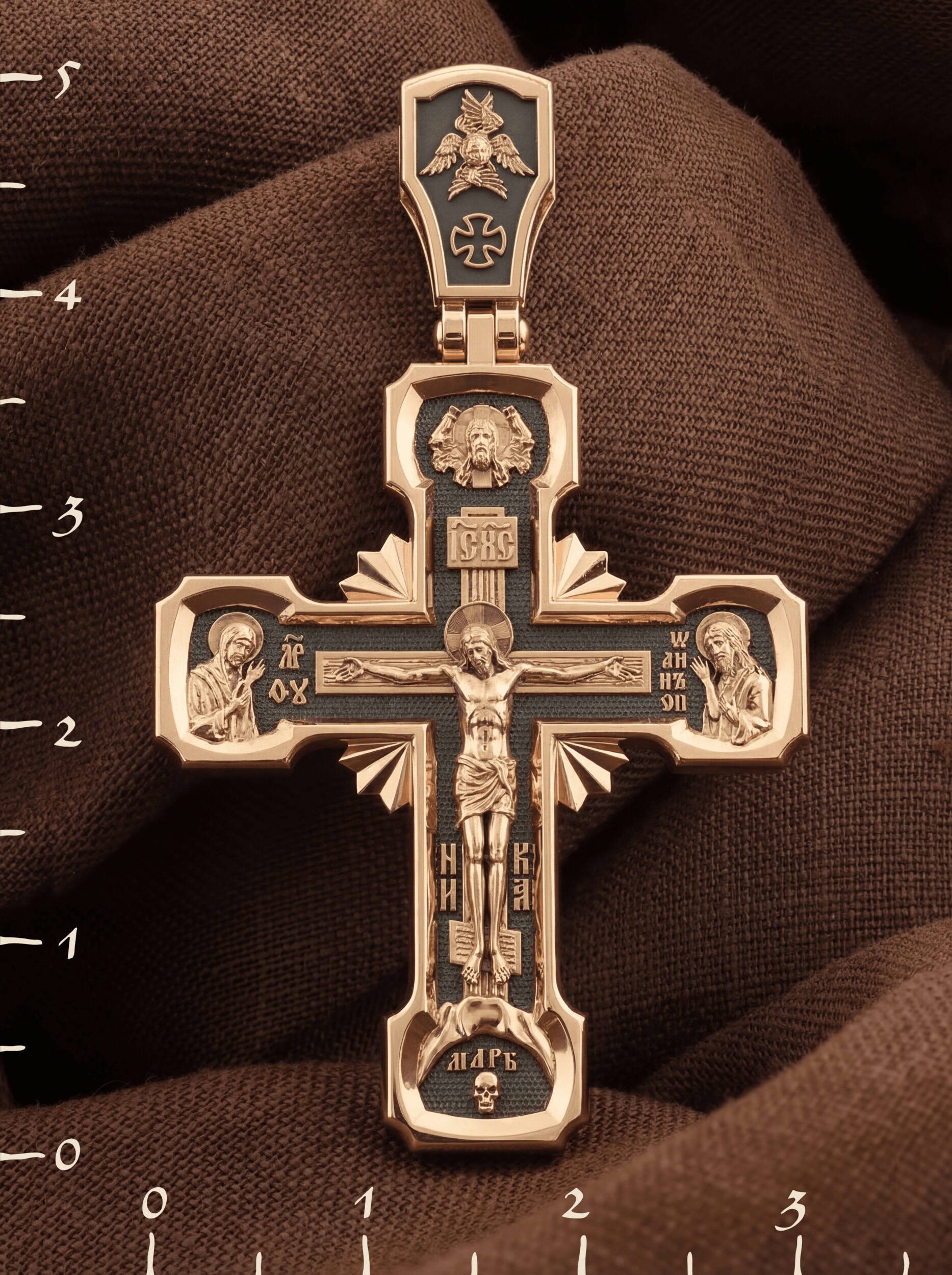 На лицевой стороне креста изображено Распятие Господа Иисуса Христа. С двух сторон Христу предстоят Пресвятая Богородица и св. пророк и Предтеча Господень Иоанн Креститель, которые имеют особое дерзновение перед Богом молиться за всех людей. Иконы, где они изображены молящимися Христу, называются Деисус, что значит «моление».