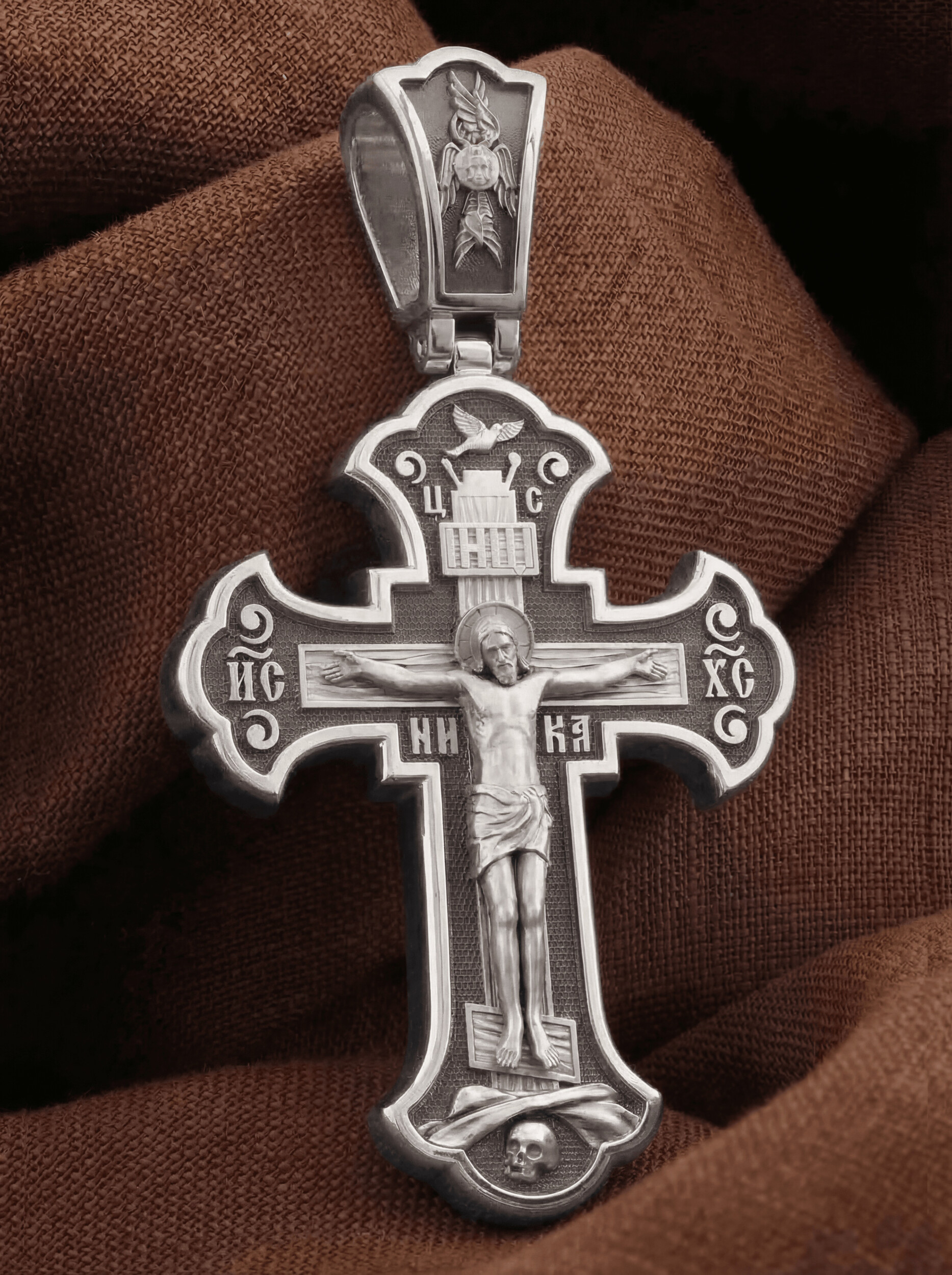 На лицевой стороне этого креста центральную часть занимает икона Распятия Христа — образ жертвы, принесенной Господом за грехи людей. Именно ко Христу, сошедшему на землю ради нашего спасения, возносятся все молитвы. Пресвятая Богородица, ангелы и святые — помощники Господа в деле спасения и заступники за людей перед Богом. «Оружием великим Христовым» именует Церковь крест, потому что, претерпев страдания и умерев, Господь победил смерть и лишил дьявола его власти над миром. Поэтому рядом с титлами Святого имени Христа написано «НИКА», что значит «победитель».