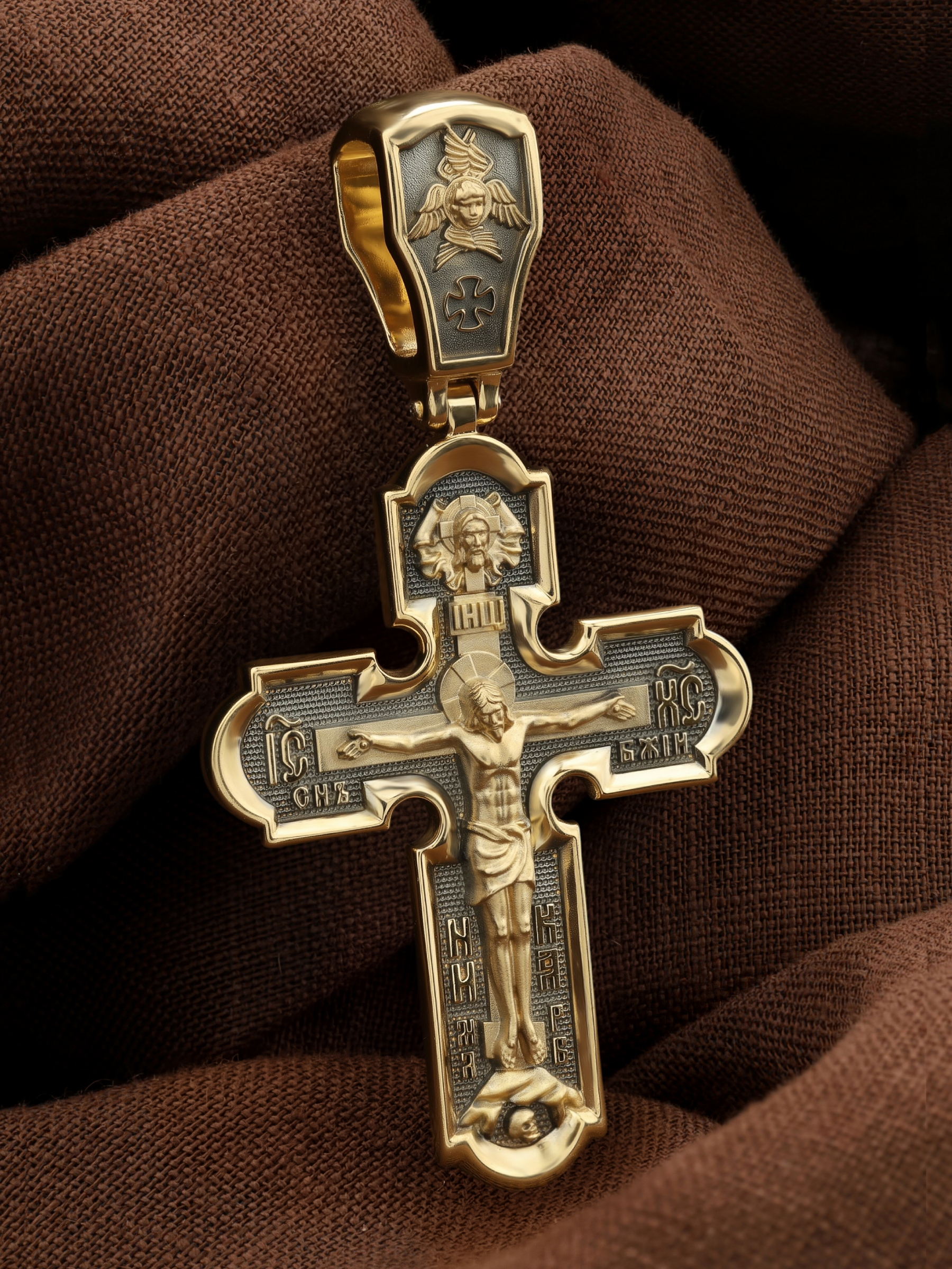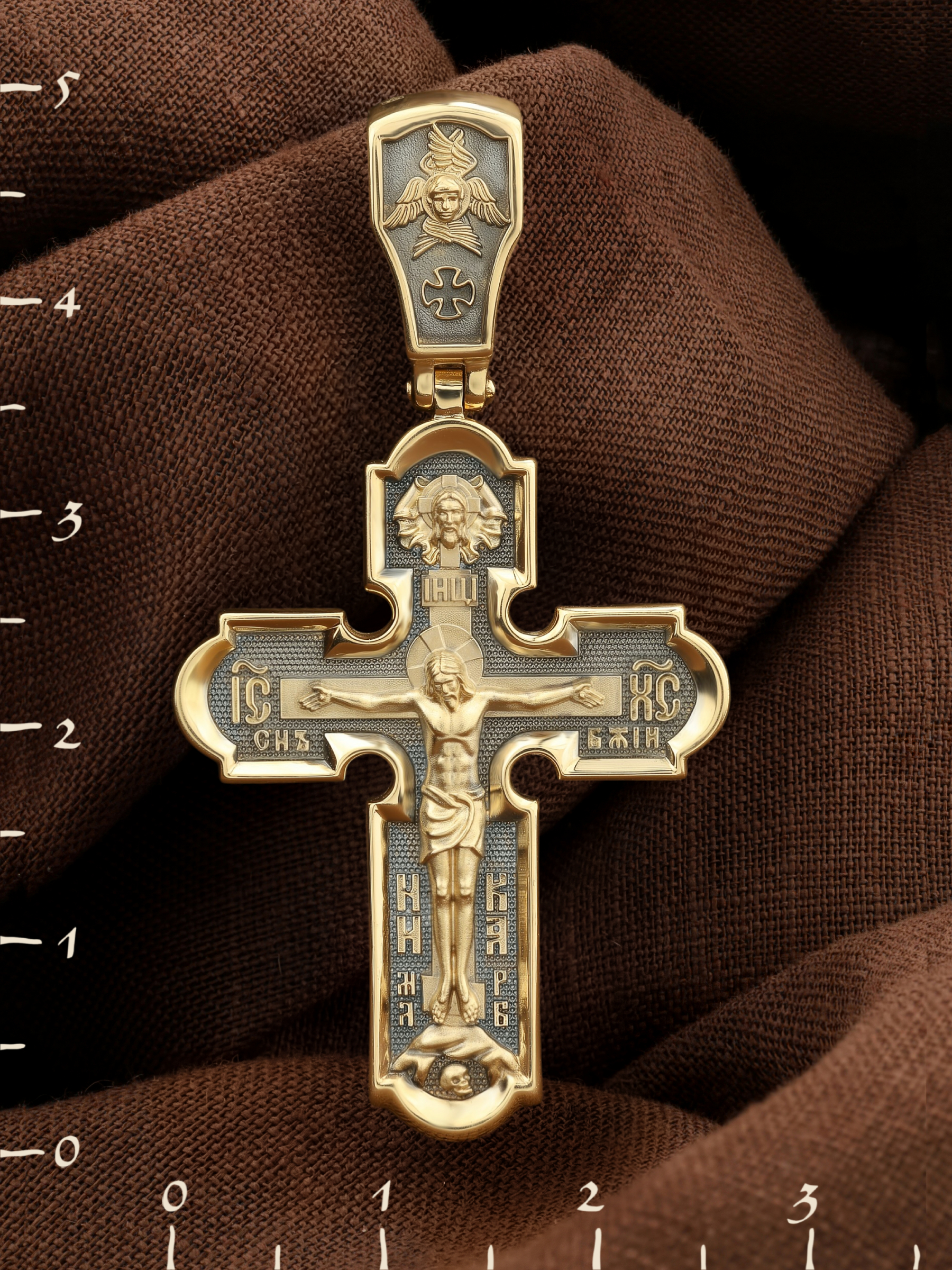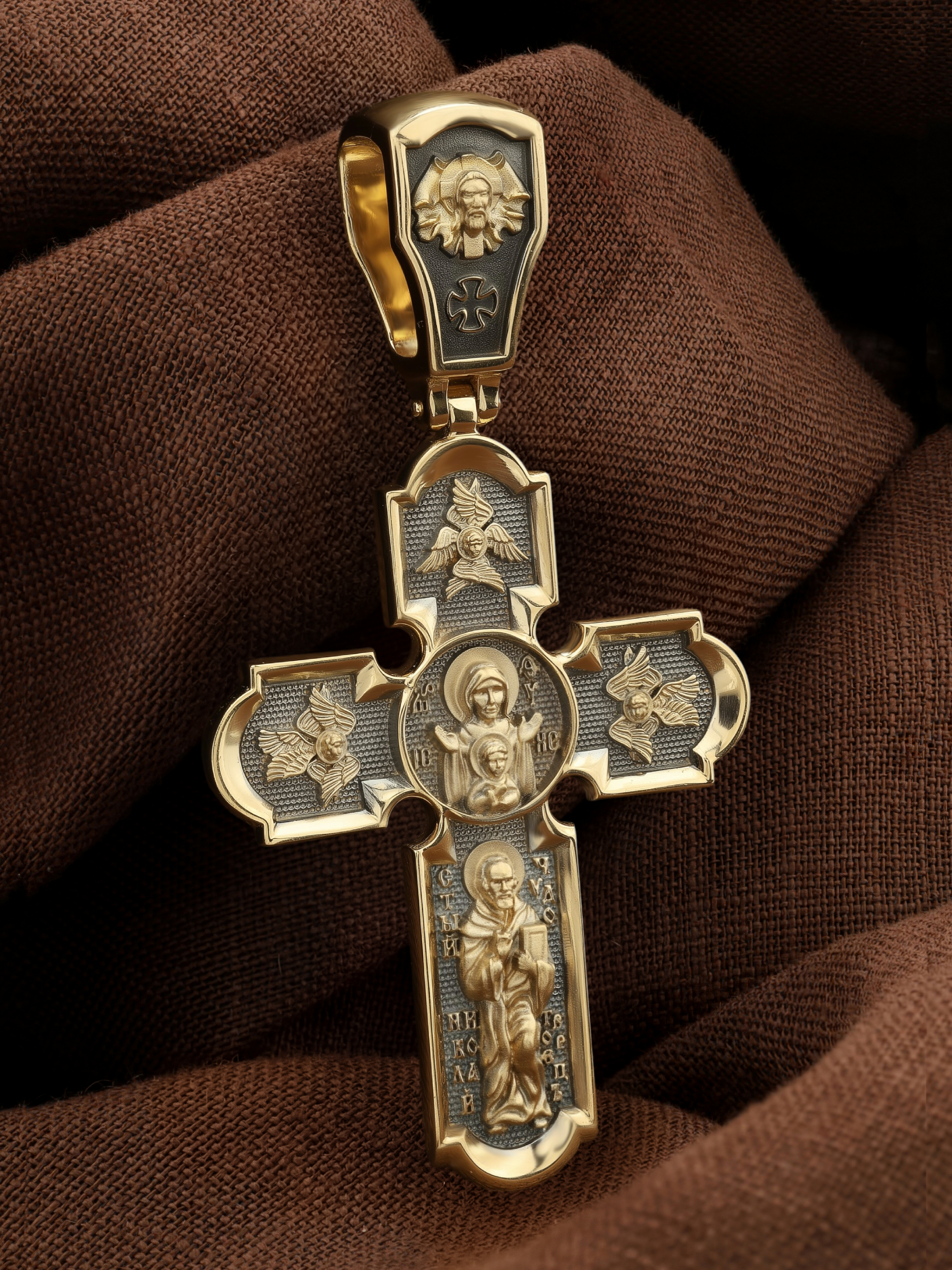 На лицевой стороне нательного креста по традиции изображено Распятие Господа нашего Иисуса Христа. Крест Господень стоит на небольшом каменистом возвышении, символизирующем гору Голгофу, которая обозначена буквами МЛРБ (Место Лобное Рай Бысть). Над головой Господа на поперечной перекладине написано «ИНЦИ», что символизирует табличку, которая была прибита к Кресту, с надписью «Иисус Назорей Царь Иудейский». Этим иудеи хотели посмеяться над Христом, не зная, что распинают истинного Царя всех царей. По сторонам основной перекладины расположены позолоченные рельефные инициалы Христа «ИС ХС». Под перекладиной, по сторонам древа, находится надпись «СЫН БОЖИЙ», а в основании креста — надпись «НИКА» (Победитель).