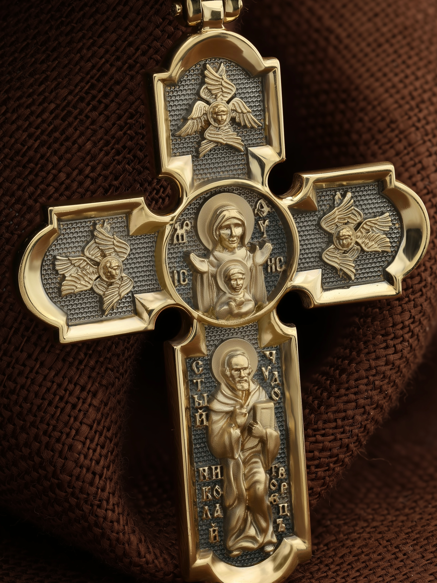 У основания креста в полный рост изображен самый любимый святой Православной Церкви — Николай Чудотворец. Святой почитается как целитель болезней, покровитель путешествующих, особенно по морю, помощник в торговле, учебе, а также в поисках достойного супруга.
