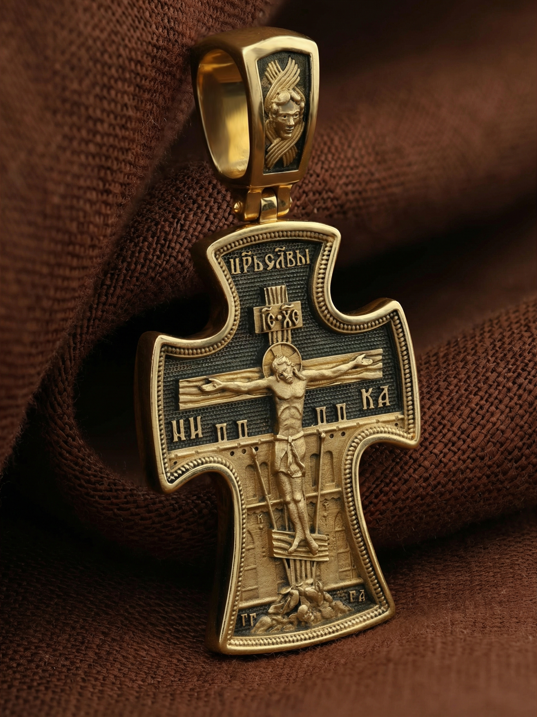 На лицевой стороне креста изображено Распятие, потому что это орудие казни Иисус Христос сделал орудием победы над грехом и смертью. Своими страданиями Он искупил грехи человечества, умерев и сошествовав во ад, победил сатану, освободил души праведников от вечной смерти и открыл им небесные врата рая. Жертва Христа сделала возможным спасение для каждого человека. На православном кресте Христос не умирает, а свободно простирает руки, ладони Иисуса открыты, будто он хочет обнять все человечество, даря им свою любовь и открывая путь к вечной жизни. Над титлом видим слова «ЦРЬ СЛВЫ» — Царь Славы. Верхняя перекладина символизирует собой табличку с надписью «IC XC» — Иисус Христос, ниже перекладины добавляется: «НИКА» (греч. — Победитель). Возвышение, на котором стоит Крест, символизирует гору Голгофу, на которой произошло Распятие. У подножия Креста изображают прах Адама, обозначенный черепом. По сторонам Голгофы начертаны буквы «ГГ» (Гора Голгофа) и «ГА» (голова Адама). Справа и слева от Креста изображены орудия страданий Господа — трость и копие, обозначенные буквами «Т» и «К».