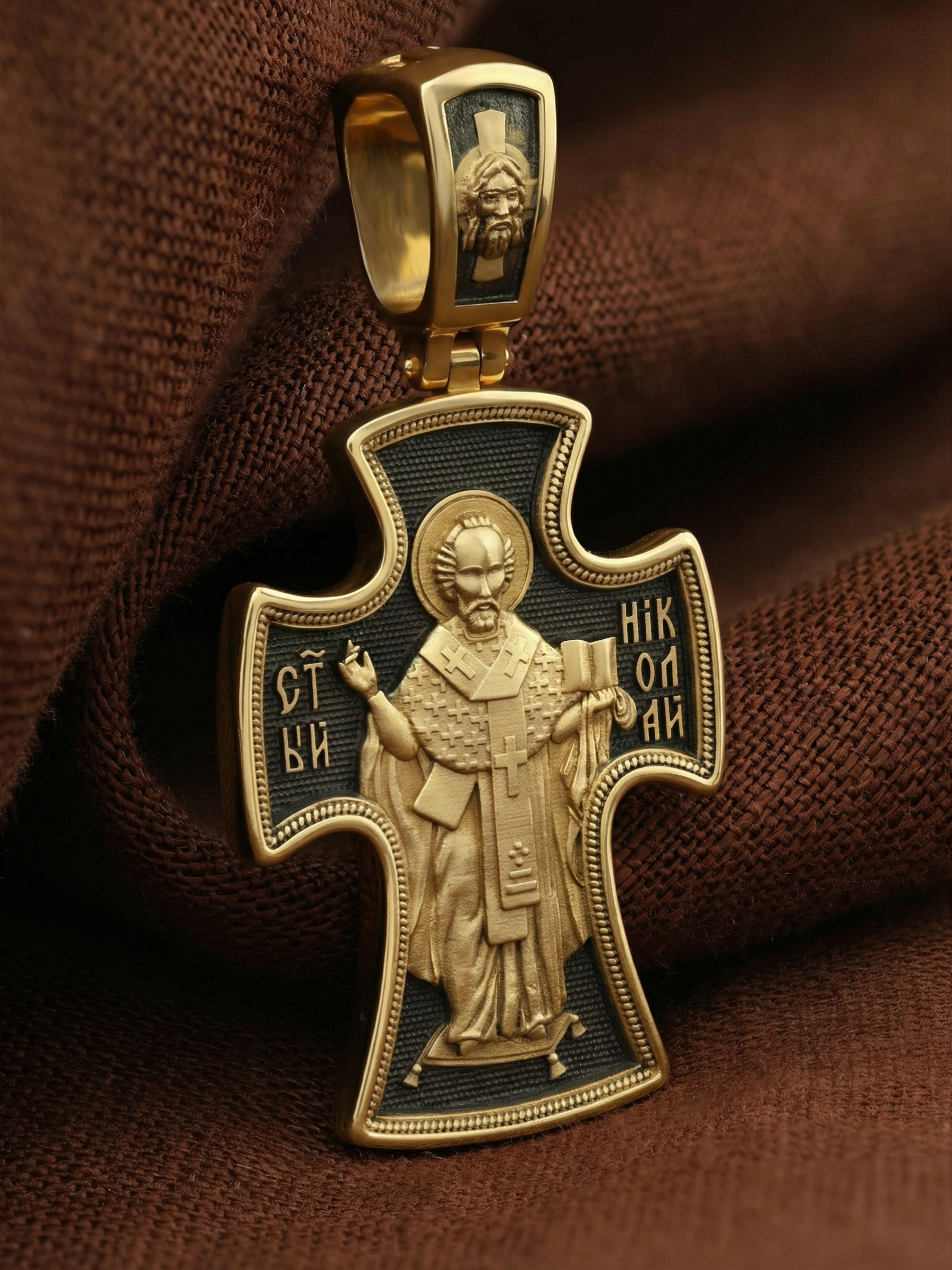 Оборотную сторону креста возглавляет икона святителя Николая Чудотворца, которого еще называют Николай Угодник за то, что он угодил своей жизнью Богу. Николай Чудотворец, помощник в делах, покровитель учащихся, утешитель обиженных. Также Святитель Николай Чудотворец известен своими молитвами за путешественников, когда непрестанный ветер и бушующие волны утихают и корабль заходит в спокойную гавань. На кулонном кольце изображен Спас Нерукотворный — Символ вочеловечившегося Божества и четырехкрылый Херувим.