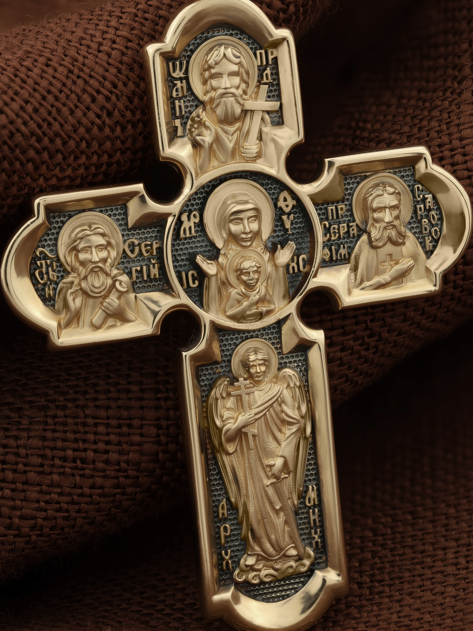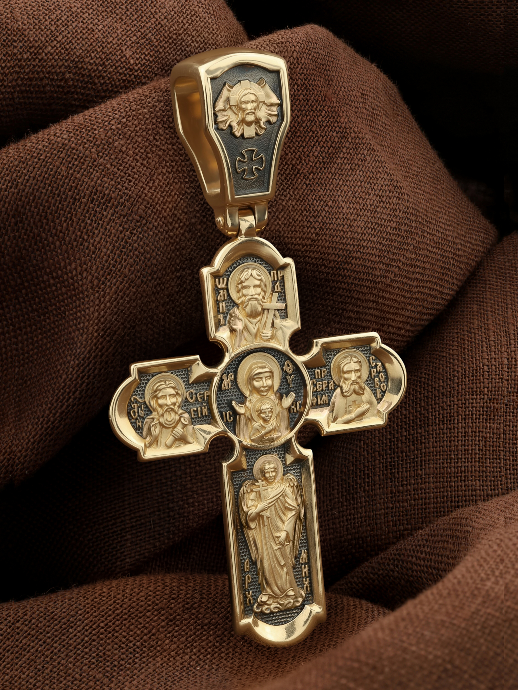 Центральную часть оборотной стороны креста украшает икона Божией Матери «Знамение». Иконы Божией Матери, известные под именем «Знамение», появились на Руси в XI — XII веках, а называться так стали после чудесного знамения от Новгородской иконы, случившегося в 1170 году. Многочисленные списки с иконы Знамения известны по всей России. На кресте внизу изображен Архангел Михаил, слева — Преподобный Сергий Радонежский, справа — Преподобный Серафим Саровский, вверху — Предтеча Господень Иоанн Креститель. На кулонном кольце помещено изображение Спаса Нерукотворного — образ Спасителя, который Он запечатлел на плате и передал для исцеления больному проказой царю Эдессы. Ему придается победное и защитное значение.