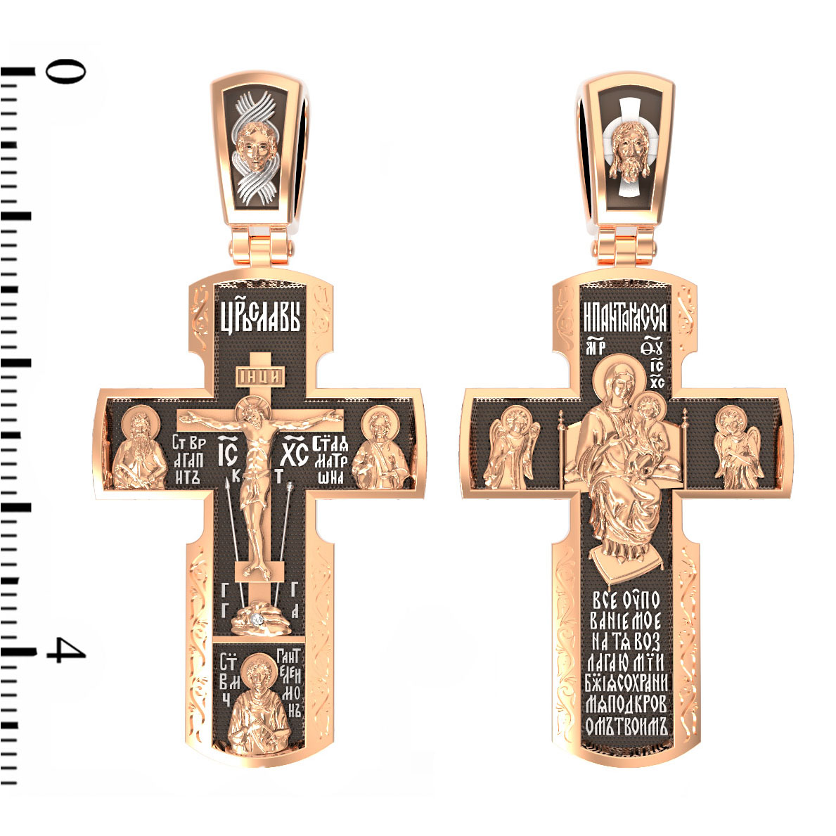 Как действенная помощь в немощах и болезнях был создан крест с образами святых целителей и со знаменитой афонской иконой Божией Матери «Всецарица». Над титлом видим слова «ЦРЬ СЛВЫ» — Царь Славы. Верхняя перекладина символизирует собой табличку с надписью «IHЦI» — Иисус Назарянин Царь Иудейский. Под перекладиной пишется сокращенно имя Спасителя «IC XC» — Иисус Христос. Возвышение, на котором стоит Крест, символизирует гору Голгофу, на которой произошло Распятие. У подножия Креста изображают прах Адама, обозначенный черепом. Справа от Распятия помещен образ прославленной святой блаженной Матроны. Слева — икона преподобный Агапита. Этот святой жил в пещерах Киево-Печерского монастыря в XI веке и бескорыстно врачевал мирян и монахов. У основания Креста Господня изображен великомученик Пантелеимон Целитель. Господь даровал удивительную силу его молитве. Ею он исцелял любые болезни и даже воскрешал умерших.