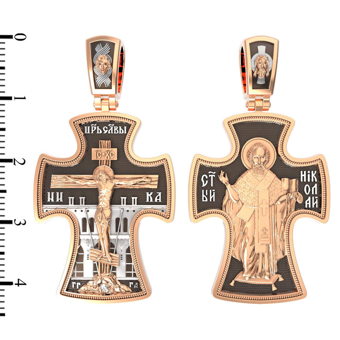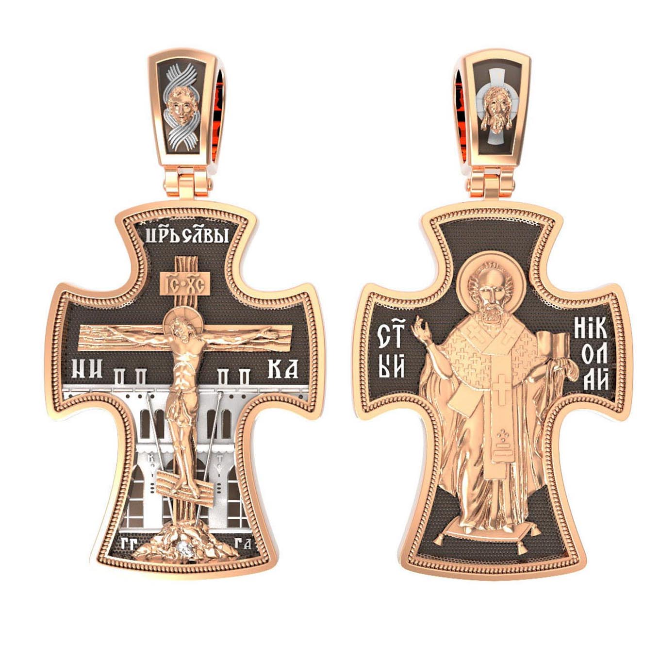 Оборотную сторону креста возглавляет икона святителя Николая Чудотворца, которого еще называют Николай Угодник за то, что он угодил своей жизнью Богу. Николай Чудотворец, помощник в делах, покровитель учащихся, утешитель обиженных. Также Святитель Николай Чудотворец известен своими молитвами за путешественников, когда непрестанный ветер и бушующие волны утихают и корабль заходит в спокойную гавань. На кулонном кольце изображен Спас Нерукотворный — Символ вочеловечившегося Божества и четырехкрылый Херувим.