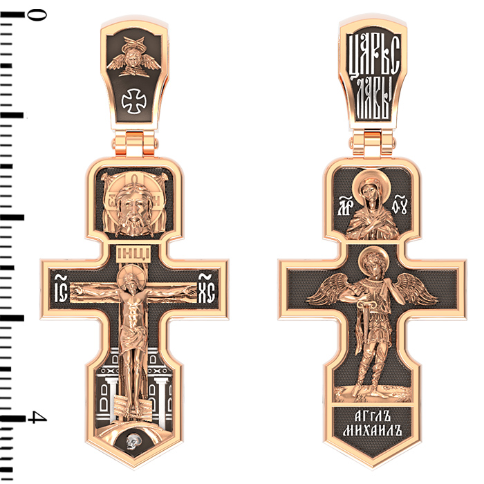Основной композицией лицевой стороны является Распятие Господа Иисуса Христа. Позади Распятия видна иерусалимская стена, знак того, что Господь был распят вне стен города. Но вместе с тем стена символизирует и Небесный Иерусалим, путь который открылся для человека через Голгофу. У подножья Господа в виде скалистой горки видна сама Голгофа с Главой Адамовой в пещере. Распятие сопровождается каноническими надписями. Это святое имя Христа, которое принято писать на иконах сокращенно — «ИС ХС», словосочетание «СЫН БОЖИЙ», что означает божественную природу Иисуса Христа, и надпись «НИКА» — «победитель». Над Распятием помещено изображение Спаса Нерукотворного — образ Спасителя, который Он запечатлел на плате и передал для исцеления больному проказой царю Эдессы.
