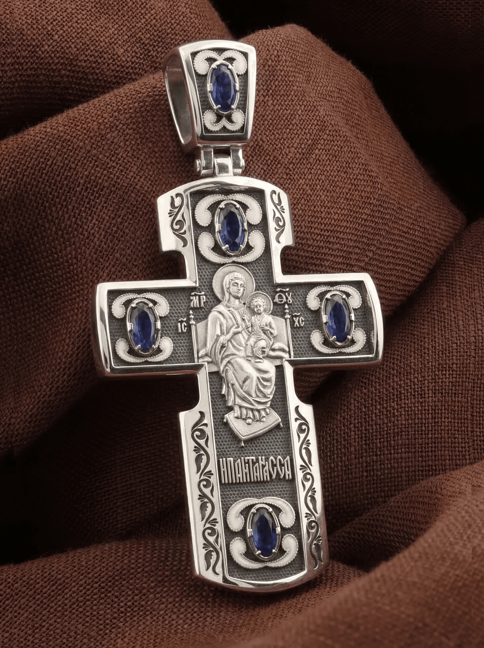 На оборотной стороне креста изображена икона Божией Матери «Всецарица» или «Пантанасса», на которой Пресвятая Богородица восседает на царском троне. На руках Ее — Богомладенец Христос со свитком в левой руке и благословляющий десницей. Правой рукой Богородица указывает на Своего Царственного Сына, как на Спасителя мира. Чудотворная икона была написана в XVII веке и находится на Святой Горе Афон, в одном из древних греческих монастырей — Ватопеде. По молитвам перед иконой совершается множество чудесных исцелений. Пречистая Богородица наставляет на праведный путь, помогает укрепить веру, найти утешение.