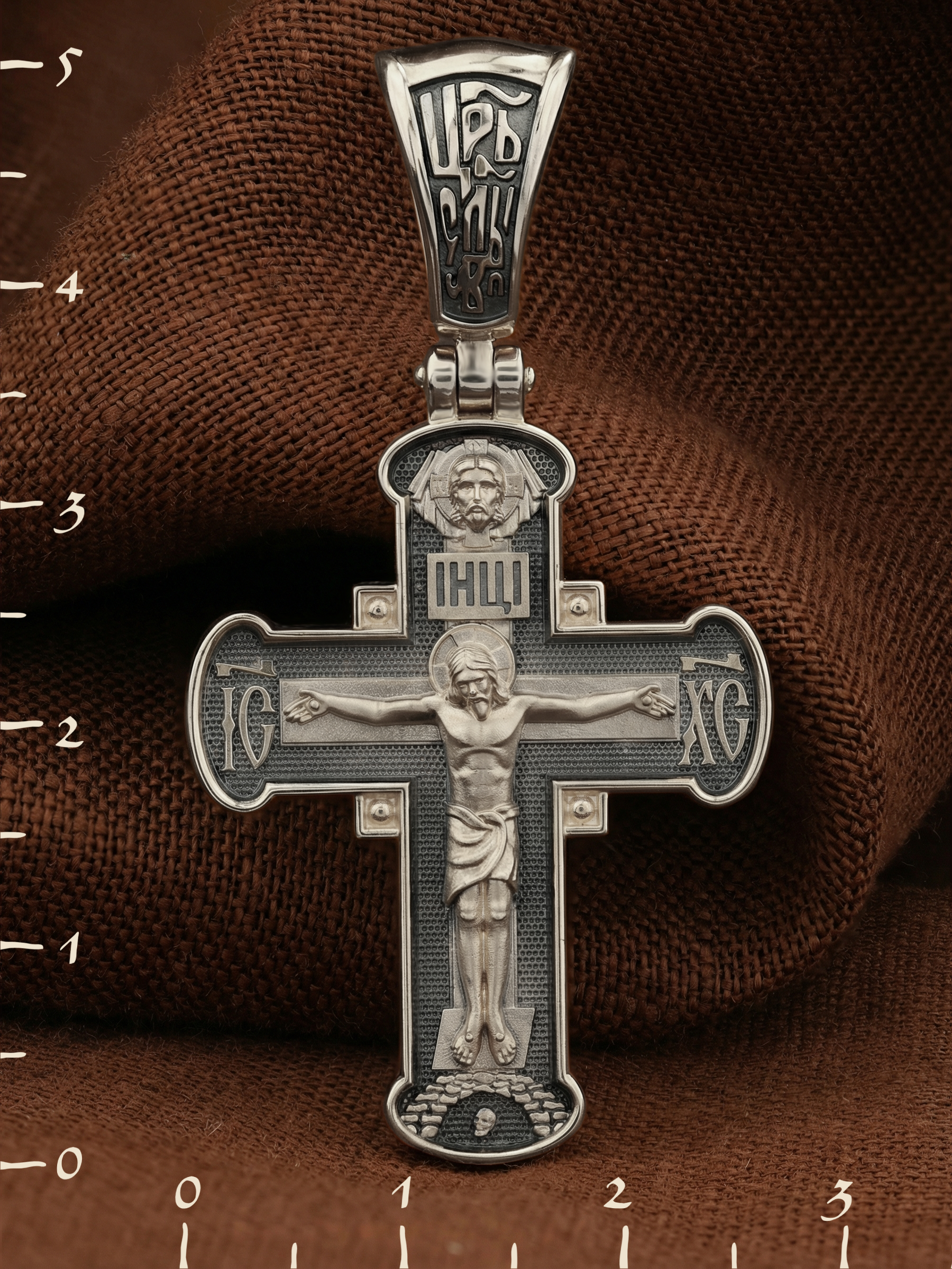 На лицевой стороне креста изображено Распятие Господа и Спасителя нашего Иисуса Христа, отдавшего Себя на смерть, для искупления грехов мира. Крест является символом жертвенной любви Всеблагого Бога к падшим людям, всепобеждающим духовным оружием христиан, основанием и средоточием церковной жизни. Господь сказал: «кто хочет идти за Мною, отвергнись себя, и возьми крест свой, и следуй за Мною». (Мк. 8: 34). На кулонном кольце помещена надпись «Царь Славы». На верхней табличке, выше головы Иисуса, расположена надпись, составленная Понтием Пилатом — «IНЦI». Она означает «Иисус Назорей, Царь Иудейский». Над ней — Нерукотворный образ Господа и Спасителя нашего Иисуса Христа, чудесно отпечатавшийся на плате, котором Христос вытер свой лик. Надпись «IC» «ХC», означает Иисус Христос, помещается на разных сторонах поперечной перекладины креста. Крест стоит на горе камней, символизирующих Голгофу. В ее основании различается череп– это голова Адама.