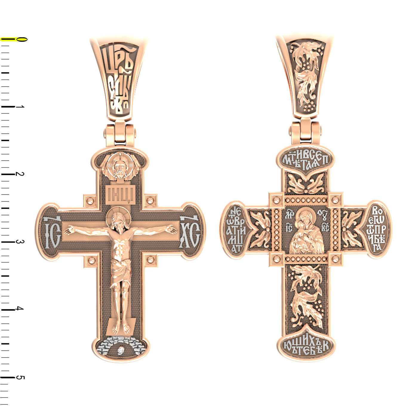 На лицевой стороне креста изображено Распятие Господа и Спасителя нашего Иисуса Христа, отдавшего Себя на смерть, для искупления грехов мира. Крест является символом жертвенной любви Всеблагого Бога к падшим людям, всепобеждающим духовным оружием христиан, основанием и средоточием церковной жизни. Господь сказал: «кто хочет идти за Мною, отвергнись себя, и возьми крест свой, и следуй за Мною». (Мк. 8: 34). На кулонном кольце помещена надпись «Царь Славы». На верхней табличке, выше головы Иисуса, расположена надпись, составленная Понтием Пилатом — «IНЦI». Она означает «Иисус Назорей, Царь Иудейский». Над ней — Нерукотворный образ Господа и Спасителя нашего Иисуса Христа, чудесно отпечатавшийся на плате, котором Христос вытер свой лик. Надпись «IC» «ХC», означает Иисус Христос, помещается на разных сторонах поперечной перекладины креста. Крест стоит на горе камней, символизирующих Голгофу. В ее основании различается череп– это голова Адама.