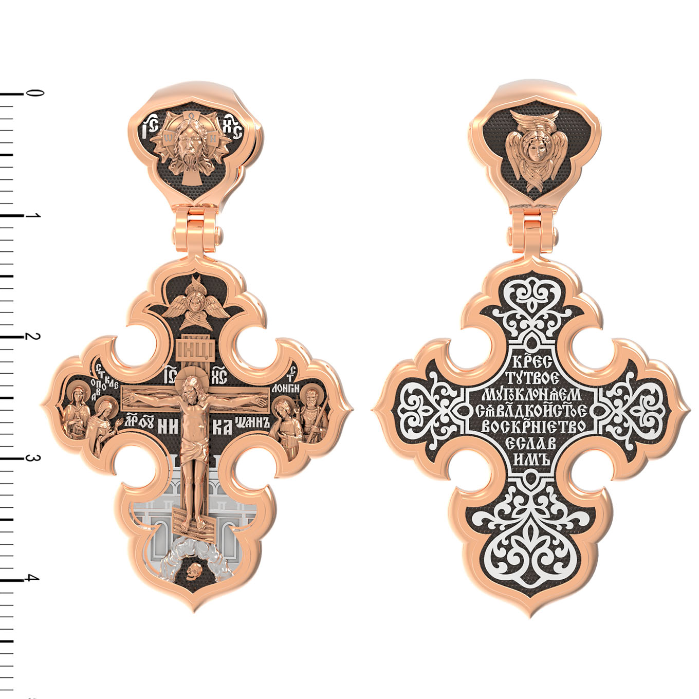 На лицевой стороне креста изображено Распятие Господа и Спасителя нашего Иисуса Христа. Своими крестными страданиями Господь смыл наши грехи, покрыл наш долг перед Богом или, на языке Писания, нас «искупил». В Голгофе сокрыта непостижимая тайна бесконечной правды и любви Бога. Крест стал символом победы добра над злом, жизни над смертью, напоминанием бесконечной Божьей любви, предметом радости. Воплотившийся Сын Божий Своею кровью освятил крест и сделал его проводником Своей благодати, источником освящения верующих. На верхней табличке, выше головы Иисуса, расположена надпись, составленная Понтием Пилатом — «IНЦI». Она означает «Иисус Назорей, Царь Иудейский». Ниже перекладины написано сокращенно имя Спасителя «IC» «XC» — Иисус Христос. Крест стоит на горе камней, символизирующих Голгофу. Под подножием Креста изображена покоящаяся голова (череп) Адама. Слева от Распятия стоят оплакивающие Господа Пресвятая Богородица и святая мироносица Мария Клеопова. Справа — апостол и евангелист Иоанн Богослов, один из ближайших учеников Иисуса Христа и сотник Лонгин с крестом в правой руке и копьем — в левой. По преданию, увидя, что они горько плачут, Иисус сказал Матери Своей: «Жено! Се сын Твой!» Потом сказал ученику Иоанну: «Се мати твоя». С этого времени Иоанн взял Матерь Божию к себе, и Она жила в его доме до самой смерти. На кулонном кольце изображен Спас Нерукотворный — образ Господа и Спасителя нашего Иисуса Христа, чудесно отпечатавшийся на плате, которым Христос вытер свой лик.