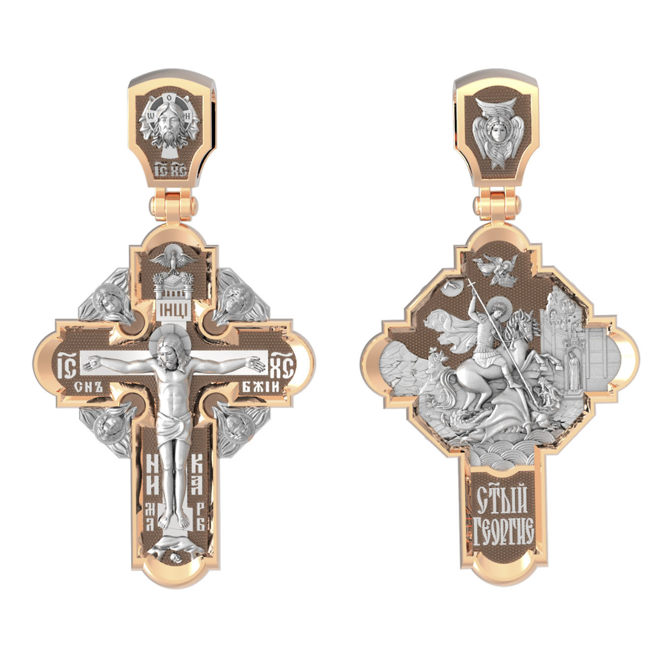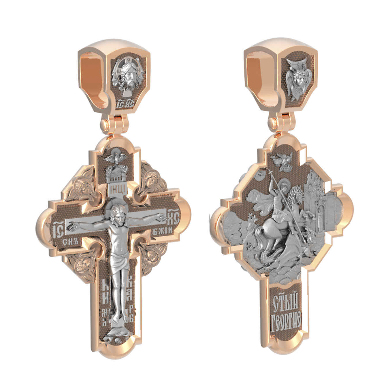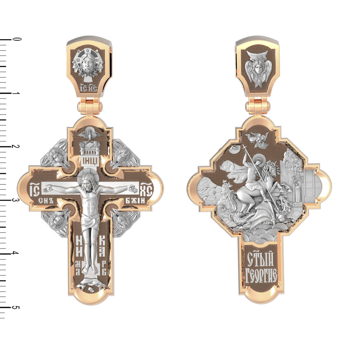 На оборотной стороне креста помещено изображение Святого Великомученика Георгия Победоносца — одного из самых почитаемых и удивительных святых. Георгий родился в Каппадокии (Малая Азия) в семье богатых и знатных горожан. Юношей поступил на службу к римскому императору Диоклетиану, за отличное знание военного дела и проявленную в боях и походах храбрость был приближен к императору и удостоен высокого воинского звания. Во время начавшихся гонений на христиан, перешел на сторону гонимых и, отвергнув человеческий страх, стал ярым проповедником учения Христа. Мучители подвергли опального воеводу жесточайшим восьмидневным пыткам и казнили его (обезглавили) в возрасте около тридцати лет в 303 году. Георгий изображен как воитель, сидящий на вздыбленном коне и поражающий копьем огнедышащего змея. Слева над образом изображена благословляющая Божия десница. Над святым изображен ангел возлагающий на него венец мученика. Змей символизирует собою сатанинские силы. Молитвами вознесенными к Всевышнему и своей непреклонной верой он смог одолеть чудовище. Святой убил змея, спас царскую дочь, принесенную в жертву, и жителей города, их души от влияния дьявола, породив в них надежду и веру в Господа, призывая людей принять христианскую веру. На кулонном кольце изображен шестикрылый Ангел — Серафим.