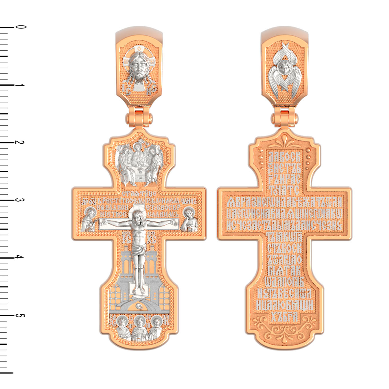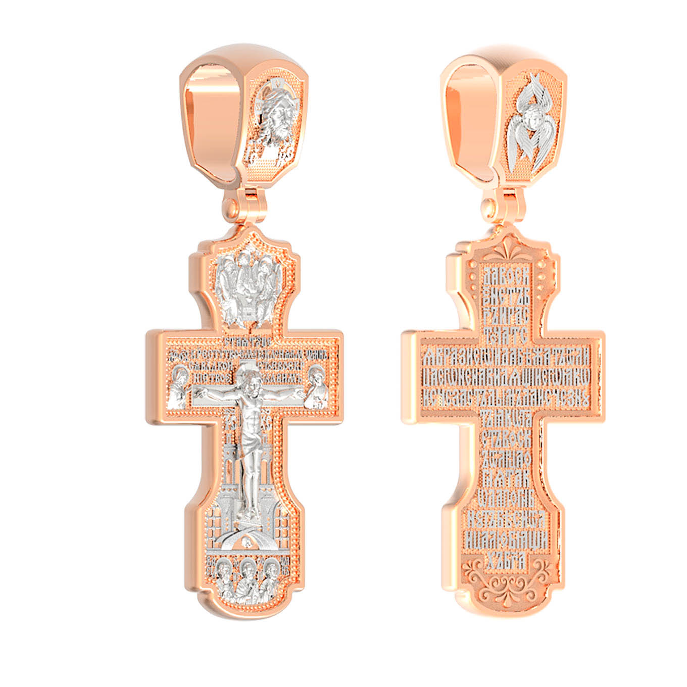 На лицевой стороне креста изображено Распятие Господа и Спасителя нашего Иисуса Христа, отдавшего Себя на смерть, для искупления грехов мира. Крест является символом жертвенной любви Всеблагого Бога к падшим людям, всепобеждающим духовным оружием христиан, основанием и средоточием церковной жизни. Господь сказал: «кто хочет идти за Мною, отвергнись себя, и возьми крест свой, и следуй за Мною». (Мк. 8: 34). Выше Распятия помещены слова молитвы:"Кресту Твоему поклоняемся, Владыко, и святое Воскресение Твое Славим». Над Распятием — образ Святой Троицы в виде трех ангелов. Надпись «IС» « ХС» означает Иисус Христос и находится ниже поперечной перекладины креста. Слева от Распятия изображена Пресвятая Богородица. Справа — апостол и евангелист Иоанн Богослов, один из ближайших учеников Иисуса Христа. За крестом высится Иерусалимская стена. Крест стоит на горе камней, символизирующих Голгофу. В ее основании различается череп — это голова Адама. Ниже распятия изображены отцы Церкви — Святители Василий Великий, Григорий Богослов и Иоанн Златоуст. На православном кресте Христос не умирает, а свободно простирает руки, ладони Иисуса открыты, будто он хочет обнять все человечество, даря им свою любовь и открывая путь к вечной жизни. На кулонном кольце изображен Нерукотворный образ Господа и Спасителя нашего Иисуса Христа, чудесно отпечатавшийся на плате, которым Христос вытер свой лик.
