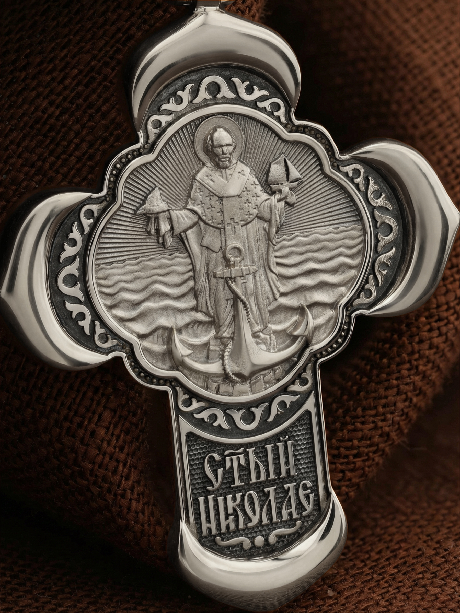 На оборотной стороне креста изображена икона Святителя Николая архиепископа Мир Ликийских, Чудотворца. В правой руке Святителя Николая изображен мыс Горн, а в левой — корабль. Он стоит на возвышенности среди бушующих волн и впереди изображен большой якорь. Эта икона была написана путешественником и священником Фёдором Конюховым. Во время одного из своих кругосветных путешествий, проходя пролив Дрейка, Фёдор, понимая, что выжить в такой бушующей стихии невозможно, стал молиться Святителю Николаю Чудотворцу. Он мысленно пообещал себе: «если пройду мыс Горн, то построю часовню Николаю Чудотворцу»… И в следующий миг, совсем неожиданно — волны утихли. Яхта Конюхова благополучно прошла опасный участок пути. Вернувшись домой, Фёдор Конюхов построил часовню в благодарность за свое спасение. Святитель Николай является одним из самых известных на Руси святых, издревле считающийся помощником и молитвенником за всех, притекающих к нему. Николай Чудотворец подавал многим исцеления в болезнях и телесных недугах, обогащал бедствующих в крайней нищете, подавал голодным пищу, спасал от потопления, освобождал из плена и избавлял от смерти. Чудес его исчислить невозможно.