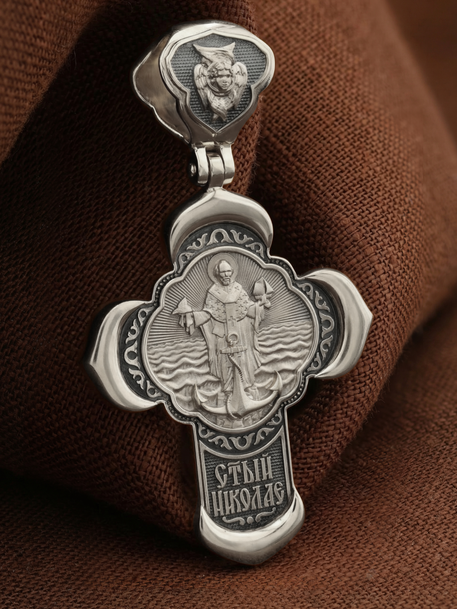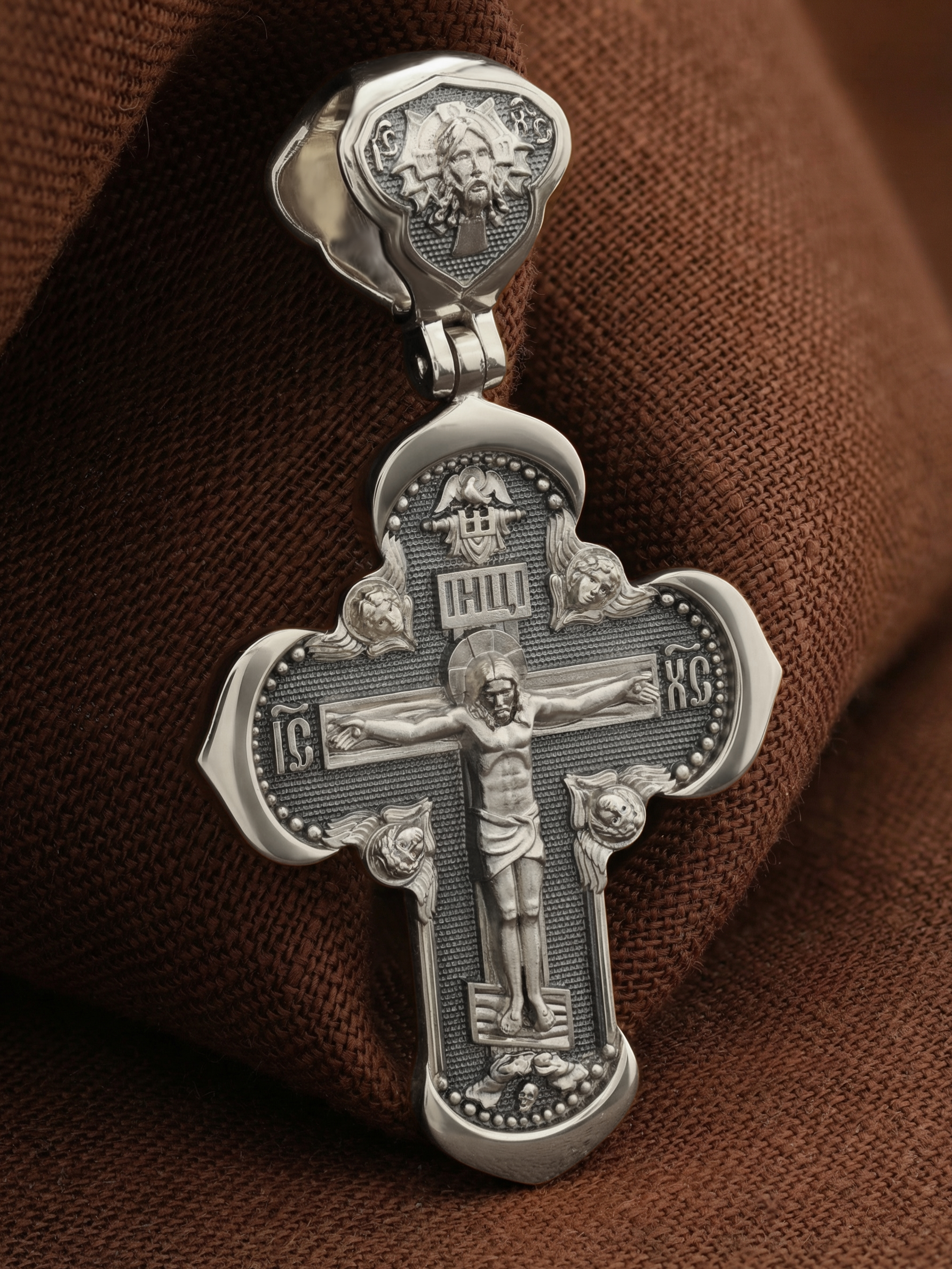 На лицевой стороне креста изображено Распятие Господа и Спасителя нашего Иисуса Христа, отдавшего Себя на смерть, для искупления грехов мира. Крест является символом жертвенной любви Всеблагого Бога к падшим людям, всепобеждающим духовным оружием христиан, основанием и средоточием церковной жизни. Господь сказал: «кто хочет идти за Мною, отвергнись себя, и возьми крест свой, и следуй за Мною». (Мк. 8: 34). На верхней табличке, выше головы Иисуса, расположена надпись, составленная Понтием Пилатом — «IНЦI». Она означает «Иисус Назорей, Царь Иудейский». Надпись «IC» «ХC», означает Иисус Христос, помещается на разных сторонах поперечной перекладины креста. Крест стоит на горе камней, символизирующих Голгофу. В ее основании различается череп– это голова Адама. На кулонном кольце изображен Нерукотворный образ Господа и Спасителя нашего Иисуса Христа, чудесно отпечатавшийся на плате, которым Христос вытер свой лик.