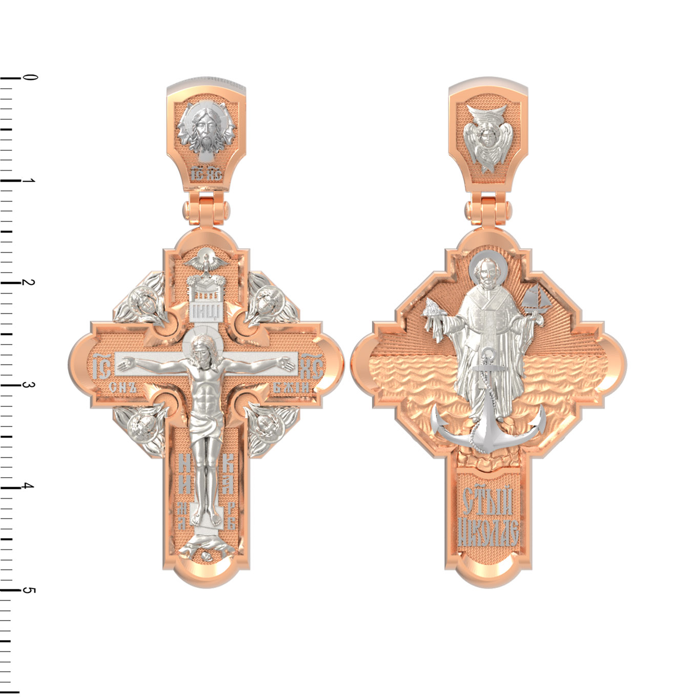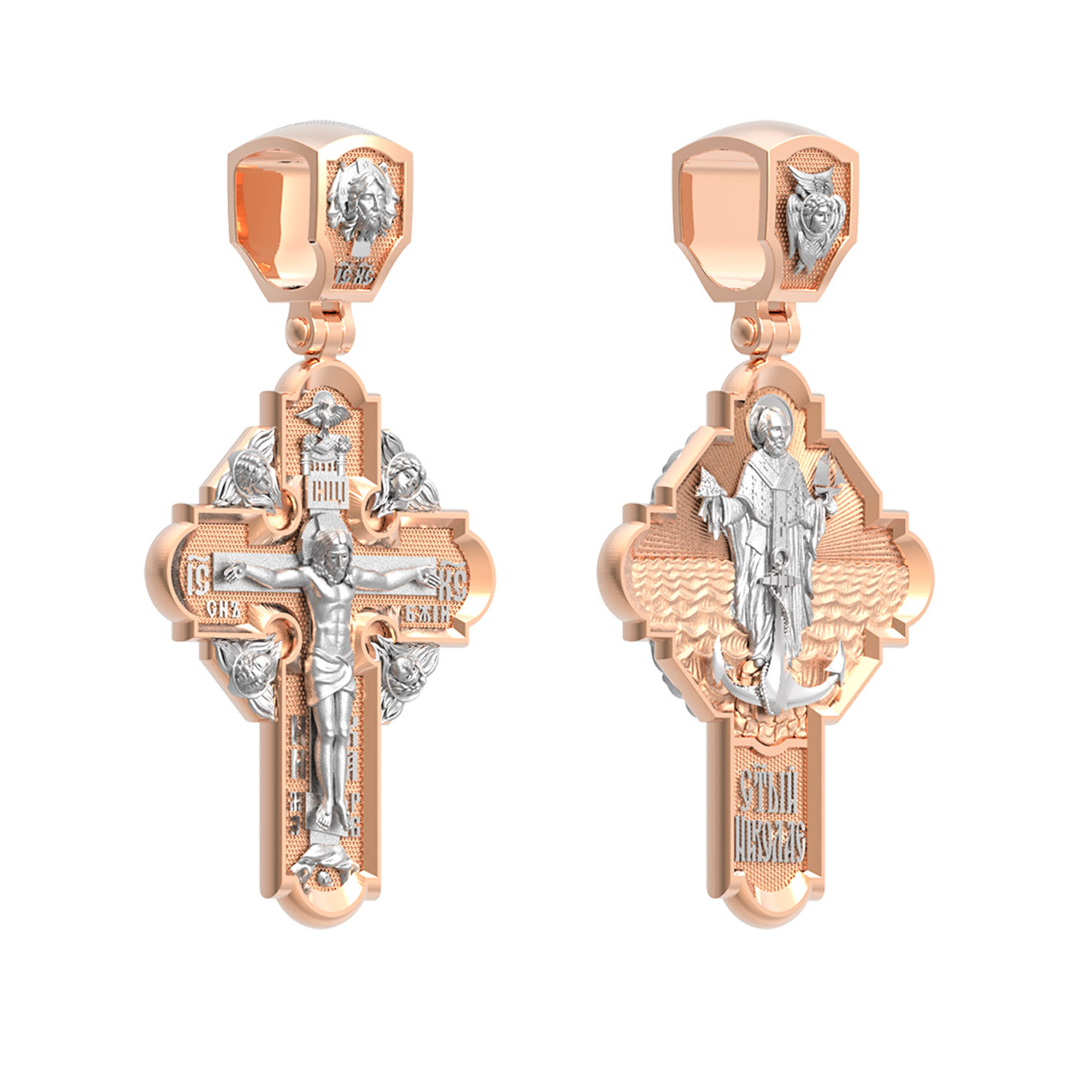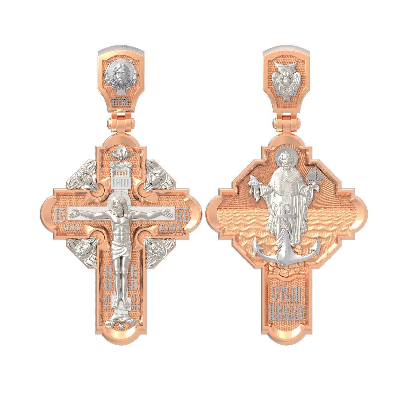 На лицевой стороне креста изображено Распятие Господа и Спасителя нашего Иисуса Христа, отдавшего Себя на смерть, чтобы другие могли жить — жить вечной жизнью, жить с Богом. Своею кровью Господь освятил крест и сделал его проводником Своей благодати, источником освящения верующих. На верхней табличке, выше головы Иисуса, расположена надпись, составленная Понтием Пилатом — «ИНЦИ». Она означает «Иисус Назорей, Царь Иудейский». Надпись «IС ХС» означает Иисус Христос помещается на разных сторонах поперечной (большой) перекладины креста. На кулонном кольце помещено изображение Духа Святого в виде голубя, сходящего с Небес
