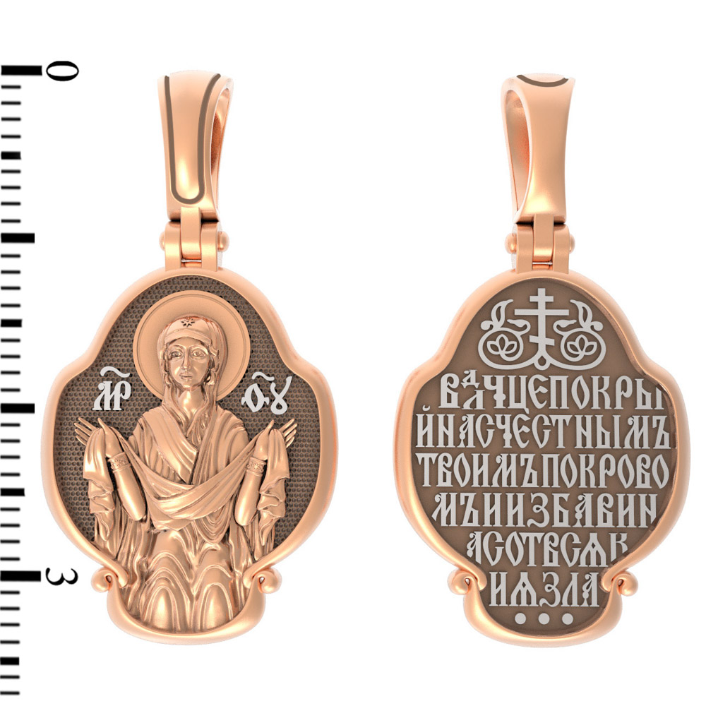 На лицевой части образка изображена икона Покров Пресвятой Богородицы. Праздник Покрова Божией Матери является воспоминанием чуда, которое произошло во Влахнернской церкви 1 (14) октября 910 года: Пресвятая Богородица явилась верующим над алтарем храма и распростерла над ними Свое покрывало. В этот день Божья Матерь открыла людям, что Она является Ходатаицей за них перед Богом. Богородица простирает Свой молитвенный покров над всеми православными христианами и умоляет Сына Своего о даровании вечного спасения каждому человеку.