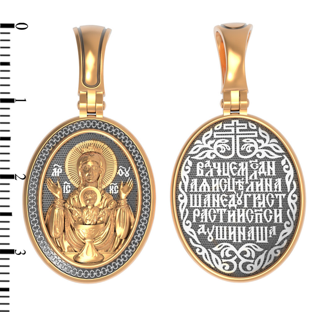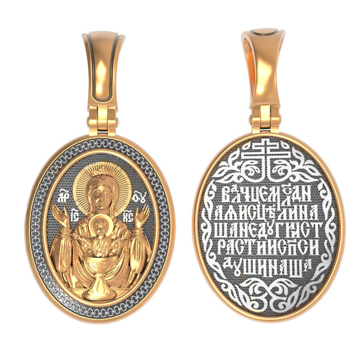 На лицевой части образка изображена икона Божией Матери «Неупиваемая чаша». Икона славится помощью в исцелении зависимостей, помогает людям обрести свободу от греховных страстей.