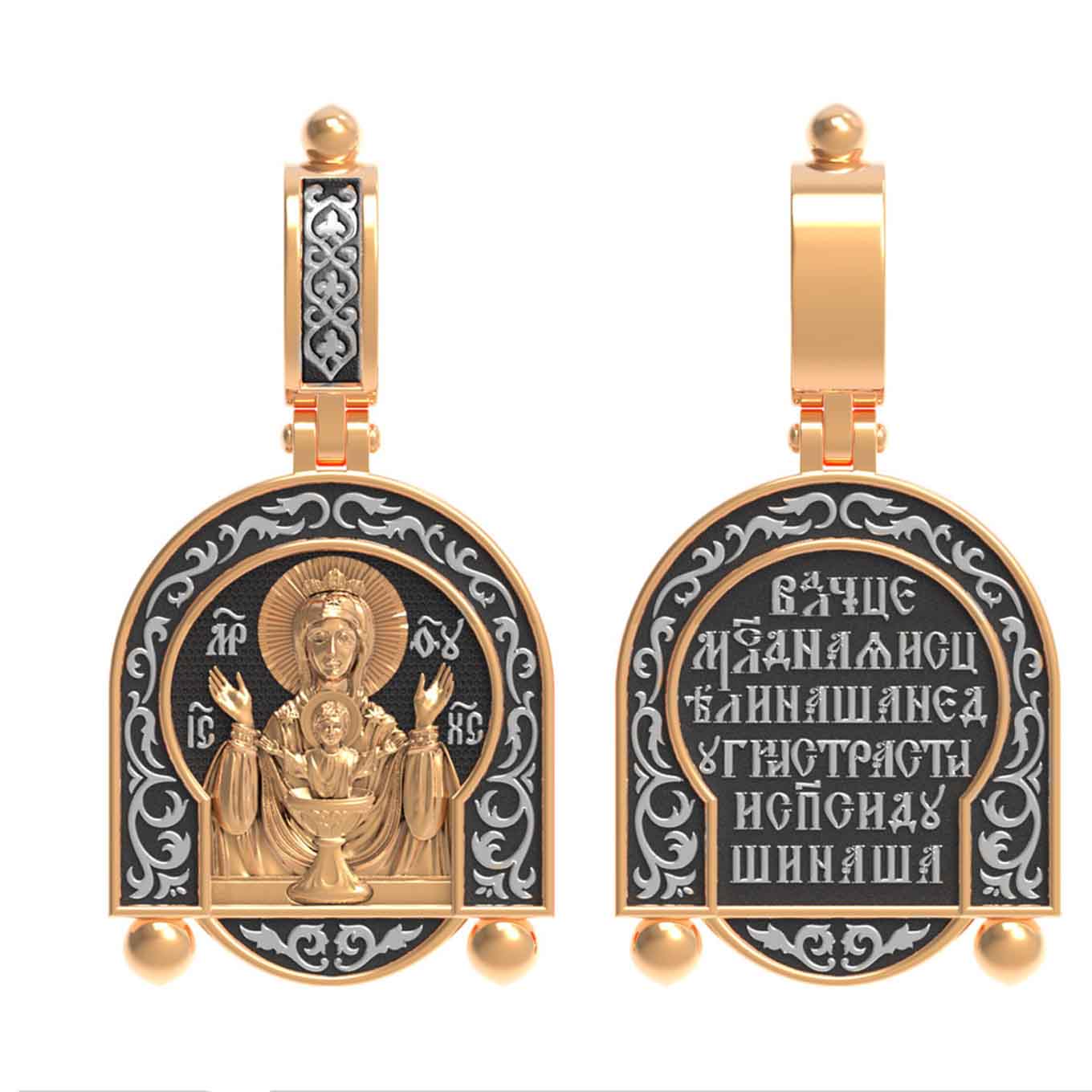 На лицевой части образка изображена икона Божией Матери «Неупиваемая чаша». Икона славится помощью в исцелении зависимостей, помогает людям обрести свободу от греховных страстей.