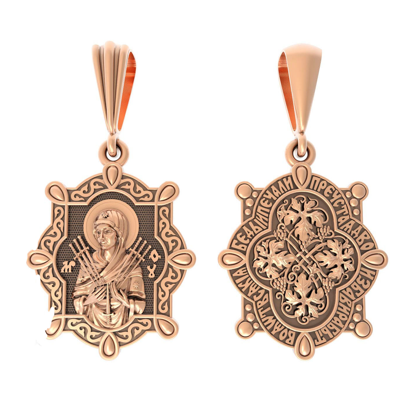 На лицевой стороне образка изображена икона Пресвятой Богородицы «Семистрельная» — одна из самых чудотворных икон на Руси. На протяжении многих веков христиане взывали к Царице Небесной через эту икону, если в стране начинались войны или мятежи.