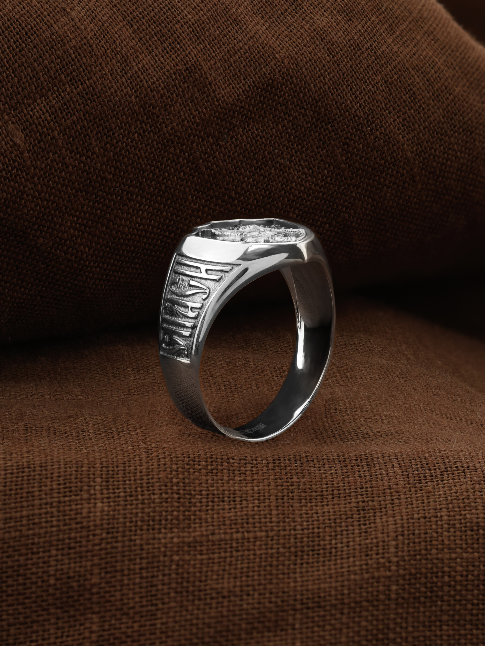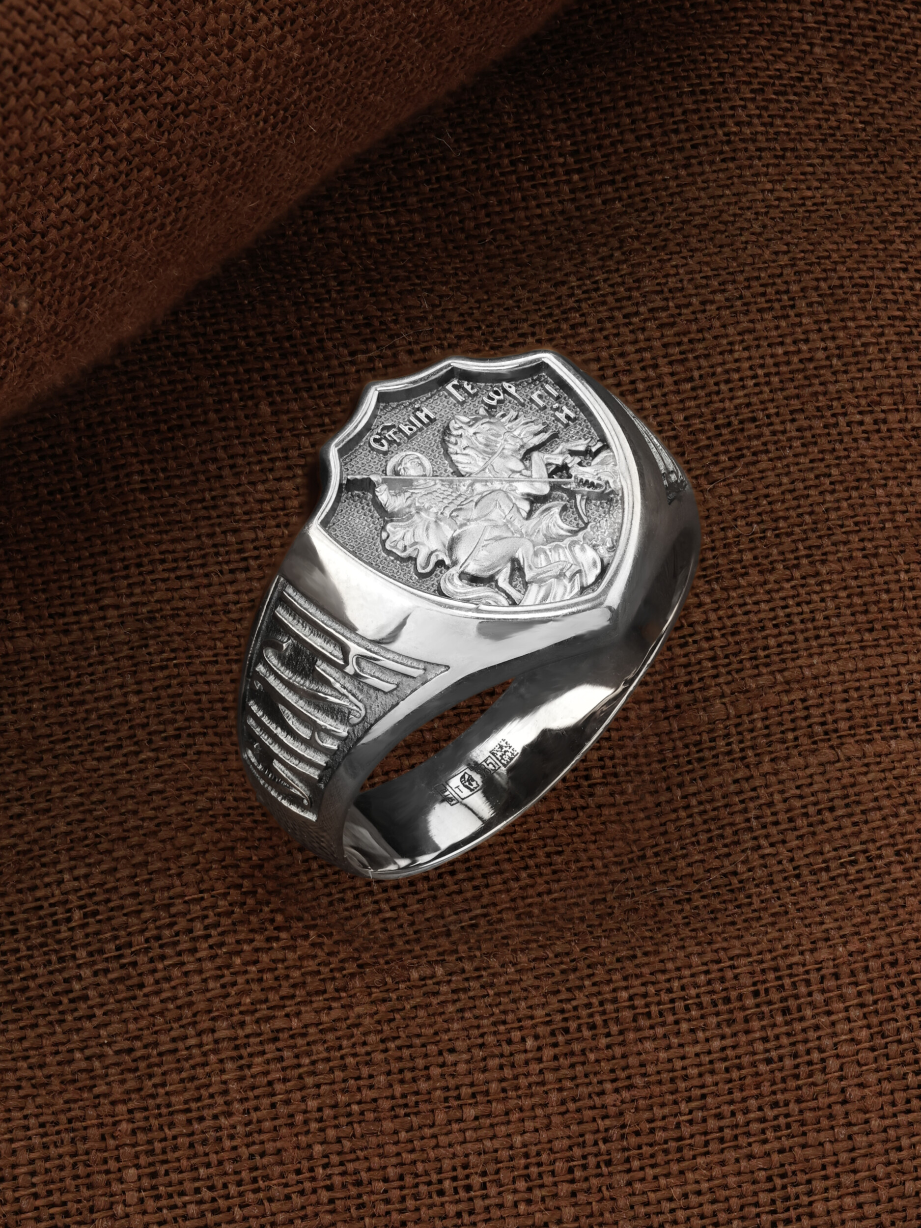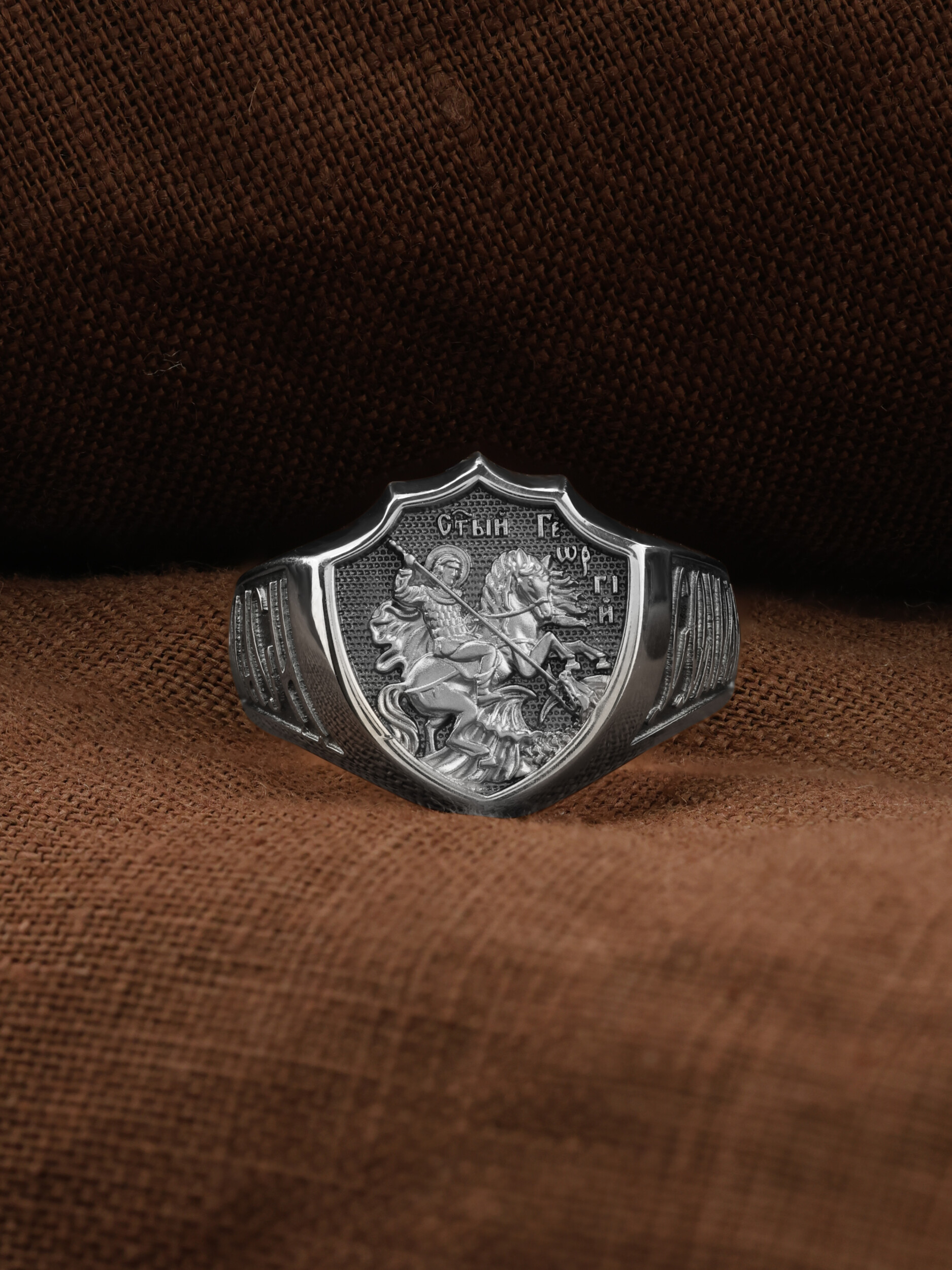 Кольцо «Святой Великомученик Георгий Победоносц» выполнено в древних христианских традициях. Основой композиции является изображение Святого Великомученика Георгия Победоносца — одного из самых почитаемых и удивительных святых. Георгий родился в Каппадокии (Малая Азия) в семье богатых и знатных горожан. Юношей поступил на службу к римскому императору Диоклетиану, за отличное знание военного дела и проявленную в боях и походах храбрость был приближен к императору и удостоен высокого воинского звания. Во время начавшихся гонений на христиан, перешел на сторону гонимых и, отвергнув человеческий страх, стал ярым проповедником учения Христа. Мучители подвергли опального воеводу жесточайшим восьмидневным пыткам и казнили его (обезглавили) в возрасте около тридцати лет в 303 году. На Руси он известен как Юрий или Егорий, заступник для верующих, чья жизнь имеет какое-либо отношение к военным делам, помощник в крестьянском труде. Георгий изображен как воитель, сидящий на вздыбленном коне и поражающий копьем огнедышащего змея. Справа над образом изображена благословляющая Божия десница. Змей символизирует собою сатанинские силы. Молитвами вознесенными к Всевышнему и своей непреклонной верой он смог одолеть чудовище. Святой убил змея, спас царскую дочь, принесенную в жертву, и жителей города, их души от влияния дьявола, породив в них надежду и веру в Господа, призывая людей принять христианскую веру.