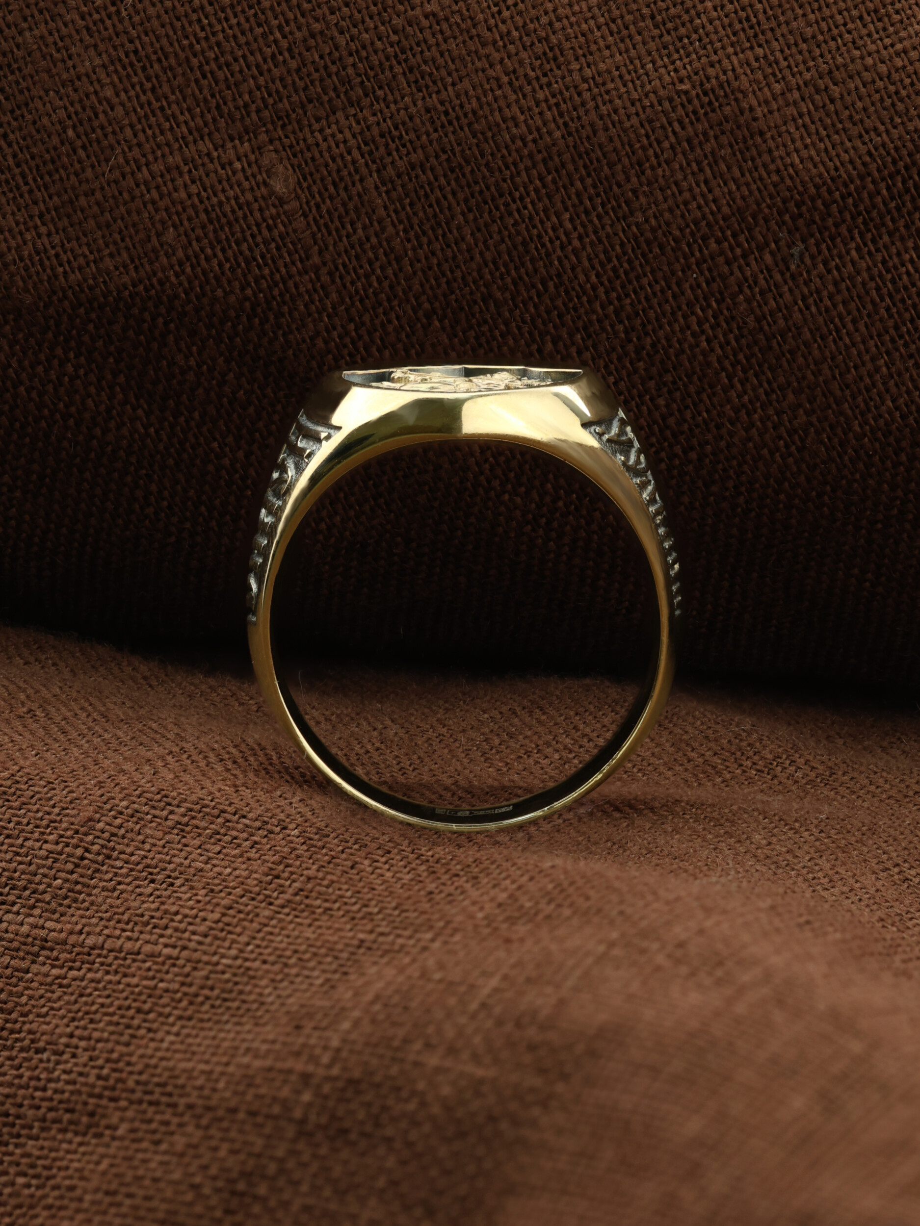 С внутренней стороны кольца изображен «Голгофский крест». Центральным и главным элементом композиции лицевой стороны является восьмиконечный крест — образ Честного и Животворящего Креста Господня, установленного на горе Голгофе. В основании креста изображена гора Голгофа, на которой был распят Спаситель и череп Адама, чьи кости по приданию омыла кровь Иисуса Христа. Перед головой располагаются лежащие кости рук, изображаются правая на левой, как при погребении или причащении. В XVI веке на Руси около изображения Голгофы появились обозначения «М.Л.Р.Б.» — Место Лобное Рай Бысть (Голгофа в переводе с еврейского — Лобное место). Чуть ниже справа и слева буквы «Г.Г.» — гора Голгофа.