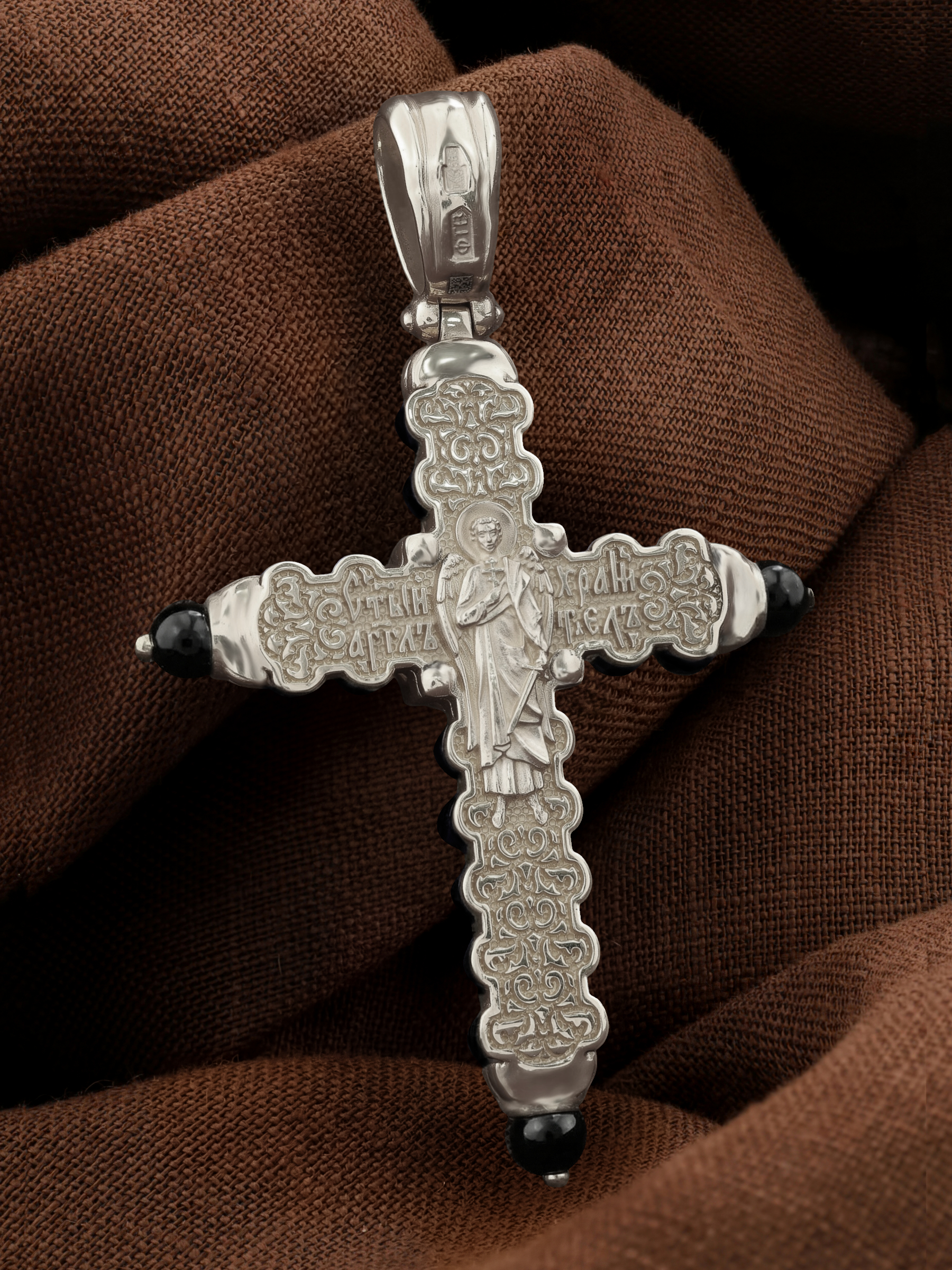 На оборотной стороне креста изображен святой Ангел-Хранитель в виде прекрасного юноши держащего в правой руке крест, а в левой — сферу. Ангел-Хранитель — это Ангел приставляемый Богом к человеку при крещении для охраны и помощи в добрых делах. Невидимо пребывая при нас постоянно, он, руководствуя нас ко спасению, не только по нашему желанию таинственно наставляет нас на все доброе и полезное, не только возносит наши молитвы к Богу, но еще и сам от себя охраняют и защищают нас от врагов видимых и невидимых, ходатайствует за нас пред Богом.