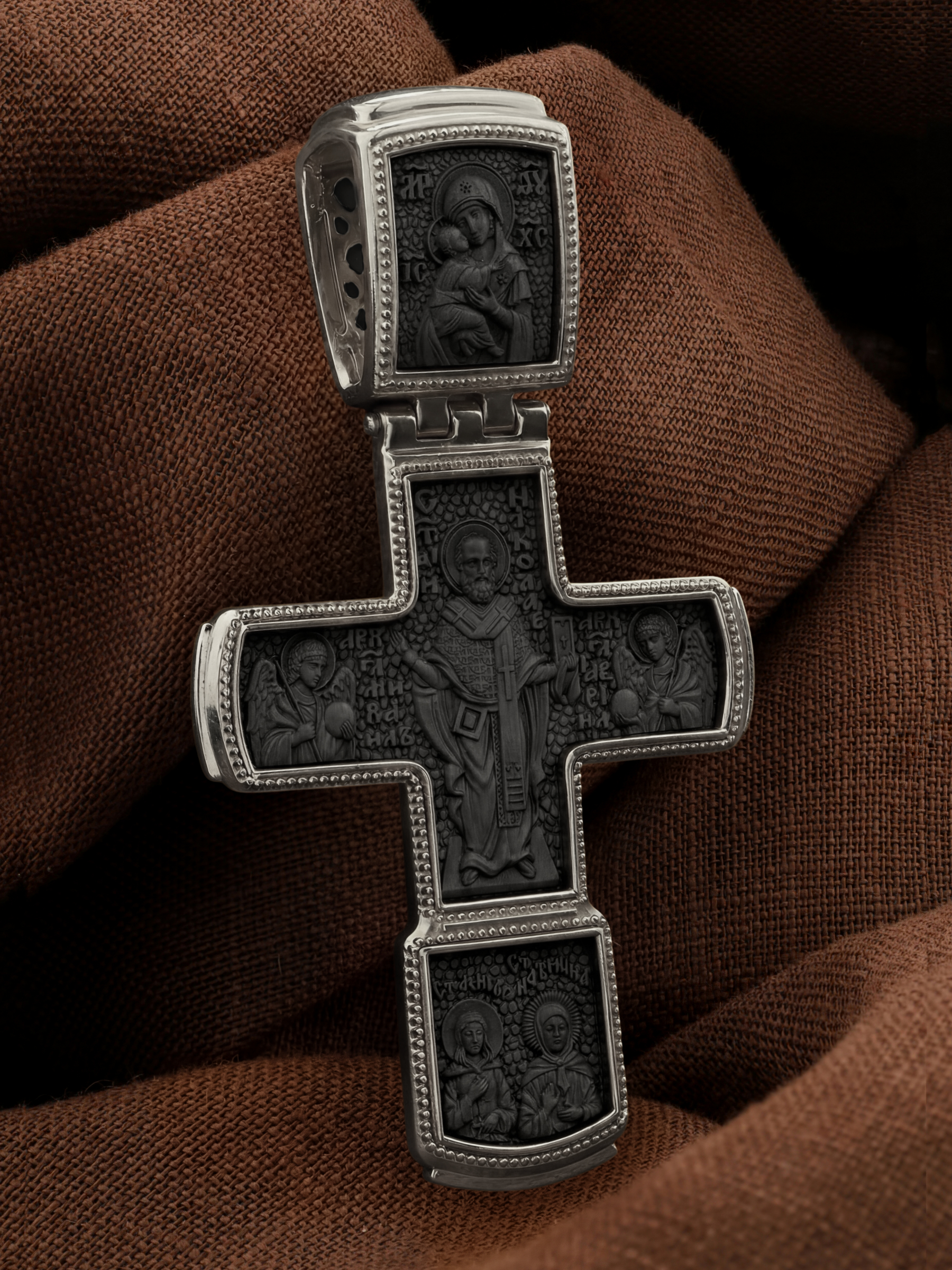 В центре на обороте — самый почитаемый в Православной Церкви святой, Николай Чудотворец, которого еще называют Николай Угодник за то, что он угодил своей жизнью Богу. Ему молятся, отправляясь в путешествие, особенно по морю, просят исцеления в различных недугах, помощи в торговых делах, учебе и поисках достойного супруга. С двух сторон от Николая Чудотворца помещены образы архангелов Михаила и Гавриила. Вверху — Владимирская икона Божией Матери — самая великая русская святыня, многие века бывшая олицетворением нашей земли. Перед ней венчались на царство государи, избирались патриархи. Пречистой Богородице Владимирской клялись в верности Отечеству солдаты и за нее умирали на поле брани. Именно на ее защиту более всего уповала Россия в самые страшные периоды своей истории. В нижнем клейме — иконы двух святых помощниц от всех недугов, блаженных Ксении Петербургской и Матроны Московской.