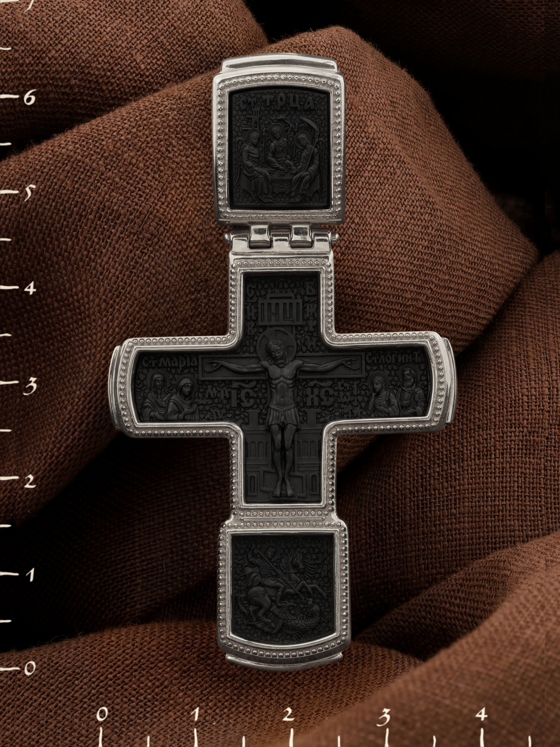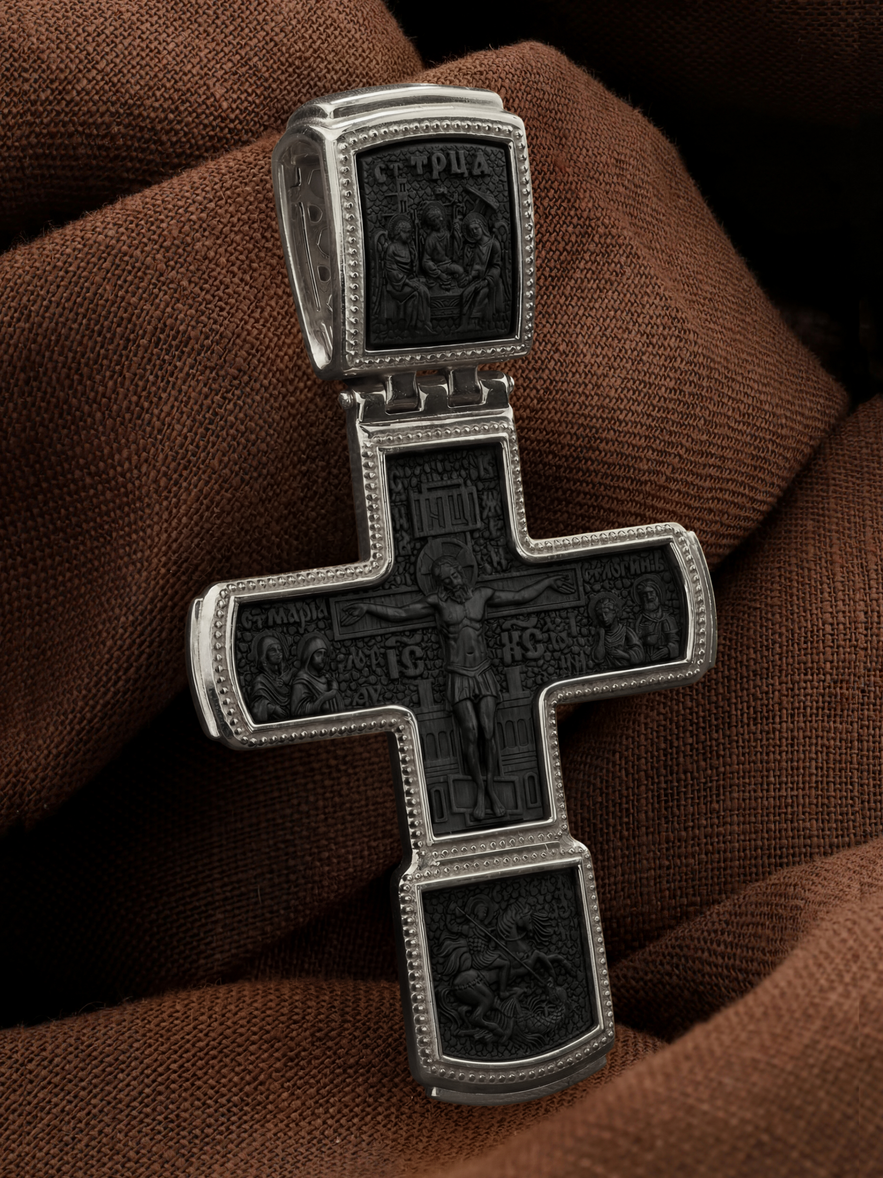 На кресте изображено Распятие Господа нашего Иисуса Христа. Ему предстоят Святая Мария Магдалина, Пресвятая Богородица, апостол Иоанн и Святой Иосиф, свидетели крестных страданий Господа. На оглавии помещена икона Святой Троицы, на которой запечатлено явление Триединого Бога праотцу Аврааму в виде трех ангелов. В нижнем клейме изображено Чудо Святого Георгия о змие. Великомученик Георгий почитается как покровитель воинов, защитник от злых сил, помощник в духовной борьбе.