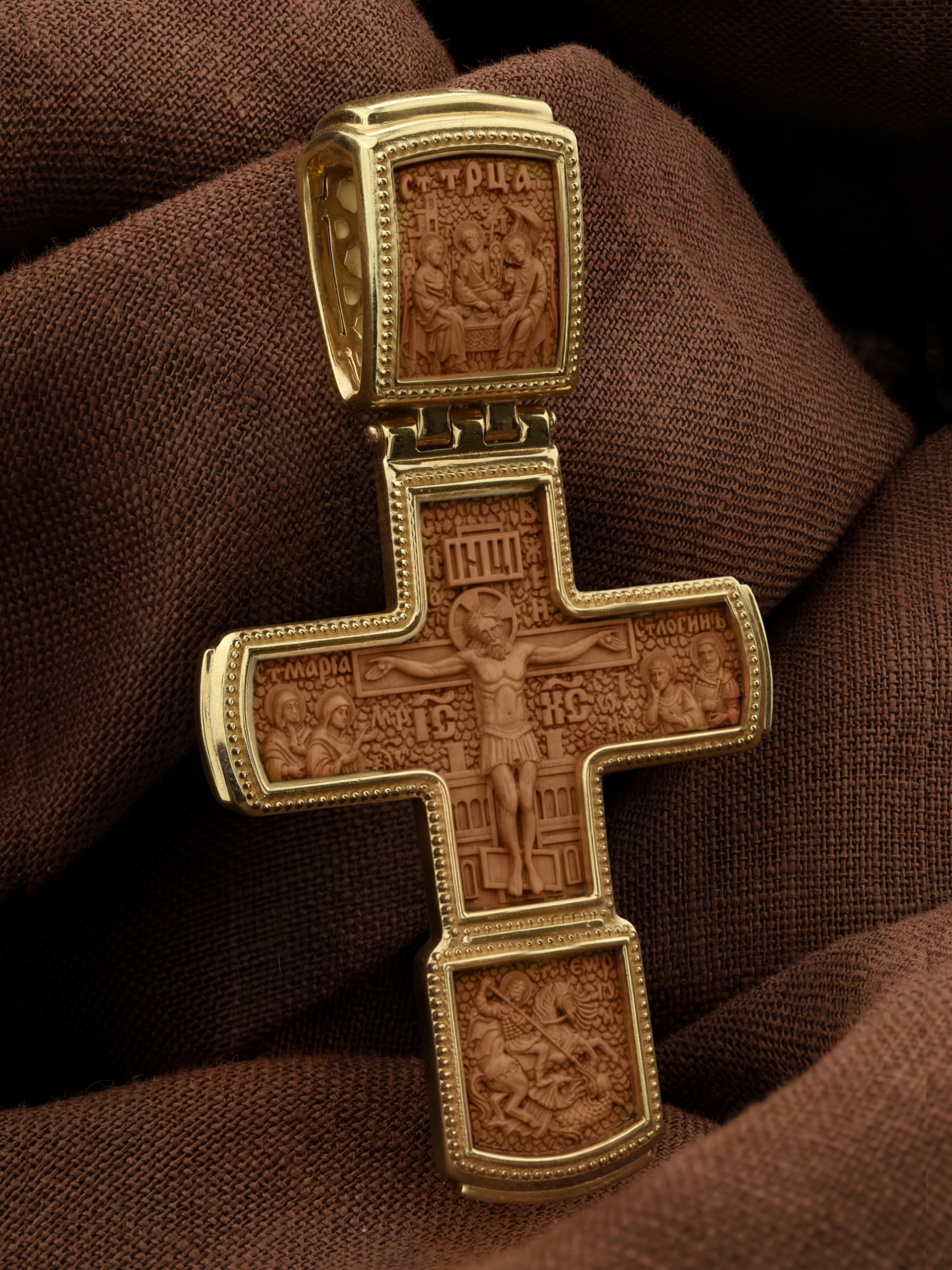 На кресте изображено Распятие Господа нашего Иисуса Христа. Ему предстоят Святая Мария Магдалина, Пресвятая Богородица, апостол Иоанн и Святой Иосиф, свидетели крестных страданий Господа. На оглавии помещена икона Святой Троицы, на которой запечатлено явление Триединого Бога праотцу Аврааму в виде трех ангелов. В нижнем клейме изображено Чудо Святого Георгия о змие. Великомученик Георгий почитается как покровитель воинов, защитник от злых сил, помощник в духовной борьбе.