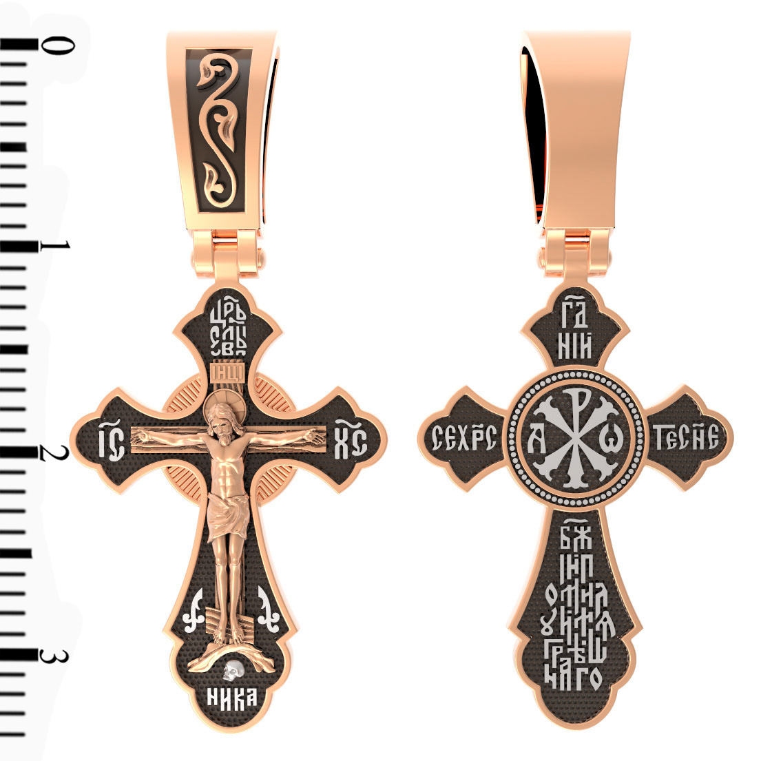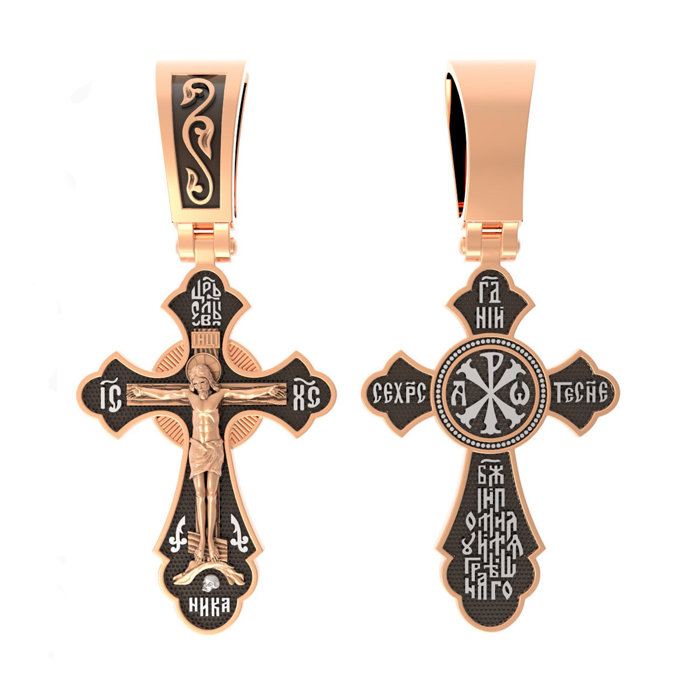 На лицевой стороне креста изображено Распятие, потому что это орудие казни Иисус Христос сделал орудием победы над грехом и смертью. Своими страданиями Он искупил грехи человечества, умерев и сошествовав во ад, победил сатану, освободил души праведников от вечной смерти и открыл им небесные врата рая. Жертва Христа сделала возможным спасение для каждого человека. На православном кресте Христос не умирает, а свободно простирает руки, ладони Иисуса открыты, будто он хочет обнять все человечество, даря им свою любовь и открывая путь к вечной жизни. Над титлом видим слова «ЦРЬ СЛВЫ» — Царь Славы. Верхняя перекладина символизирует собой табличку с надписью «IHЦI» — Иисус Назарянин Царь Иудейский. Над перекладиной пишется сокращенно имя Спасителя «IC XC» — Иисус Христос. В нижней части располагается надпись «НИКА» (греч. — Победитель). Возвышение, на котором стоит Крест, символизирует гору Голгофу, на которой произошло Распятие. У подножия Креста изображают прах Адама, обозначенный черепом.