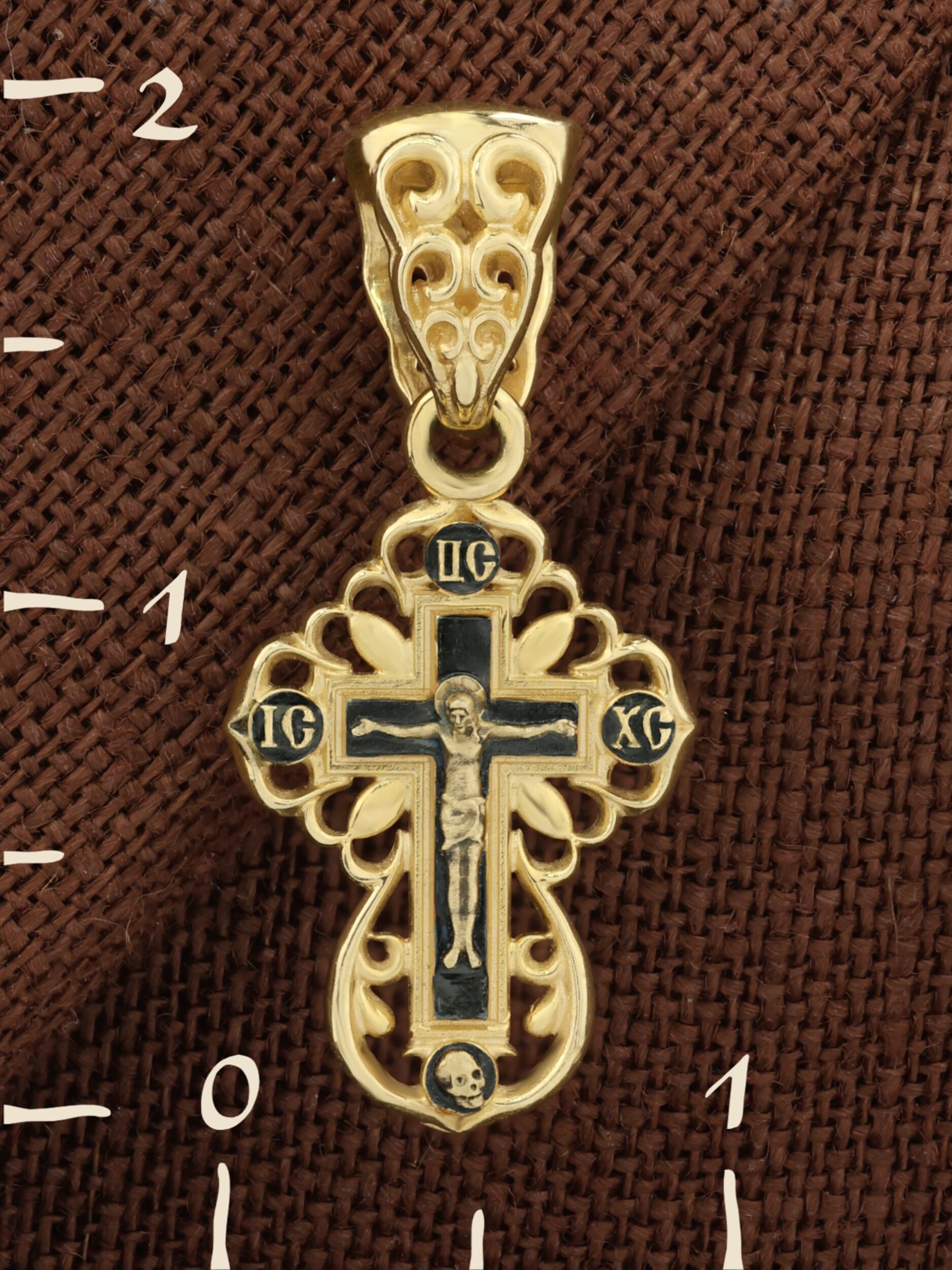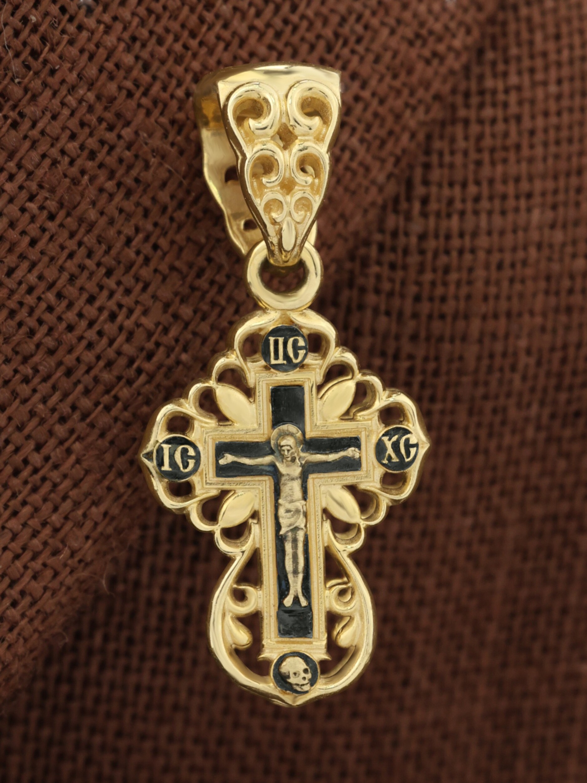 На лицевой стороне креста изображено Распятие Господа и Спасителя нашего Иисуса Христа. Своими крестными страданиями Господь смыл наши грехи, покрыл наш долг перед Богом или, на языке Писания, нас «искупил». В Голгофе сокрыта непостижимая тайна бесконечной правды и любви Бога. Крест стал символом победы добра над злом, жизни над смертью, напоминанием бесконечной Божьей любви, предметом радости. Воплотившийся Сын Божий Своею кровью освятил крест и сделал его проводником Своей благодати, источником освящения верующих. Над вершиной Распятия помещена надпись «Царь Славы». Надпись «IC» «ХC», означает Иисус Христос, помещаются на разных сторонах поперечной перекладины креста. В основании Распятия различается череп– это голова Адама. Христос в Своей Божественной любви, над которой смерть не властна и которая, страдая, и не страдает в обычном смысле, простирает к людям со Креста Свои объятия, в которые призывается и привлекается весь мир. Поэтому Тело Его не висит, а торжественно покоится на Кресте.