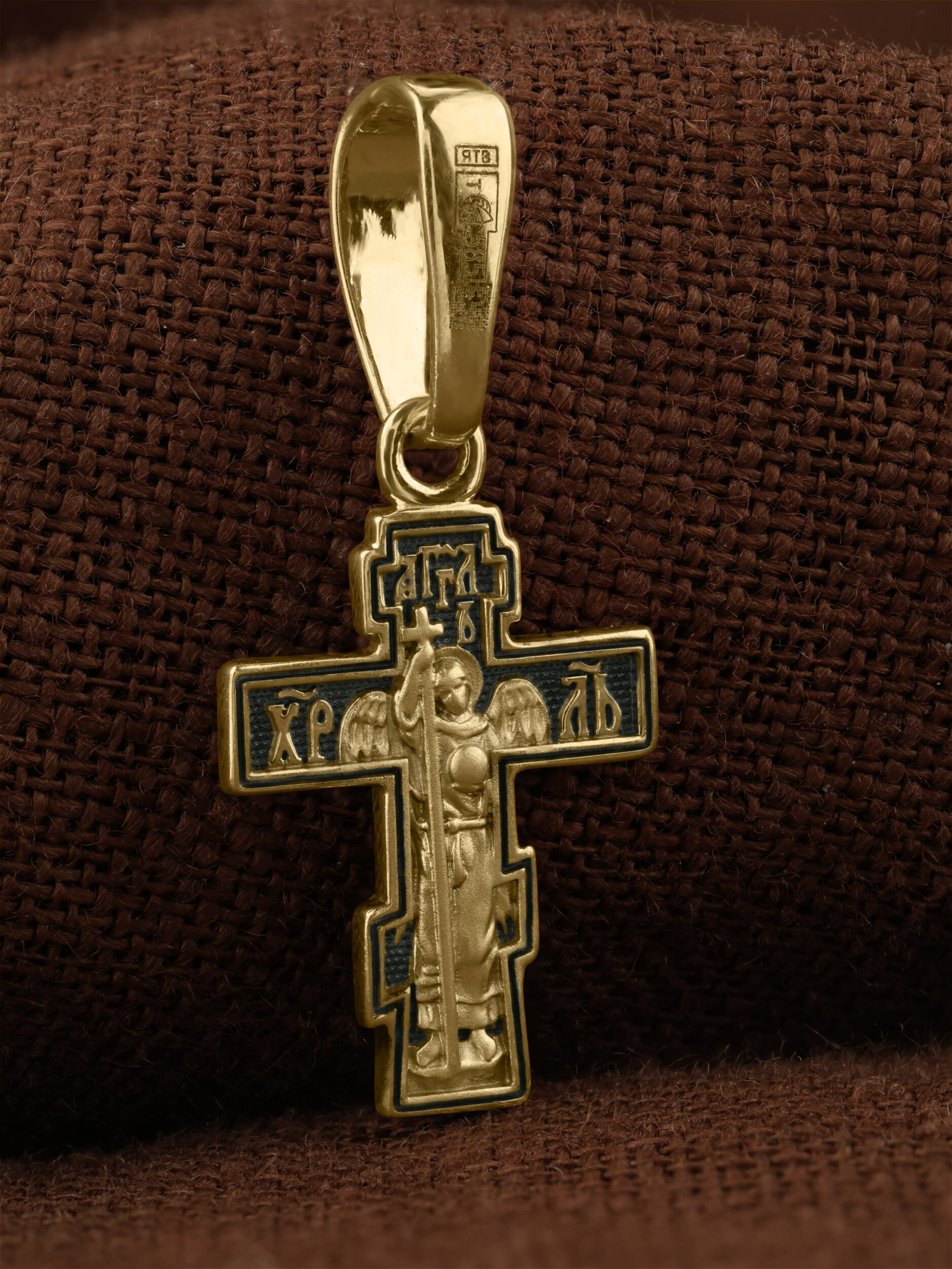 На оборотной стороне креста изображен святой Ангел-Хранитель в виде прекрасного юноши держащего в правой руке крест, а в левой — сферу. Ангел-Хранитель — это Ангел приставляемый Богом к человеку при крещении для охраны и помощи в добрых делах. Невидимо пребывая при нас постоянно, он, руководствуя нас ко спасению, не только по нашему желанию таинственно наставляет нас на все доброе и полезное, не только возносит наши молитвы к Богу, но еще и сам от себя охраняют и защищают нас от врагов видимых и невидимых, ходатайствует за нас пред Богом.