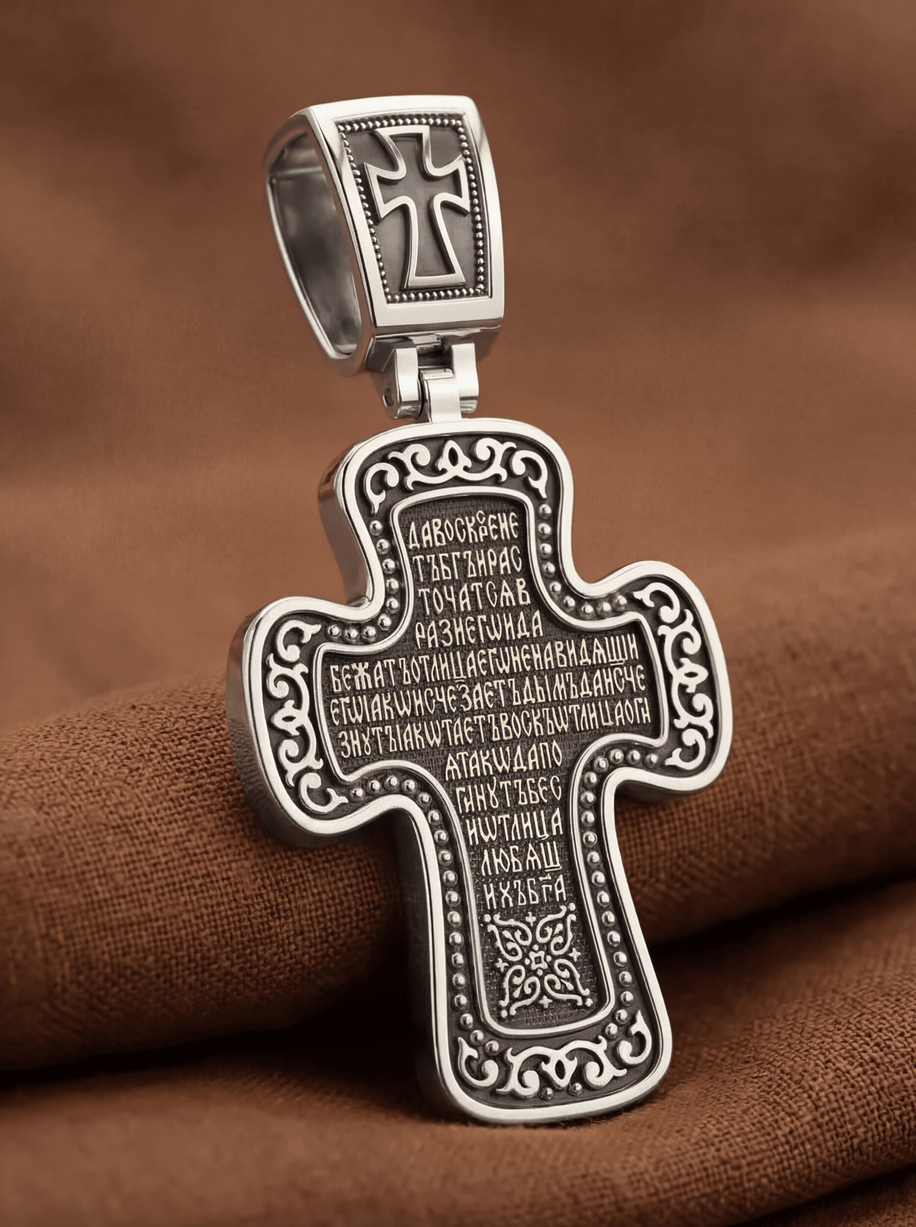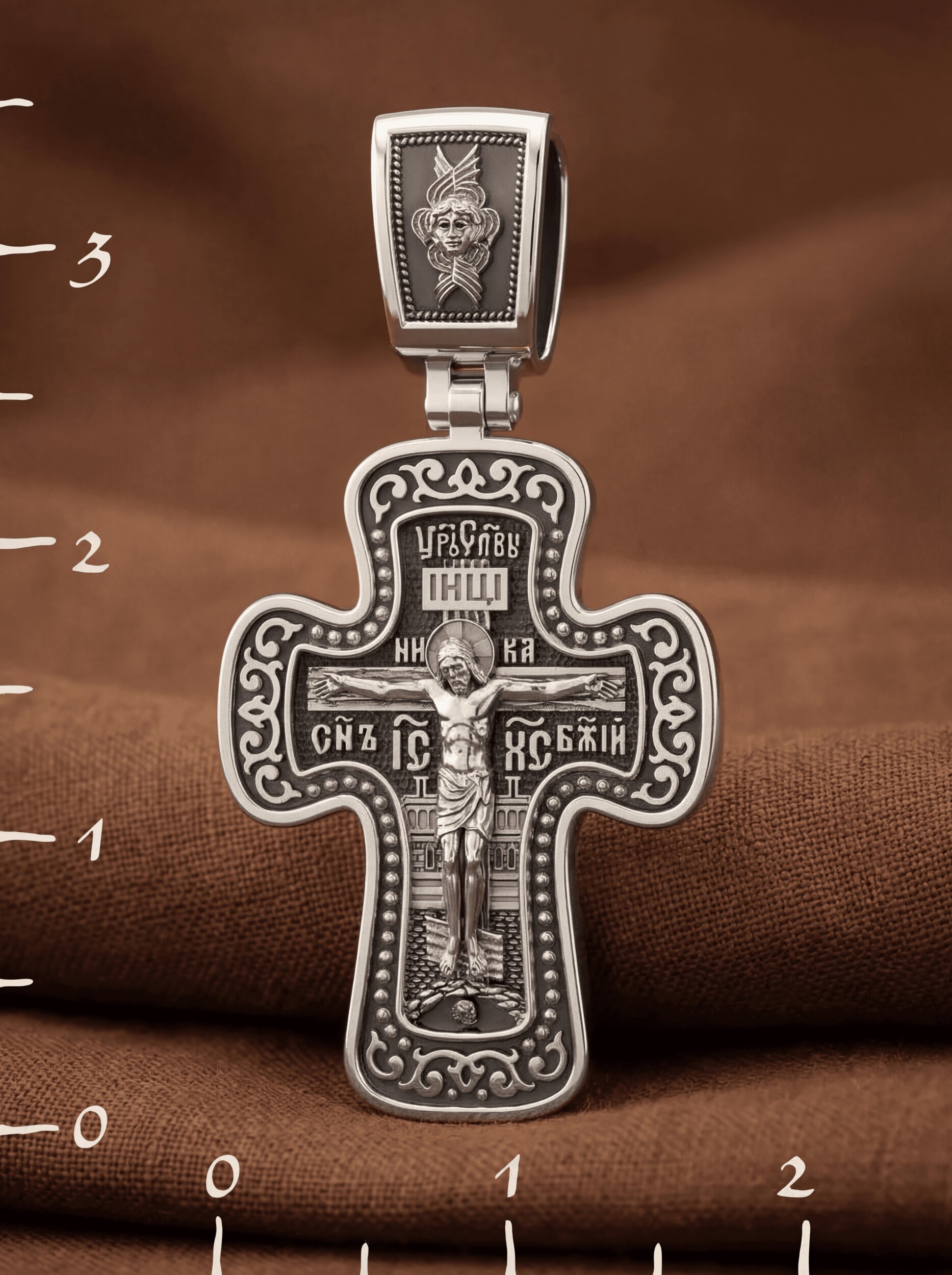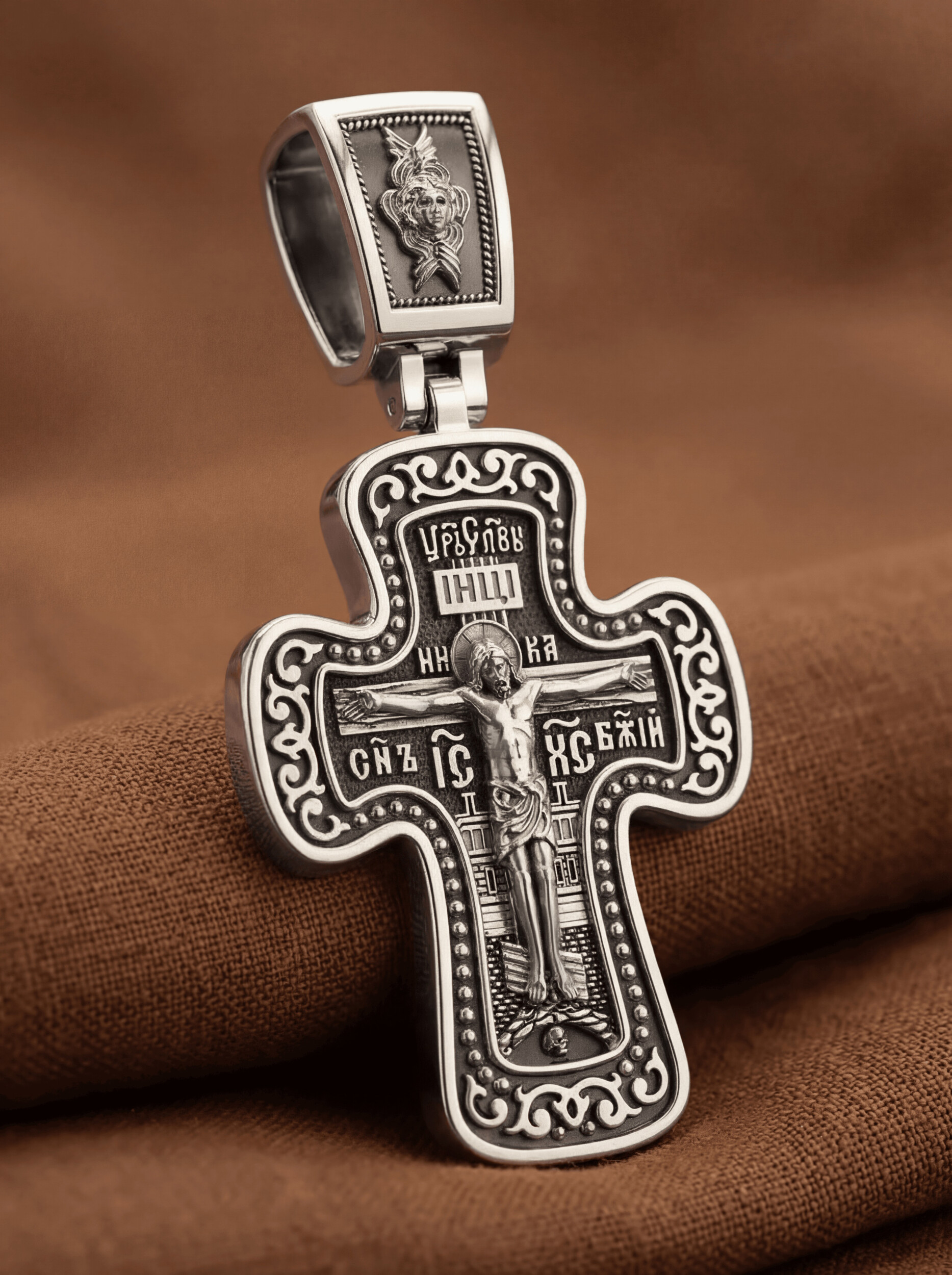 На лицевой стороне креста изображено Распятие, потому что это орудие казни Иисус Христос сделал орудием победы над грехом и смертью. Своими страданиями Он искупил грехи человечества, умерев и сошествовав во ад, победил сатану, освободил души праведников от вечной смерти и открыл им небесные врата рая. Жертва Христа сделала возможным спасение для каждого человека. На православном кресте Христос не умирает, а свободно простирает руки, ладони Иисуса открыты, будто он хочет обнять все человечество, даря им свою любовь и открывая путь к вечной жизни. Над титлом видим слова «ЦРЬ СЛВЫ» — Царь Славы. Верхняя перекладина символизирует собой табличку с надписью «IHЦI» — Иисус Назарянин Царь Иудейский. Над перекладиной пишется слово «НИКА» (греч. — Победитель), ниже перекладины добавляется сокращенно имя Спасителя «IC XC» — Иисус Христос и словосочетание «СНЪ БЖIЙ» — Сын Божий. Возвышение, на котором стоит Крест, символизирует гору Голгофу, на которой произошло Распятие. У подножия Креста изображают прах Адама, обозначенный черепом. На кулонном кольце изображен шестикрылый Серафим — самый приближенный к Господу Ангел.