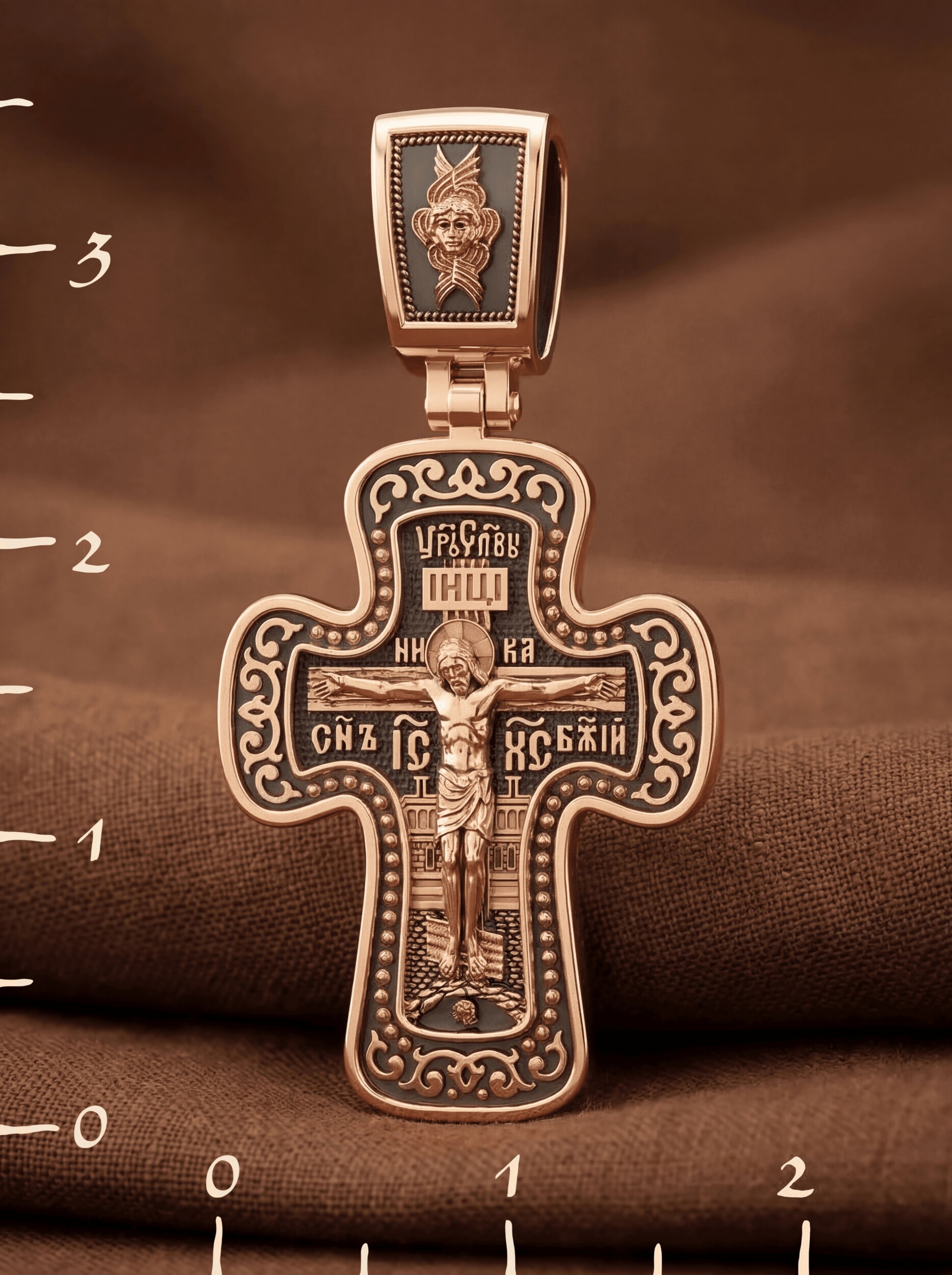 На лицевой стороне креста изображено Распятие, потому что это орудие казни Иисус Христос сделал орудием победы над грехом и смертью. Своими страданиями Он искупил грехи человечества, умерев и сошествовав во ад, победил сатану, освободил души праведников от вечной смерти и открыл им небесные врата рая. Жертва Христа сделала возможным спасение для каждого человека. На православном кресте Христос не умирает, а свободно простирает руки, ладони Иисуса открыты, будто он хочет обнять все человечество, даря им свою любовь и открывая путь к вечной жизни. Над титлом видим слова «ЦРЬ СЛВЫ» — Царь Славы. Верхняя перекладина символизирует собой табличку с надписью «IHЦI» — Иисус Назарянин Царь Иудейский. Над перекладиной пишется слово «НИКА» (греч. — Победитель), ниже перекладины добавляется сокращенно имя Спасителя «IC XC» — Иисус Христос и словосочетание «СНЪ БЖIЙ» — Сын Божий. Возвышение, на котором стоит Крест, символизирует гору Голгофу, на которой произошло Распятие. У подножия Креста изображают прах Адама, обозначенный черепом. На кулонном кольце изображен шестикрылый Серафим — самый приближенный к Господу Ангел.