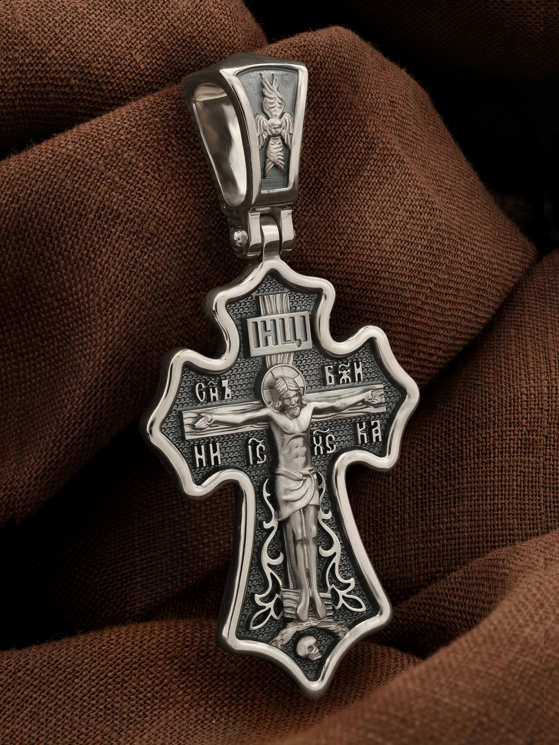 На лицевой стороне креста изображено Распятие, потому что это орудие казни Иисус Христос сделал орудием победы над грехом и смертью. Своими страданиями Он искупил грехи человечества, умерев и сошествовав во ад, победил сатану, освободил души праведников от вечной смерти и открыл им небесные врата рая. Жертва Христа сделала возможным спасение для каждого человека. На православном кресте Христос не умирает, а свободно простирает руки, ладони Иисуса открыты, будто он хочет обнять все человечество, даря им свою любовь и открывая путь к вечной жизни. Верхняя перекладина символизирует собой табличку с надписью «IHЦI» — Иисус Назарянин Царь Иудейский. Над перекладиной пишется словосочетание «СНЪ БЖIЙ» — СЫН БОЖИЙ. Ниже перекладины пишется сокращенно имя Спасителя «IC XC» — Иисус Христос и слово «НИКА» (греч. — Победитель). Возвышение, на котором стоит Крест, символизирует гору Голгофу, на которой произошло Распятие. У подножия Креста изображают прах Адама, обозначенный черепом. На кулонном кольце изображен шестикрылый Серафим — самый приближенный к Господу Ангел.