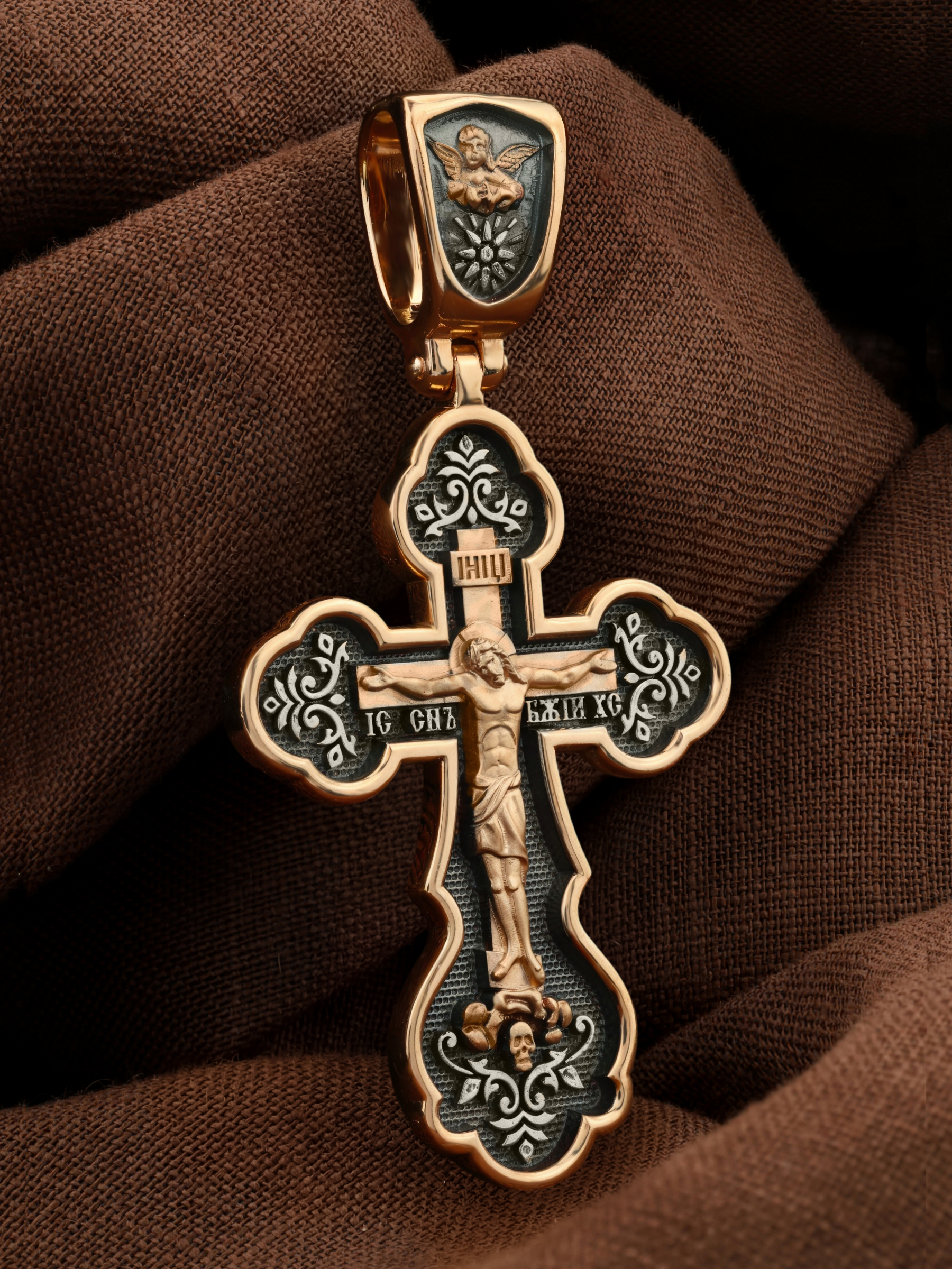 На лицевой стороне креста изображено Распятие Господа и Спасителя нашего Иисуса Христа. Христос, подвергнутый на кресте мучительной казни, своими страданиями искупил нас от древнего греха и даровал нам жизнь вечную. Крест означает своей вертикальной прямой линией справедливость и непреложность Божественных заповедей, прямоту Божией правды и истины, не допускающей никаких нарушений. Эта прямота пересекается главной поперечной перекладиной, означающей любовь и милость Божию к падшим и падающим грешникам, ради которой и был принесен в жертву Сам Господь, взявший на Себя грехи всех людей. На верхней табличке, выше головы Иисуса, расположена надпись, составленная Понтием Пилатом — «IНЦI». Она означает «Иисус Назорей, Царь Иудейский». Надпись «IС ХС» означает Иисус Христос и словосочетание «СЫН БОЖИЙ», что означает божественную природу Иисуса Христа, помещается на разных сторонах поперечной перекладины креста. Крест стоит на горе камней, символизирующих Голгофу. Под подножием Креста изображена покоящаяся голова (череп) Адама, грехи которого Христос омыл Своею Кровью. Христос в Своей Божественной любви, над которой смерть не властна и которая, страдая, и не страдает в обычном смысле, простирает к людям со Креста Свои объятия, в которые призывается и привлекается весь мир. Поэтому Тело Его не висит, а торжественно покоится на Кресте. Здесь Христос, распятый и умерший, удивительным образом жив в самой смерти Своей. На кулонном кольце изображен Ангел Херувим. Херувимы сияют всегда светом Богопознания, ведением таин и глубин премудрости Божией, сами просвещаемые и других просвещающие.