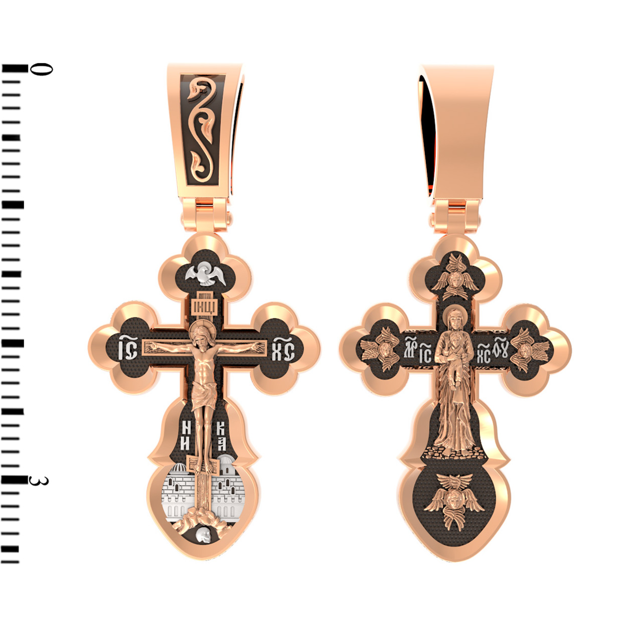 Распятие сопровождается иконографическими надписями, прославляющими Господа Иисуса Христа. На боковых оконечностях размещены инициалы святого имени Спасителя «IС ХС» и надпись «Сын Божий», обозначающая Его божественную природу. На подножии Креста можно прочитать надпись «НИКА» (Победитель) — символ победы Господа над смертью. Венчает лицевую сторону образ Святого Духа в виде голубя.