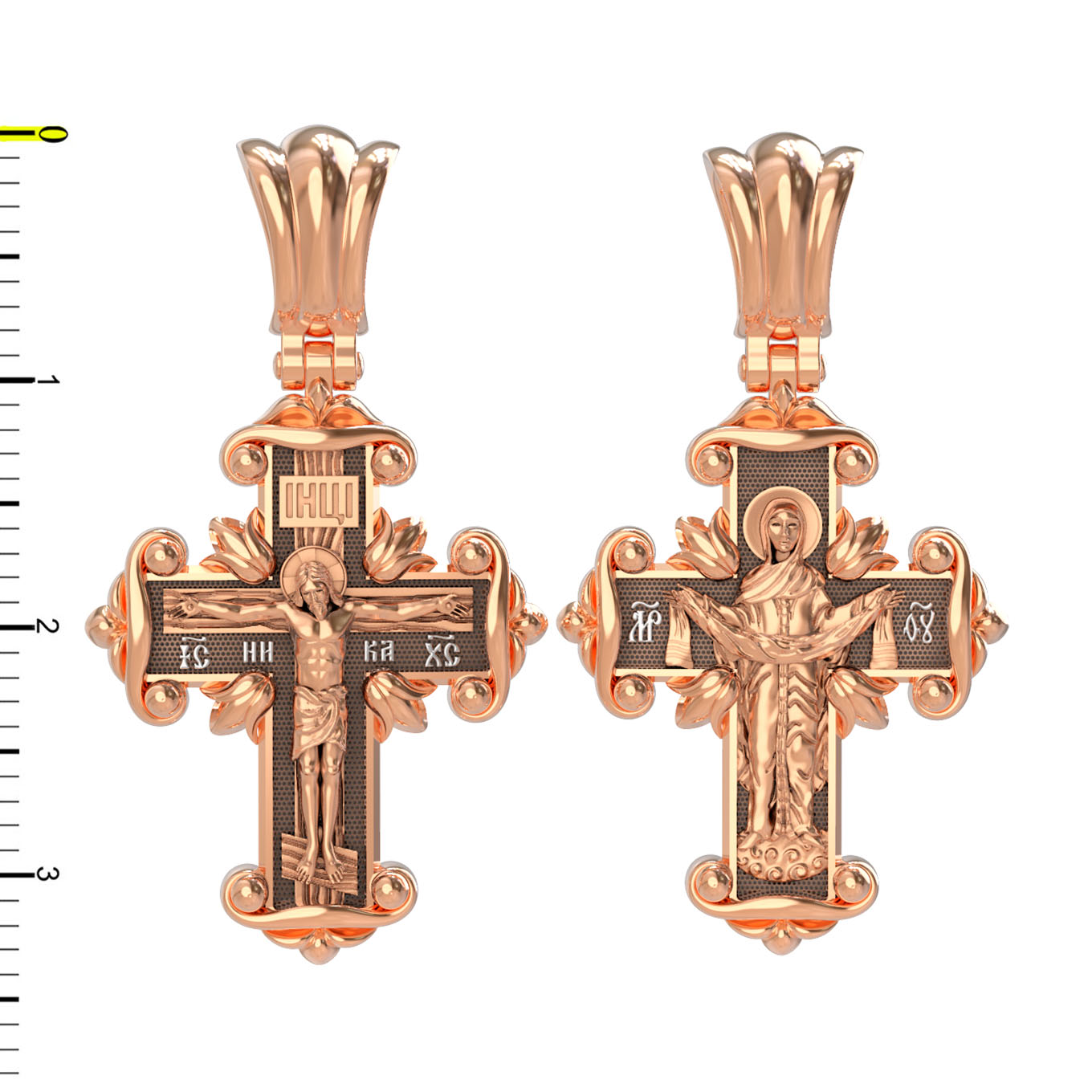 На оборотной стороне креста изображена икона Божией Матери «Покров Пресвятой Богородицы». Праздник Покрова Пресвятой Богородицы пришел на Русь в XII веке из Византии и стал одним из самых почитаемых. В 910 году Византийской Империи угрожали нападением сарацины. Не видя ниоткуда помощи, в те дни греки во множестве стекались в Константинополь, во Влахернский храм, в котором хранились риза Богоматери и Ее головной покров, и молились. 1 (14) октября 910 года Святому Андрею Юродивому и его ученику Епифанию было видение Покрова Божией Матери. Пресвятая Богородица, в окружении Святых, явилась над алтарем Храма и слезно молилась. По окончании молитвы сняла с Себя блистающее великое и страшное покрывало, которое носила на Пречистой главе Своей и, держа его с великой торжественностью, распростерла над всем стоящим народом. Вскоре враги без всякого кровопролития отступили от города. Богородица простирает Свой молитвенный покров над всеми православными христианами и умоляет Сына своего о даровании вечного спасения каждому человеку.