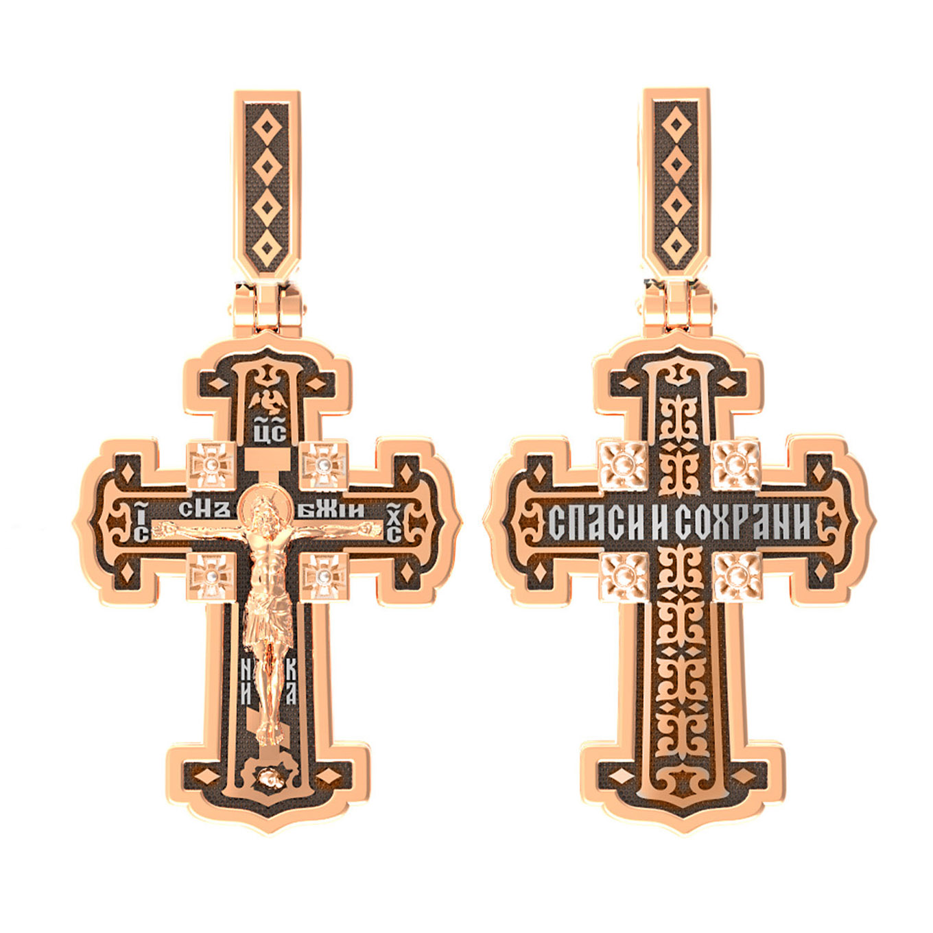 На лицевой стороне креста изображено Распятие Господа и Спасителя нашего Иисуса Христа. В Голгофе сокрыта непостижимая тайна бесконечной правды и любви Бога. Крест стал символом победы добра над злом, жизни над смертью, напоминанием бесконечной Божьей любви, предметом радости. Воплотившийся Сын Божий Своею кровью освятил крест и сделал его проводником Своей благодати, источником освящения верующих. Над вершиной Распятия помещена надпись «Царь Славы» и изображение Духа Святого в виде голубя, сходящего с небес. Надпись «IС» « ХС» означает Иисус Христос и помещается на разных сторонах поперечной перекладины креста. Рядом расположена надпись «Сын Божий». Слово «НИКА», что означает «победитель», помещаются в нижней части креста. Крест стоит на горе камней, символизирующих Голгофу. В ее основании различается череп — это голова Адама. На православном кресте Христос не умирает, а свободно простирает руки, ладони Иисуса открыты, будто он хочет обнять все человечество, даря им свою любовь и открывая путь к вечной жизни.