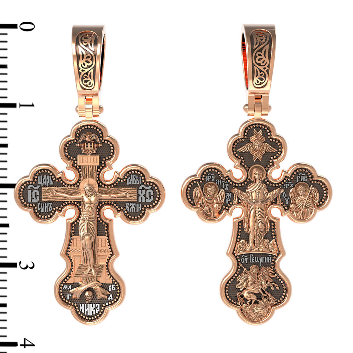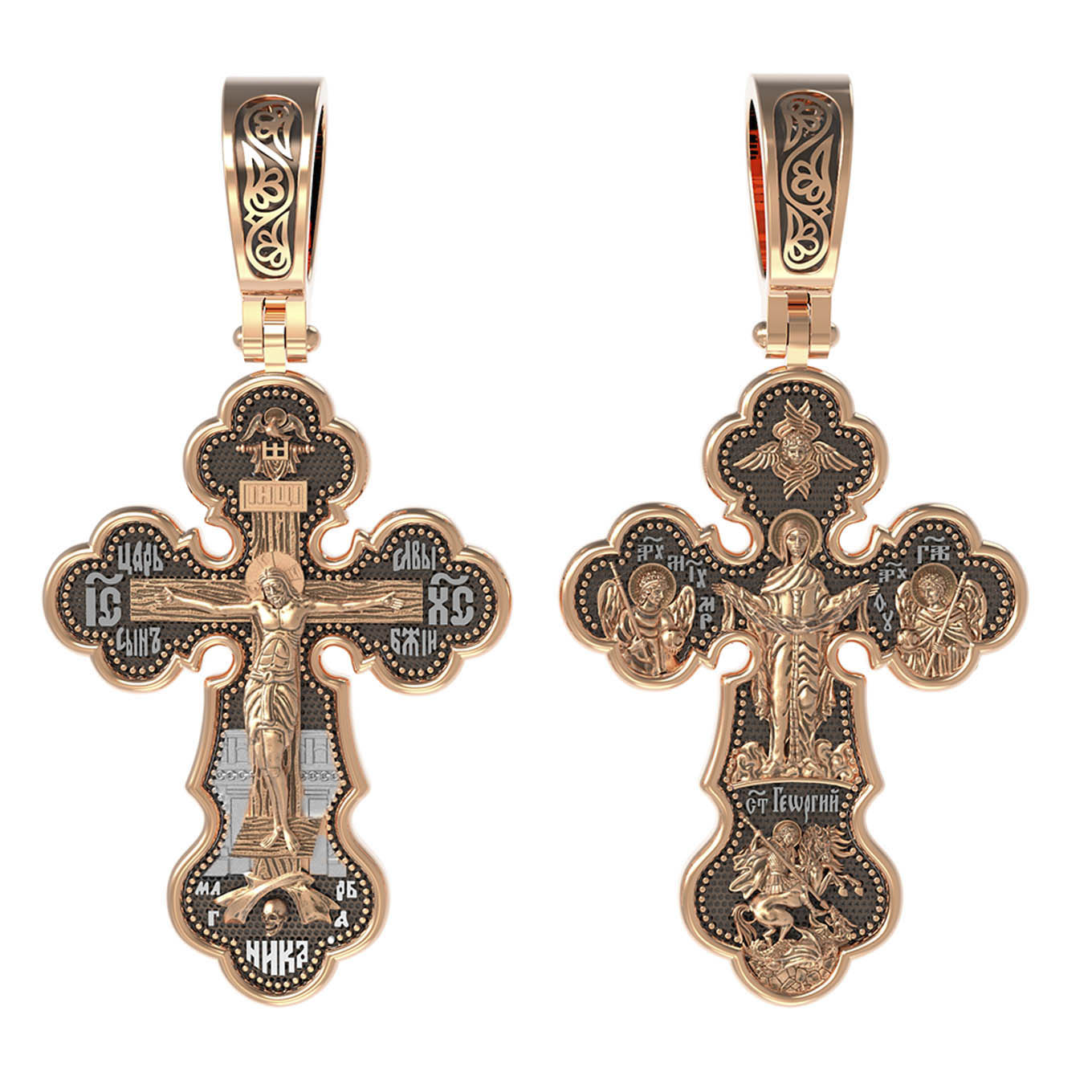 Центральную часть оборотной стороны креста украшает икона Божией Матери «Покров Пресвятой Богородицы». Праздник Покрова Пресвятой Богородицы пришел на Русь в XII веке из Византии и стал одним из самых почитаемых. Пресвятая Богородица простирает Свой молитвенный покров над всеми православными христианами и умоляет Сына своего о даровании вечного спасения каждому человеку. Над образом помещен шестикрылый Серафим. Справа помещено изображение Архангела Гавриила, слева- Архангела Михаила. На кресте внизу помещено изображение Святого Великомученика Георгия Победоносца — одного из самых почитаемых и удивительных святых. Он изображен как воитель, сидящий на вздыбленном коне и поражающий копьем огнедышащего змея. Змей символизирует собою сатанинские силы.
