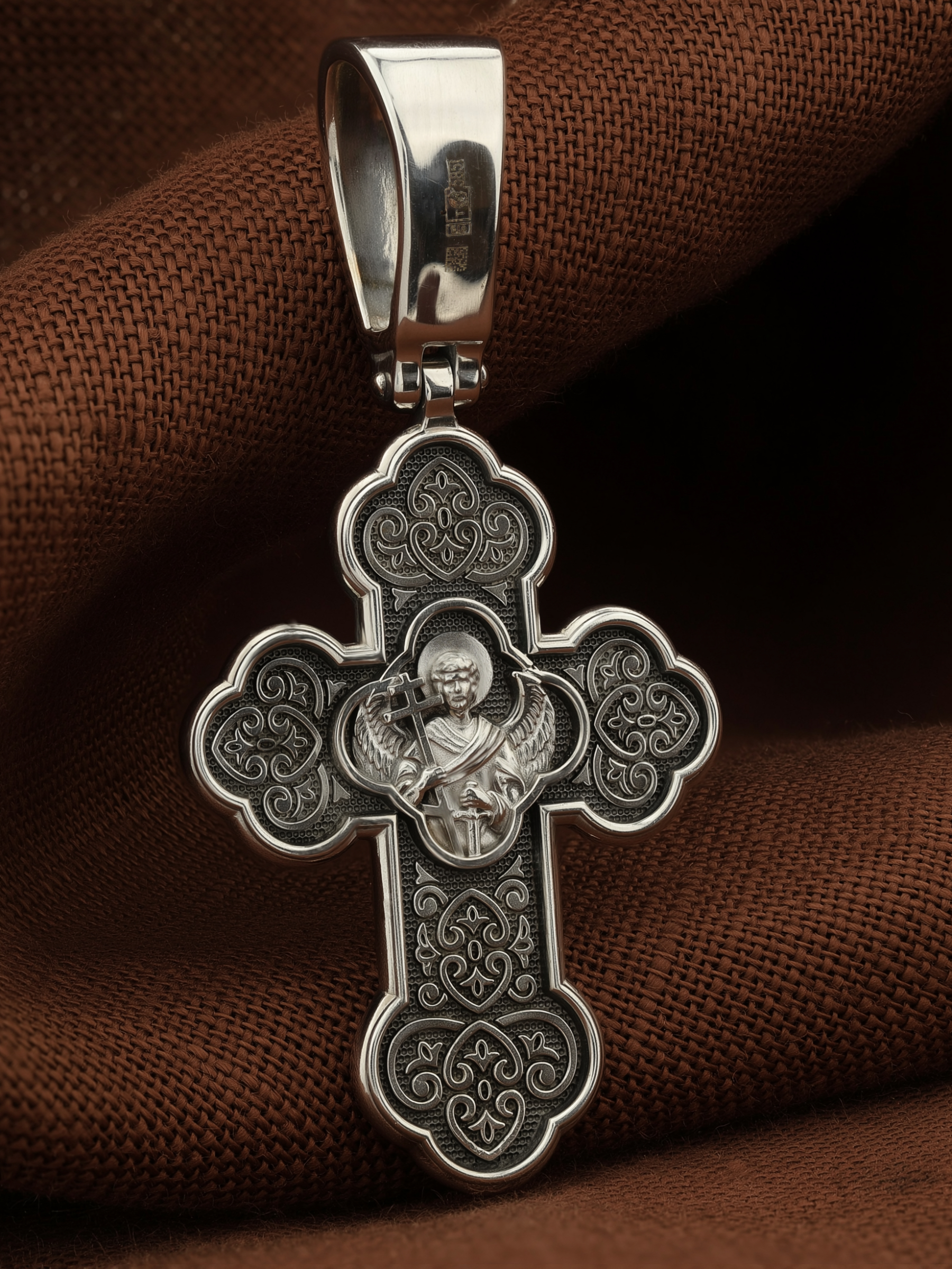 Крест нательный четырехконечный с трехлепестковыми завершениями перекладин. Основой композиции лицевой стороны креста является Распятие Иисуса Христа. С обеих сторон горизонтальной перекладины надписи — монограмма святого имени Христа — «ИС ХС», а под ней «Сын Божий». Над головой Христа надпись — «НИКА» (Победитель). В подножии мы видим изображенную гору Голгофу в виде скалистой горки, а так же буквы «МЛ» «РБ», которые означают: «Место Лобное Рай Бысть». Крест, на котором Спаситель мира принес Искупительную жертву, открыл врата рая, затворившиеся после грехопадения Адама. Поэтому Лобное место (Голгофа) стало раем.