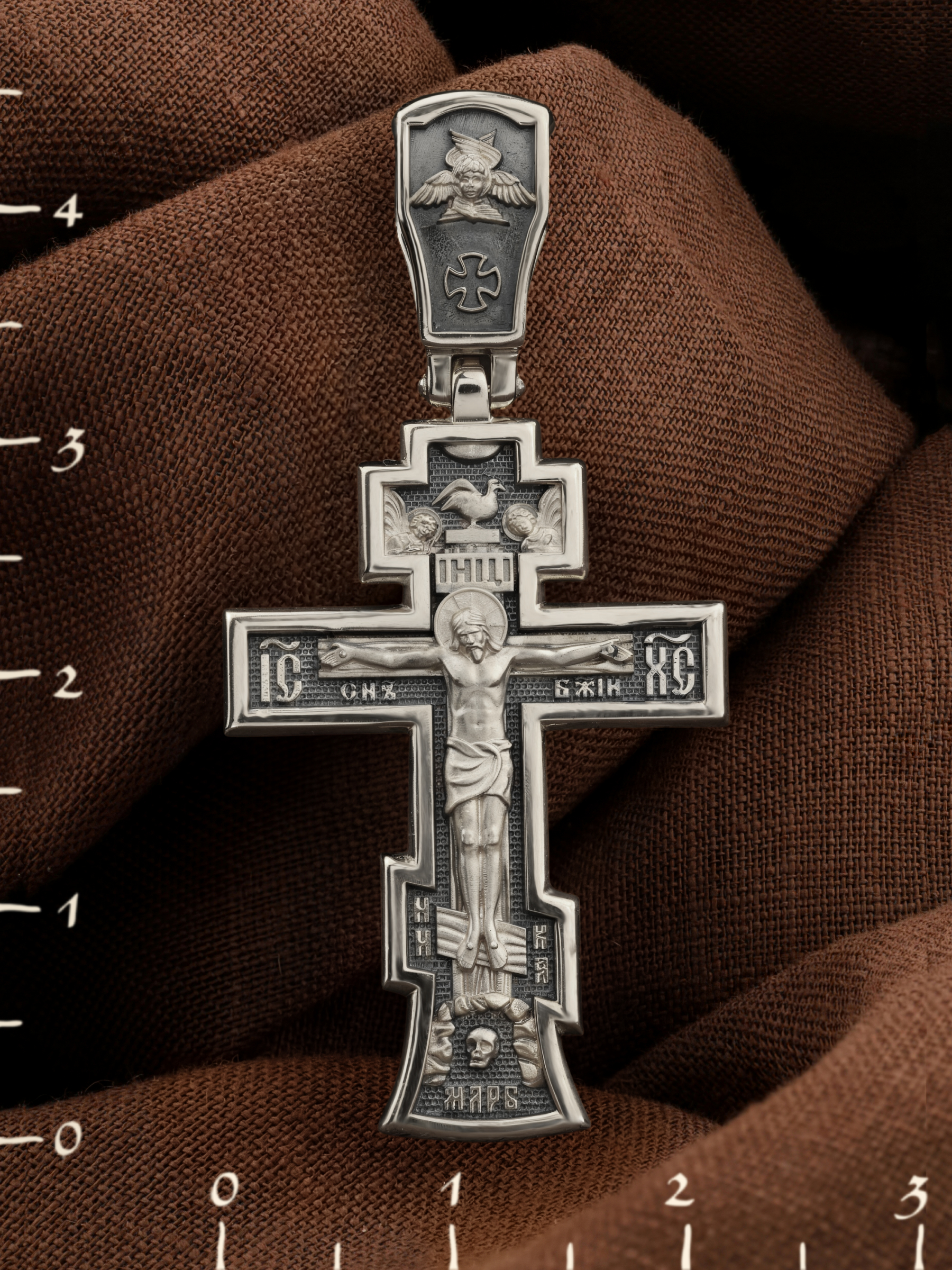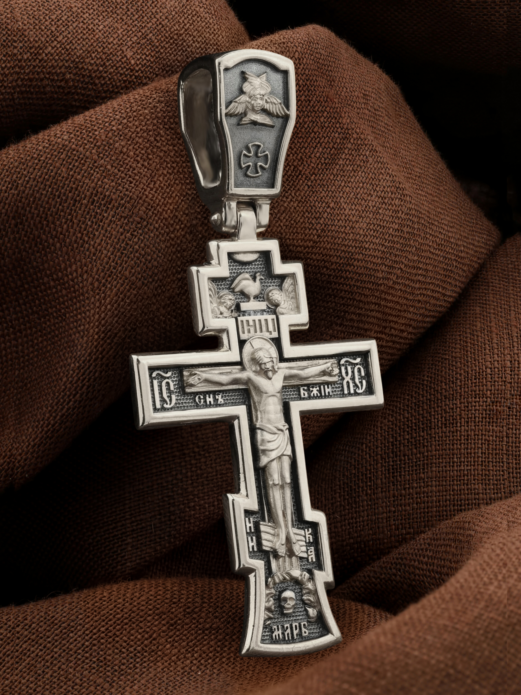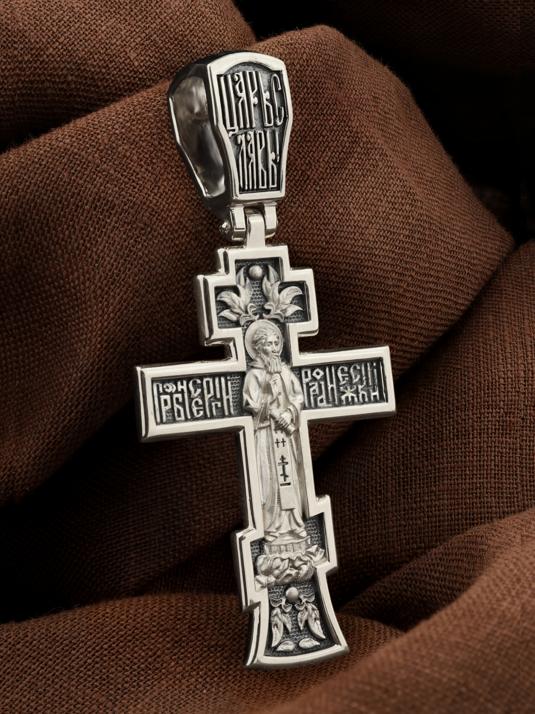На лицевой стороне этого креста центральную часть занимает икона Распятия Христа — образ жертвы, принесенной Господом за грехи людей. Именно ко Христу, сошедшему на землю ради нашего спасения, возносятся все молитвы. Рядом с Его образом помещены слова — «НИКА» и «Сын Божий». Эти слова характеризуют Господа как Великого Архиерея, победителя смерти. Также Распятие сопровождается надписями, олицетворяющими Христа — это святое имя Христа «IC» (Иисус) «ХС» (Христос). На кулонном кольце написано «Царь Славы».