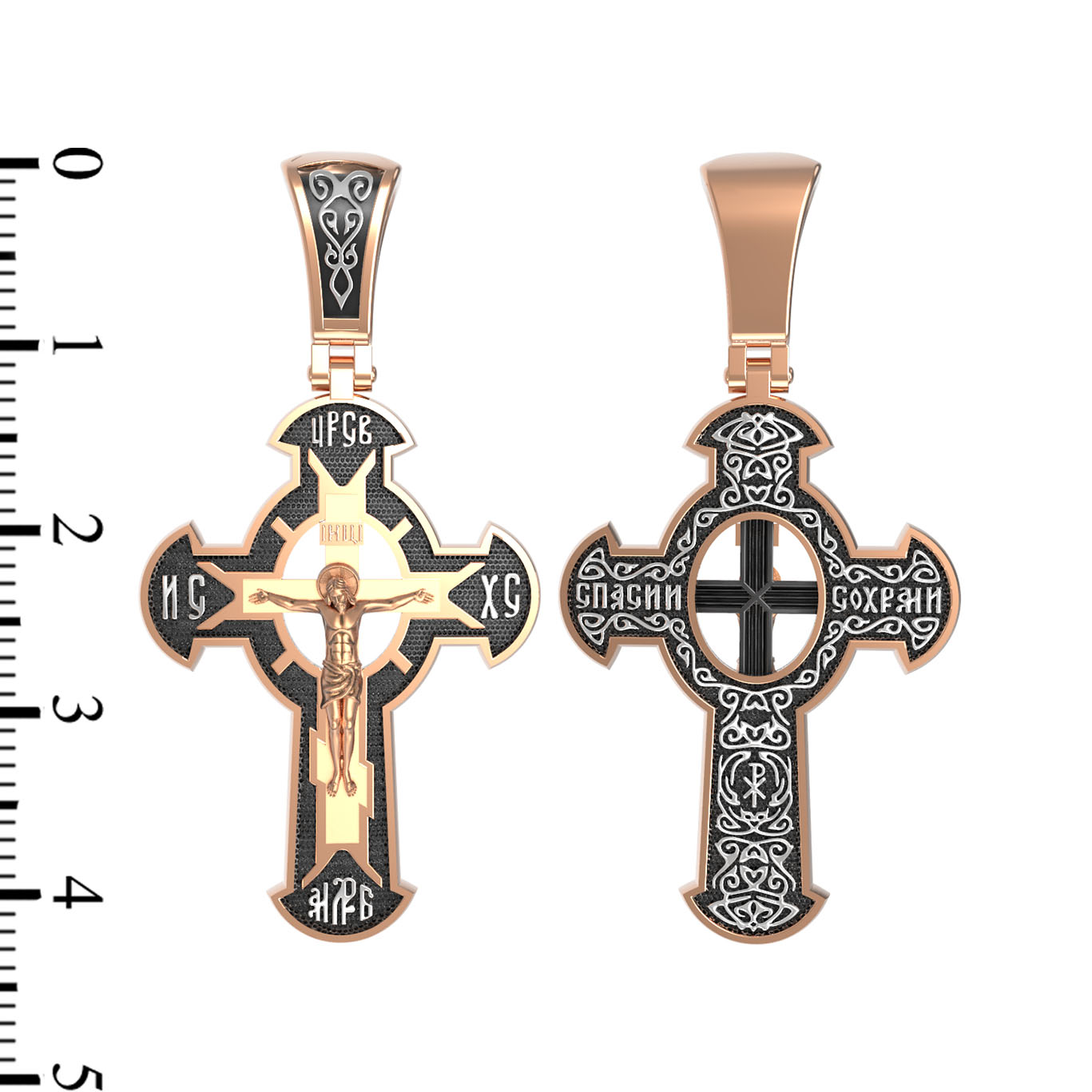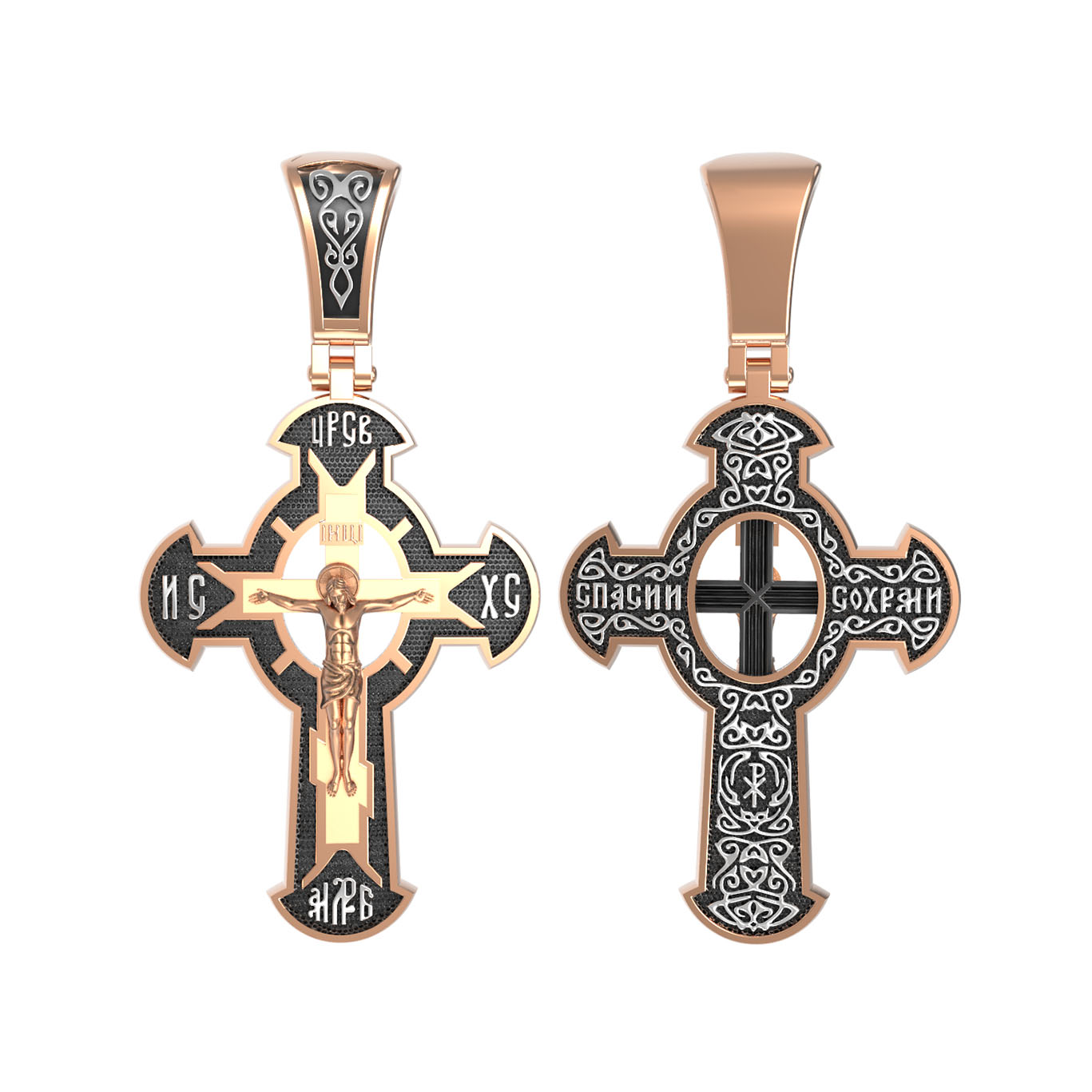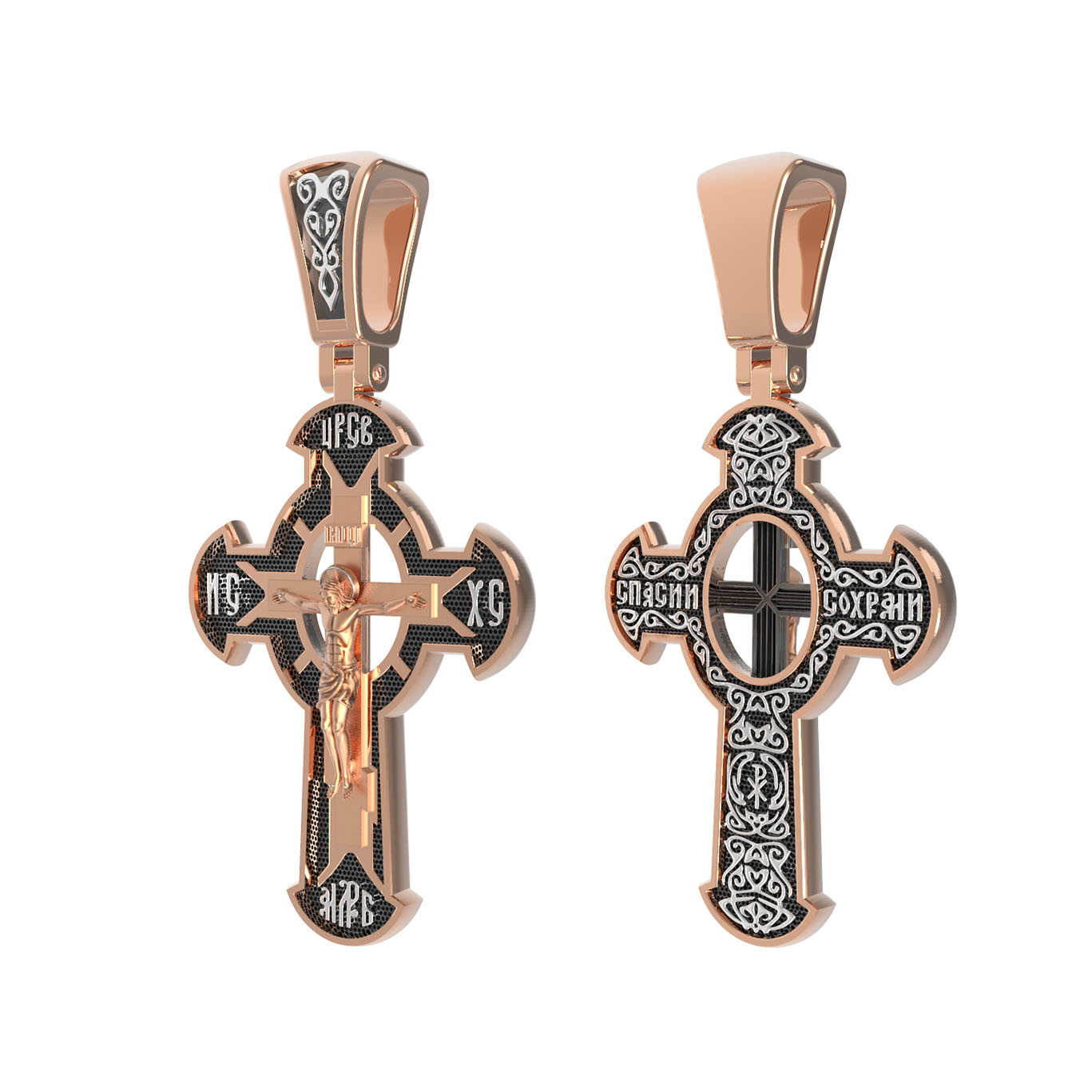 Оборотная сторона креста украшена растительным орнаментом. Помещенный на крест орнамент символизирует жизнедательную силу, животворное тепло креста. В растительный узор, на горизонтальной перекладине, вписано молитвенное славословие: «Спаси и сохрани». Эта надпись означает непрерывную молитву, совершаемую носителем данного креста.