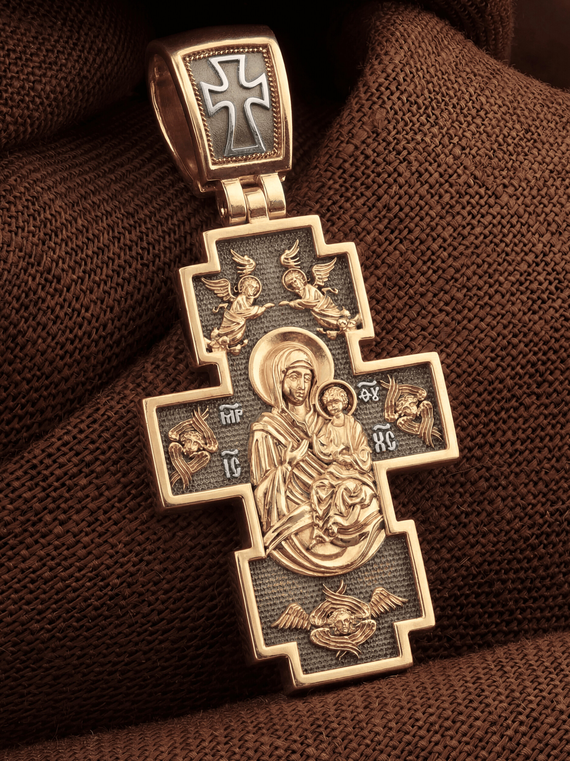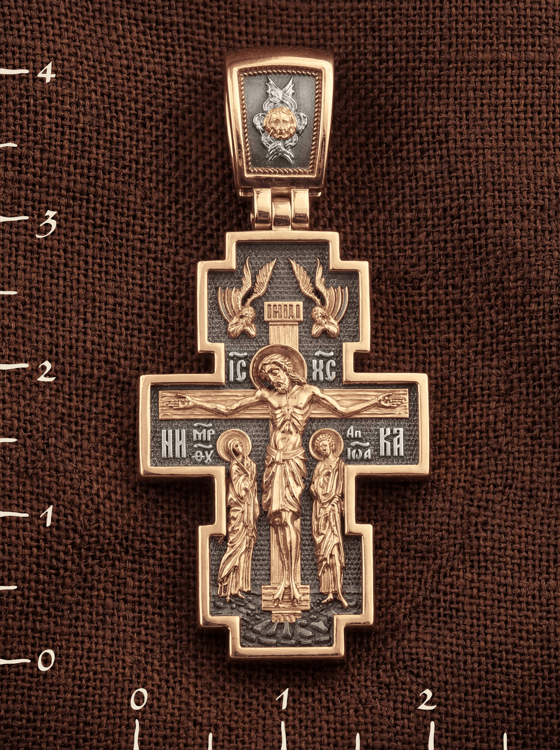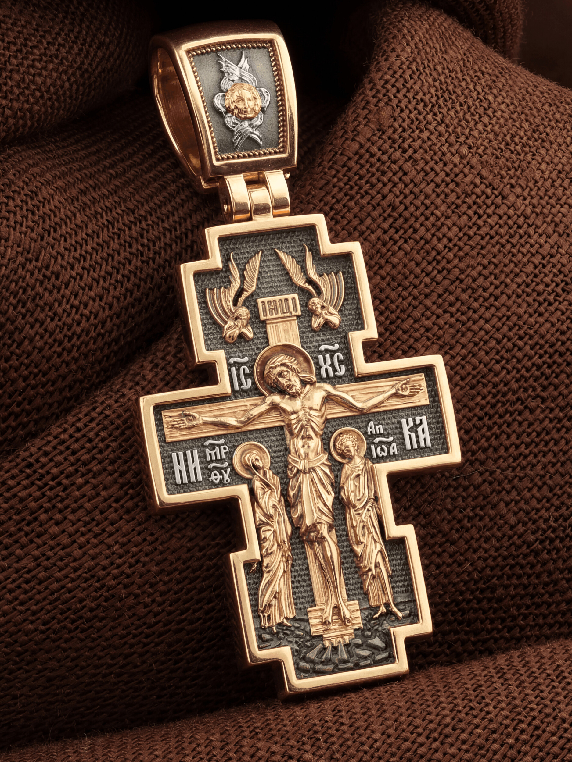 На лицевой стороне креста изображено Распятие Господа Иисуса Христа с предстоящими Ему святыми, которые, по преданию, находились у Креста Господа во время Его казни. Слева — Пресвятая Богородица, справа — апостол Иоанн Богослов. Верхняя перекладина креста символизирует титло — табличку, на которой, согласно Евангелию, было начертано: «Иисус Назорей Царь Иудейский» (IНЦI). Над перекладиной пишется сокращенно имя Спасителя «IC XC» — Иисус Христос, ниже перекладины добавляется: «НИКА» (греч. — Победитель). Возвышение, на котором стоит Крест, символизирует гору Голгофу, на которой произошло Распятие. У подножия Креста изображают прах Адама, обозначенный черепом. На кулонном кольце изображен шестикрылый Серафим — самый приближенный к Господу Ангел.