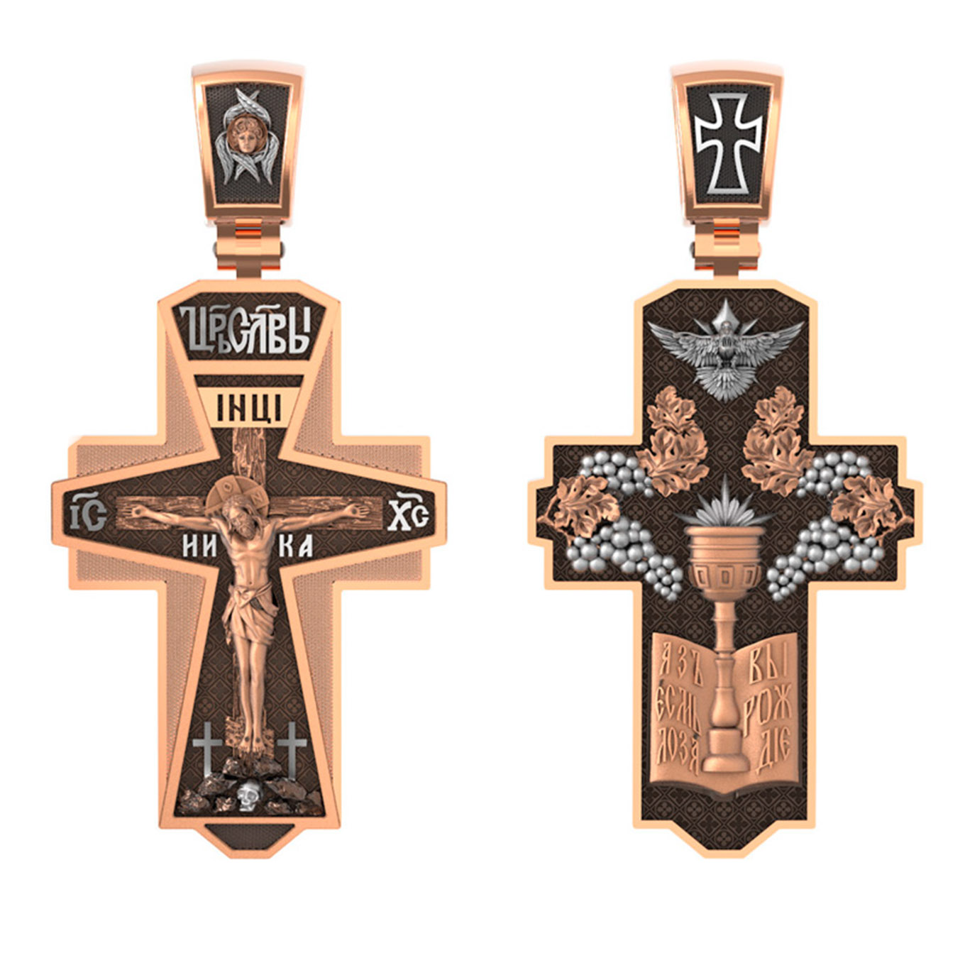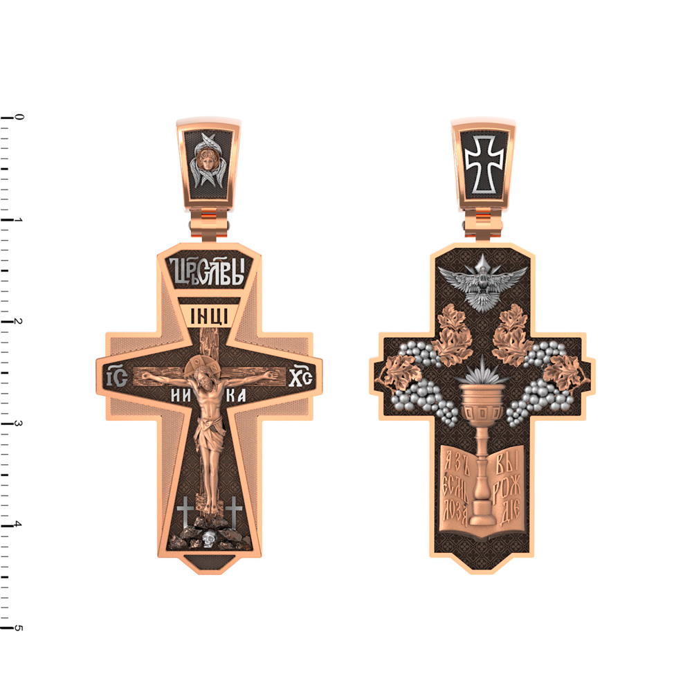 На обороте креста изображение голубя — символ Духа Святого, гроздья винограда — символы церкви и евхаристии, чаша и дискос — символ Таинства Причащения. «Я есмь лоза, — говорил Иисус Христос Своим ученикам, — а вы ветви; кто пребывает во Мне, и Я в нем, тот приносит много плода» (Ин. 15, 5), «Я есмь истинная виноградная лоза, а Отец Мой — виноградарь».