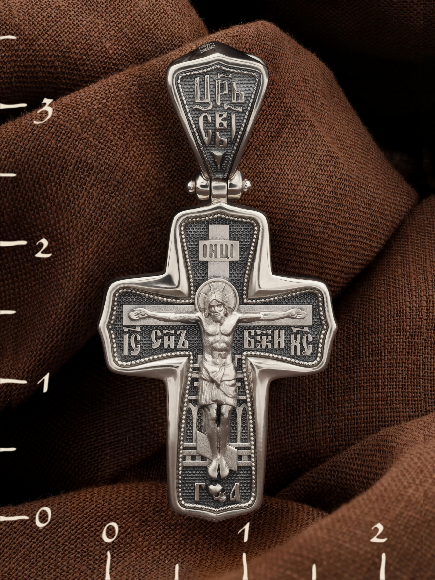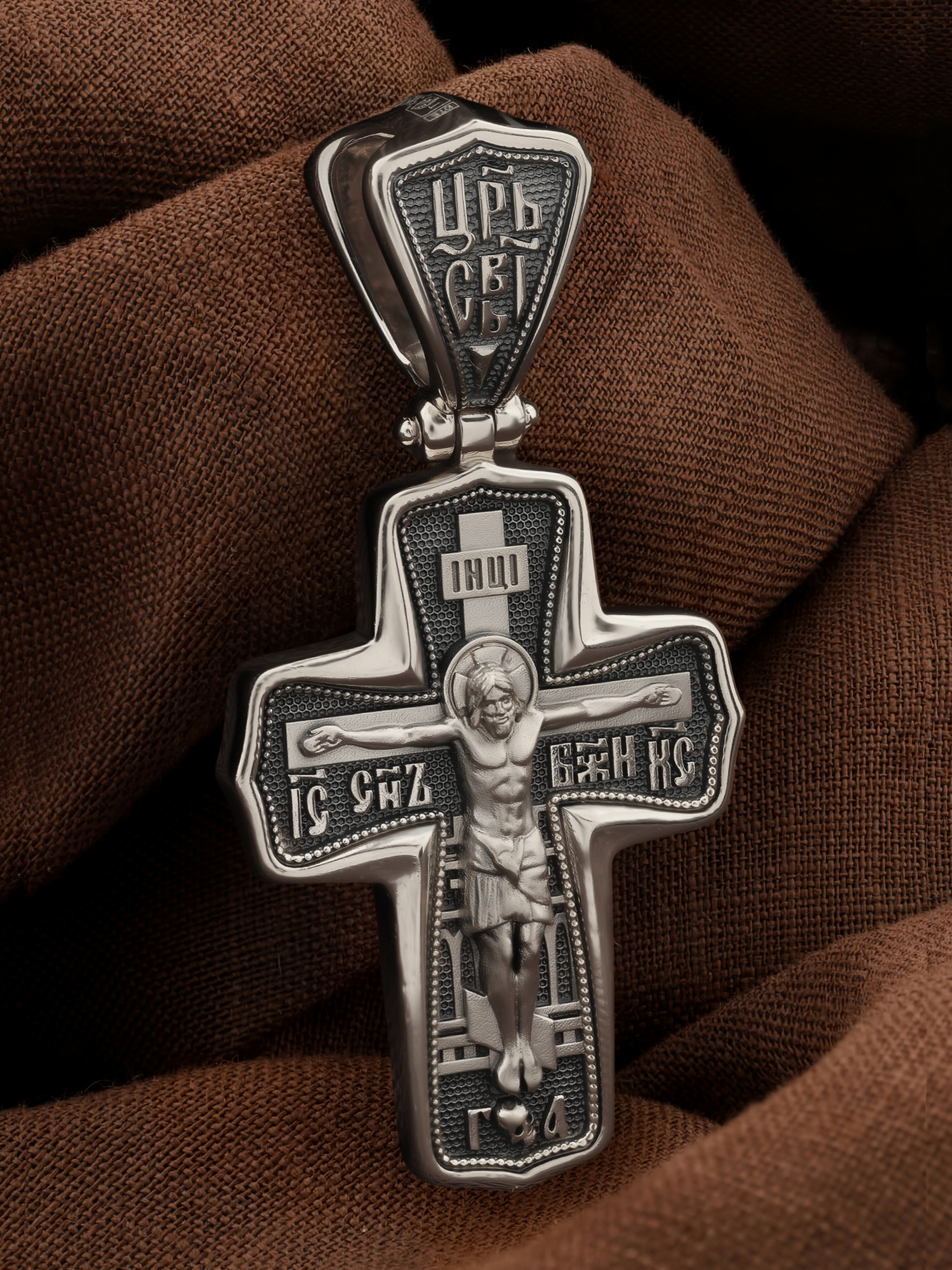 На лицевой стороне креста изображено Распятие Господа и Спасителя нашего Иисуса Христа. Крест- символ спасения и искупления рода человеческого, знамение победы над смертью и адом. Он стал символом восстания из мертвых и обретения вечной жизни в Царствии Иисуса Христа, величайшим символом силы и власти Христовой. Иисус Христос, как искупительная жертва освобождения человечества от власти греха, умер крестной смертью и в третий день воскрес. На верхней табличке, выше головы Иисуса, расположена надпись, составленная Понтием Пилатом — «IНЦI». Она означает «Иисус Назорей, Царь Иудейский». На кулонном кольце помещена надпись «Царь Славы». Надпись «IС» « ХС» означает Иисус Христос и помещается на разных сторонах поперечной перекладины креста. Рядом расположена надпись «Сын Божий». За крестом высится Иерусалимская стена. Ниже подножия креста различается череп и надпись «Г.А» — это глава Адамова. На православном кресте Христос не умирает, а свободно простирает руки, ладони Иисуса открыты, будто он хочет обнять все человечество, даря им свою любовь и открывая путь к вечной жизни.