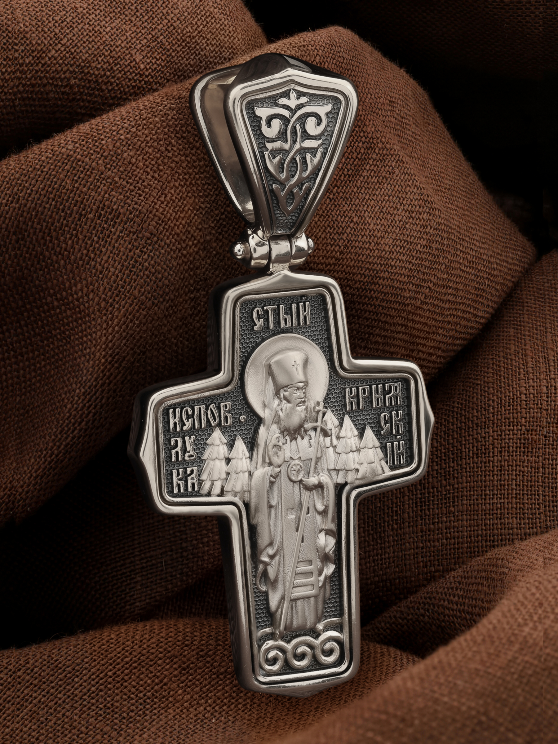 На оборотной стороне Креста помещен образ святителя Луки (Войно-Ясенецкого), архиепископа Симферопольского и Крымского, исповедника (1877–1961). Архиепископ Лука — русский святитель, исповедник, духовный писатель, доктор богословия, а также выдающийся ученый, автор трудов по анестезиологии, профессор хирургии, доктор медицинских наук, лауреат Сталинской премии. Он исповедовал веру Христову в гонениях, тюрьмах, лагерях и ссылке, пережил поношения и пытки, но остался верен Господу. Привел к православной вере тысячи и тысячи людей. Его почитание растет во всем православном мире. Неисчислимо количество свидетельств о чудесной помощи по молитвам к Святителю Луке. Архиепископ Лука советовал: «Главное в жизни — всегда делать людям добро. Если не можешь делать для людей добро большое, постарайся совершить хотя бы малое».