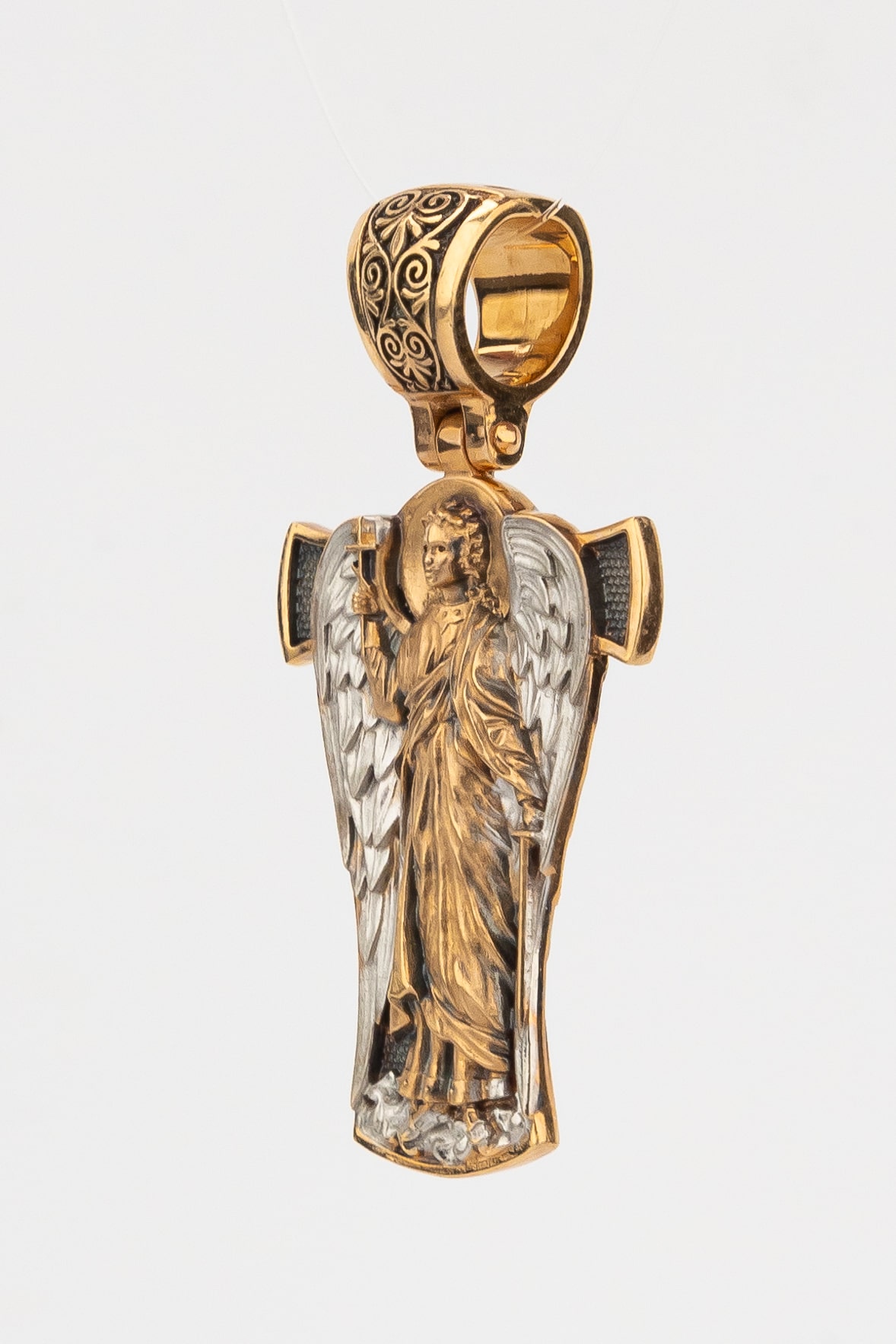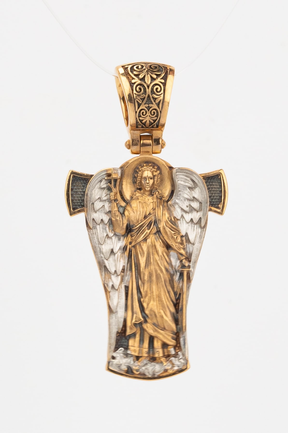 Основой композиции является изображение Святого Ангела-Хранителя держащего в правой руке крест, а в левой — мечь. Крест является символом жертвенной любви всеблагого Бога к падшим людям, всепобеждающим духовным оружием христиан, основанием и средоточием церковной жизни. Господь сказал: «кто хочет идти за Мною, отвергнись себя, и возьми крест свой, и следуй за Мною». (Мк. 8: 34). Ангел-Хранитель — это Ангел приставляемый Богом к человеку при крещении для охраны и помощи в добрых делах. Он невидимо находится при человеке на протяжении всей его жизни, если человек сохраняет в себе любовь к Богу и истинную веру перед Ним. Ангел-Xранитель делают для нас все, что служит к истинному нашему благу и спасению. Невидимо пребывая при нас постоянно, он, руководствуя нас ко спасению, не только по нашему желанию таинственно наставляет нас на все доброе и полезное, не только возносит наши молитвы к Богу, но еще и сам от себя охраняют и защищают нас от врагов видимых и невидимых и ходатайствует за нас пред Богом. Ангел-Хранитель так любит нас, как никто на земле любить не может. Одного лишь каждому из нас он желает — спасения души; к этому он направляет все свои заботы. И если видит нас также заботящимися о спасении, радуется, если же видит нас пребывающими в нерадении о душе своей, скорбит. Но и самый великий грешник может примириться со своим Ангелом-Хранителем посредством искреннего раскаяния в грехах и оставления их навсегда. В таком случае, по слову Писания, великая радость бывает для всех ангелов на небесах (Лк. 15:10).